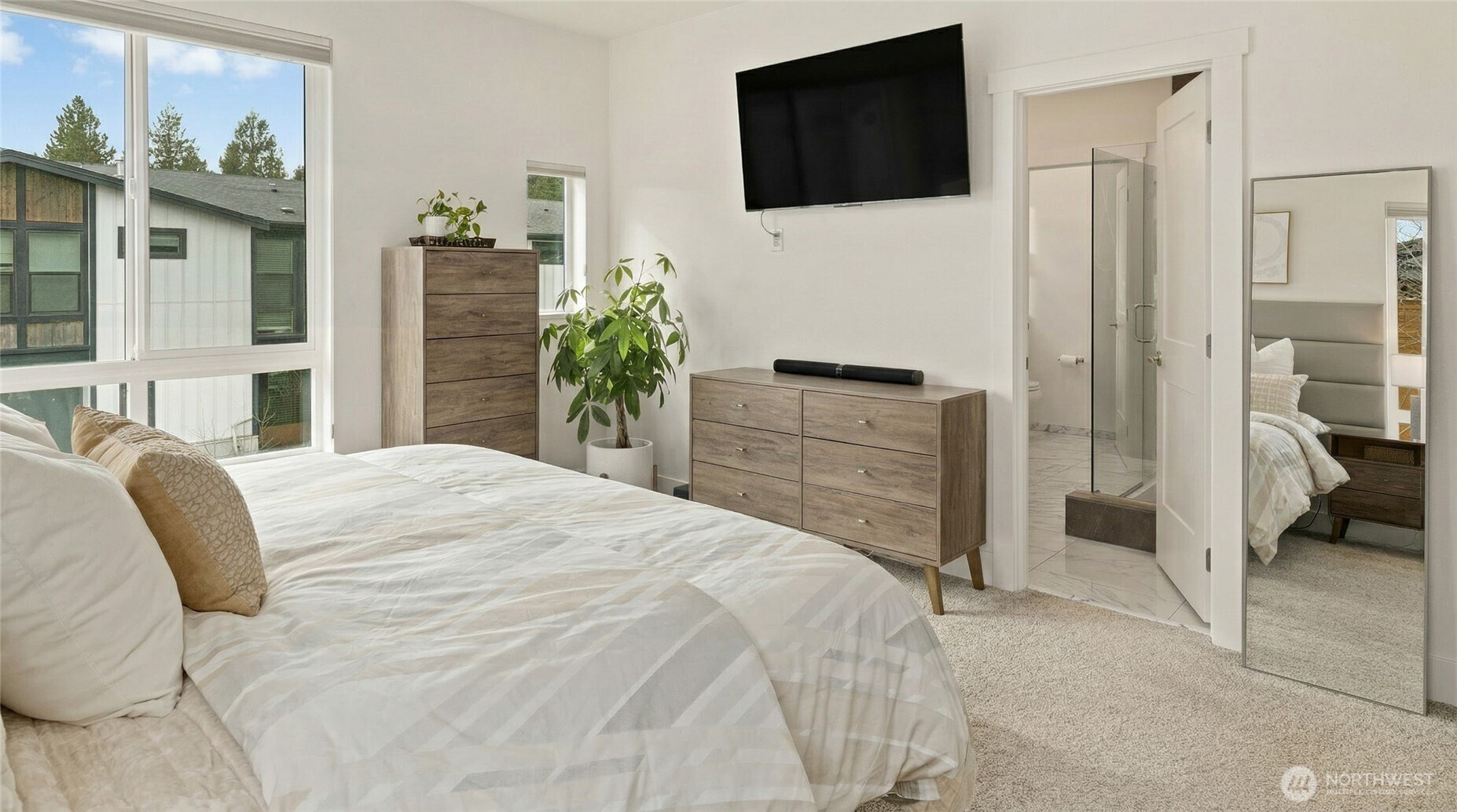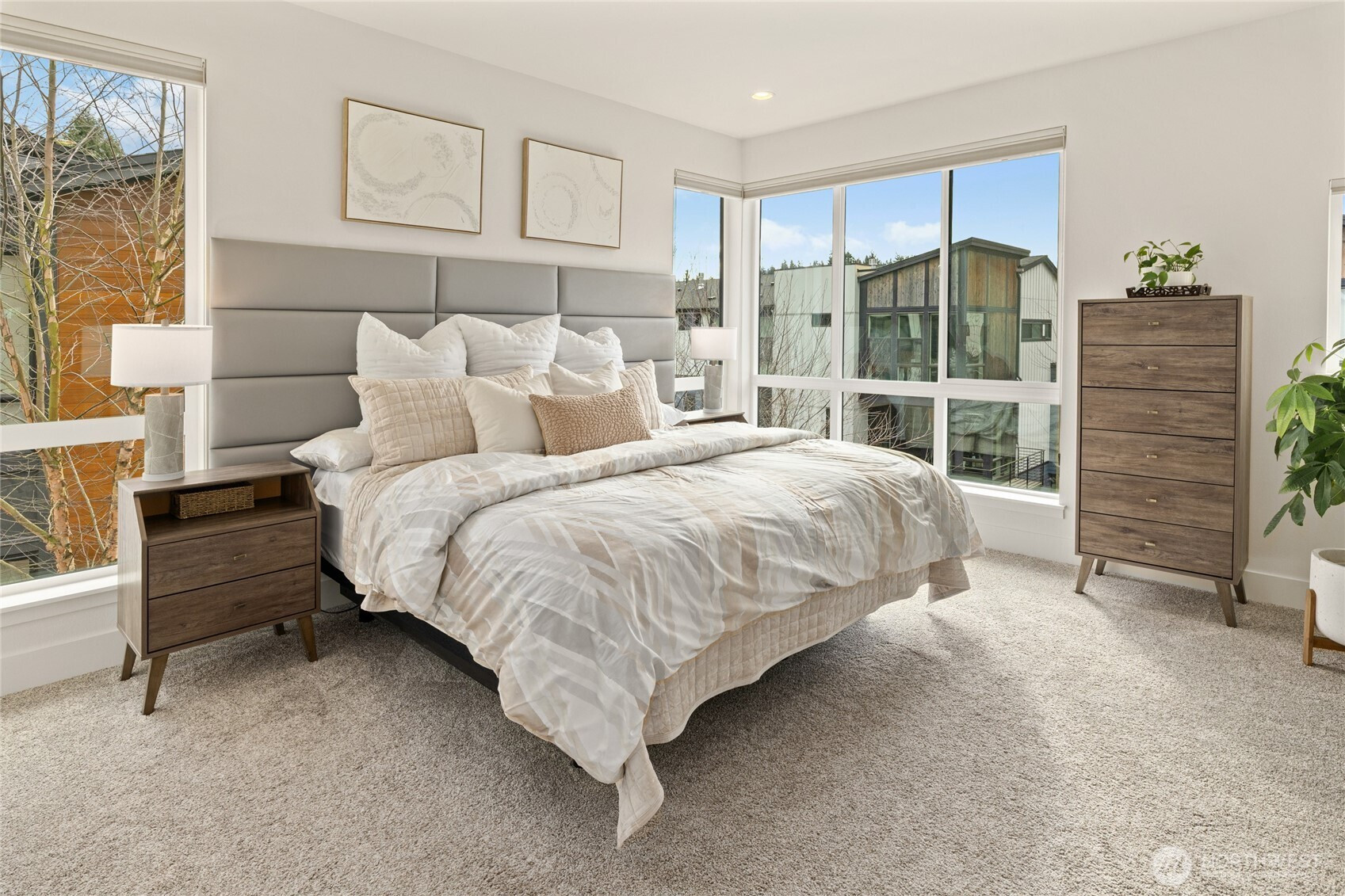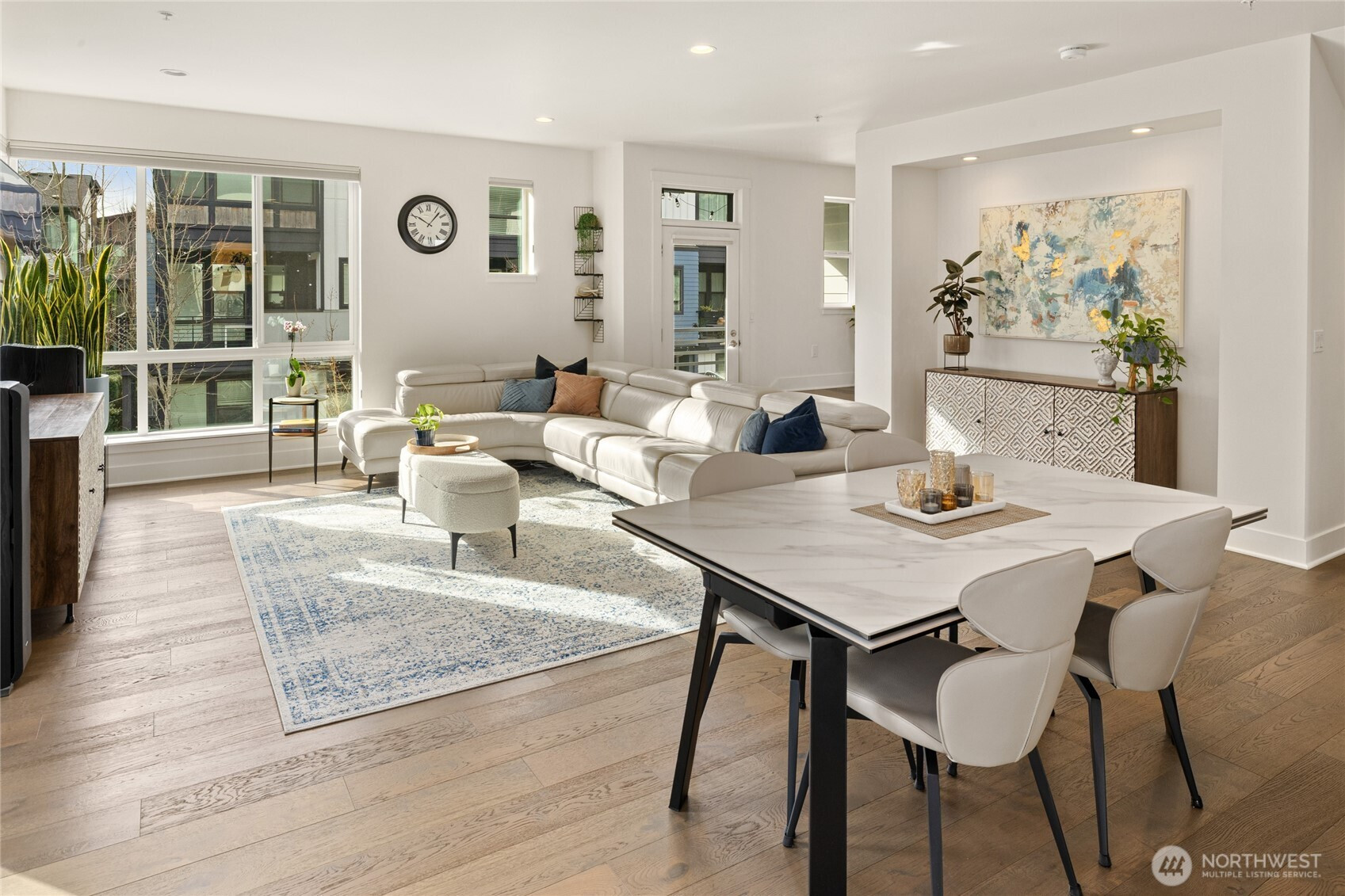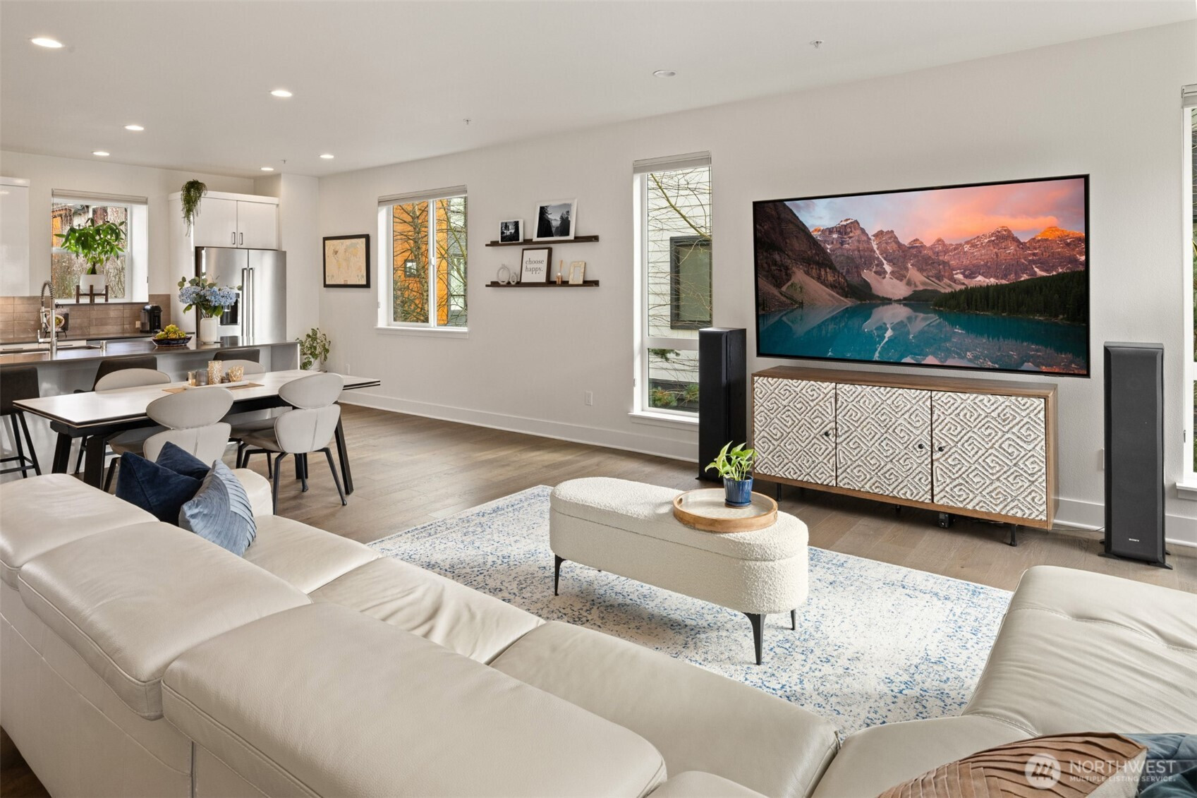 A home warranty and buyer credits are offered with this modern four-bedroom corner townhome at The Landing in downtown Bothell. Privately situated on a quiet street within a vibrant, walkable community, this impeccably maintained residence is cohesively designed and completely turnkey. A welcoming entry on the first floor offers access to a private guest bedroom suite complete with a large closet/storage and full bath. The second-level open-concept main floor is filled with natural light through dramatic floor-to-ceiling windows and features a gourmet chef’s kitchen with oversized quartz island, built-in beverage cooler, gas range, ample counter space, and stainless steel KitchenAid appliances. Step out to the covered deck for year-round BBQs or to simply relax and unwind. The third floor retreat features three spacious and bright bedrooms, including a luxurious primary with generous walk-in closet and spa-inspired ensuite with motion sensor under-cabinet lighting and private water closet. Smart-home features include a tech panel, whole-home network cabling, smart locks and two-car smart garage with EV charging. Custom top-down/bottom-up blinds throughout, soft-close cabinets, hypoallergenic carpet and 9ft ceilings make for comfortable living. Several guest parking spaces are reserved for the community in addition to street parking. Steps to Downtown Bothell restaurants, shopping, parks and transit. Northshore School District.
