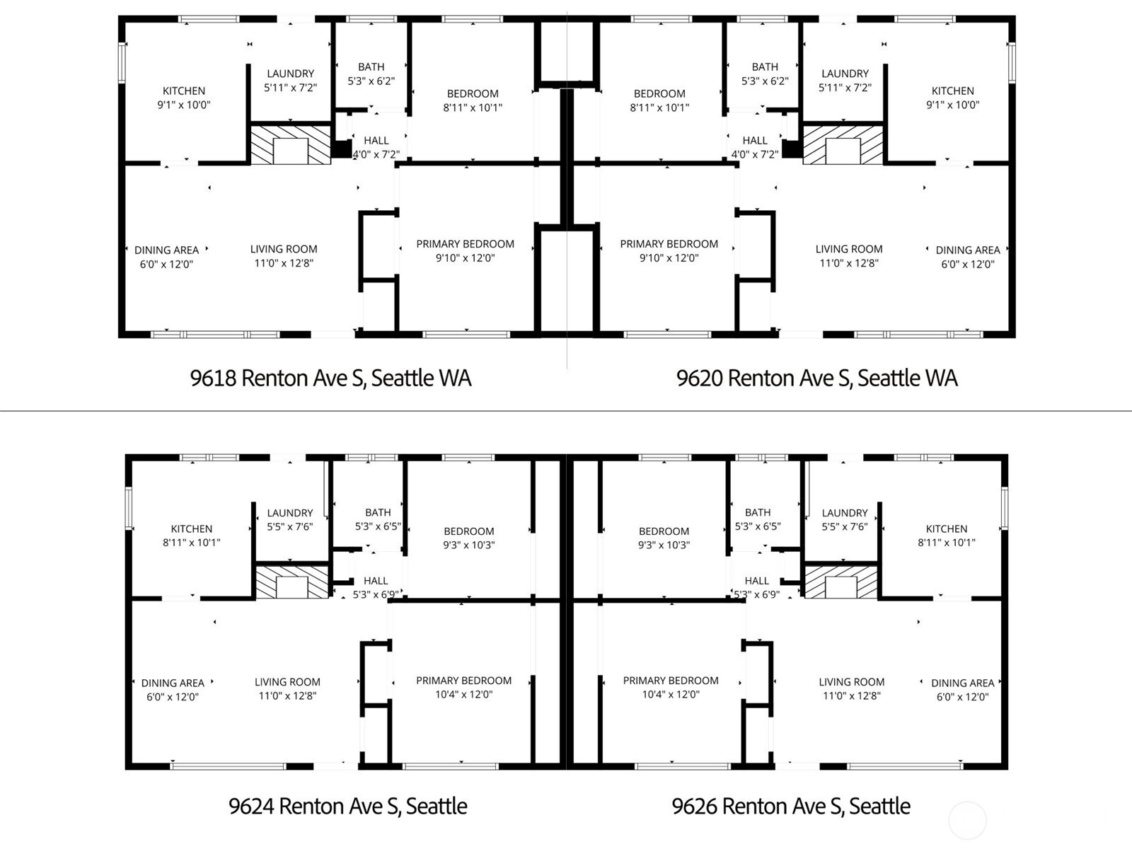 Rare Investment Opportunity: 4-Unit Condo Portfolio in 98118. This offering includes four legally separate 2-bed/1-bath condominium units (9618, 9620, 9624, & 9626 Renton Ave S) being sold together as a single 4-unit investment package. Unlike a traditional 4-plex, these units have separate tax IDs and individual lots. Each ~770 sq. ft. unit offers a functional floor plan primed for value-add upgrades. Significant upside potential through cosmetic refreshes: modern flooring, updated kitchens, and in-unit laundry can substantially increase market rents in this high-demand pocket of South Seattle. The property features established yard spaces and a functional layout that appeals to long-term tenants. Strategically located near transit, light rail, and the vibrant Columbia City core.