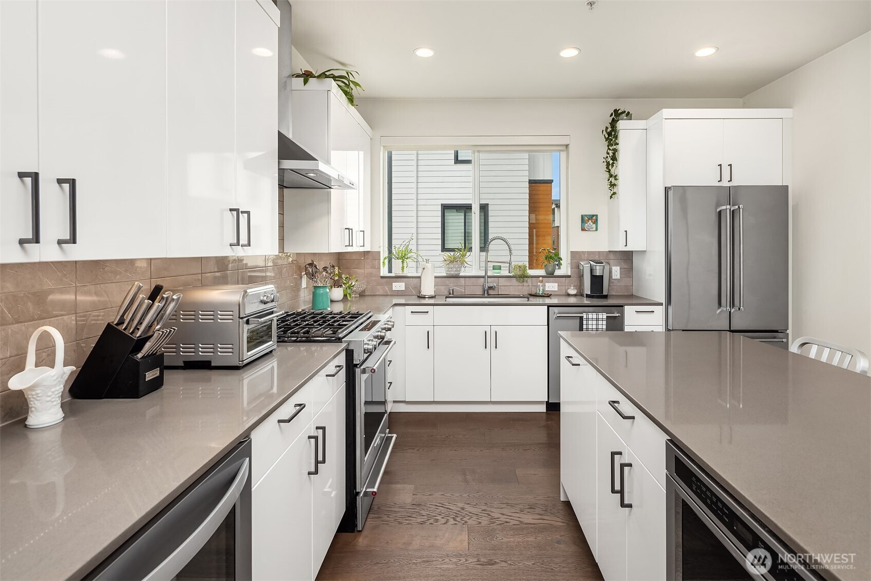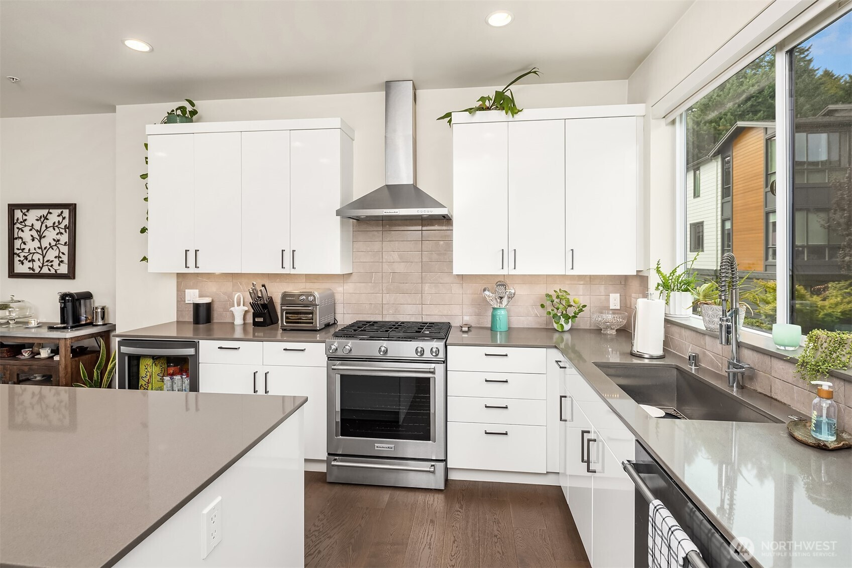 (503) 893-8874Spacious three-level townhome located in the highly sought-after Northshore School District, offering 1,537 square feet with 3 bedrooms and 3 bathrooms. South-facing, floor-to-ceiling windows fill the home with natural light, highlighting the open and flexible floor plan. The main level includes a convenient 3/4 bath, while the lower level offers a private guest bedroom or home office. The kitchen is thoughtfully designed with slab quartz countertops, an oversized island, stainless steel appliances, under-cabinet lighting, and a built-in beverage fridge. Hardwood floors, wrought-iron railings, split air conditioning units, and an EV-charger-equipped two-car garage enhance both comfort and functionality. Enjoy a private balcony and a prime Bothell location with easy access to downtown, shopping, dining, and transit.