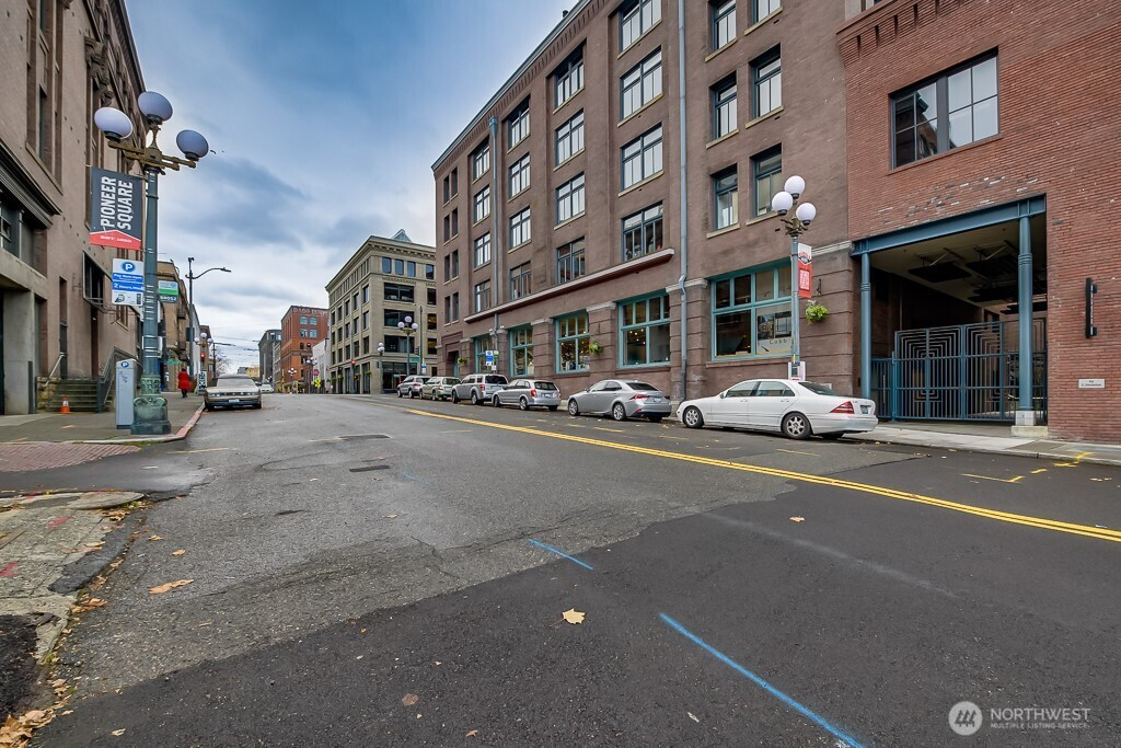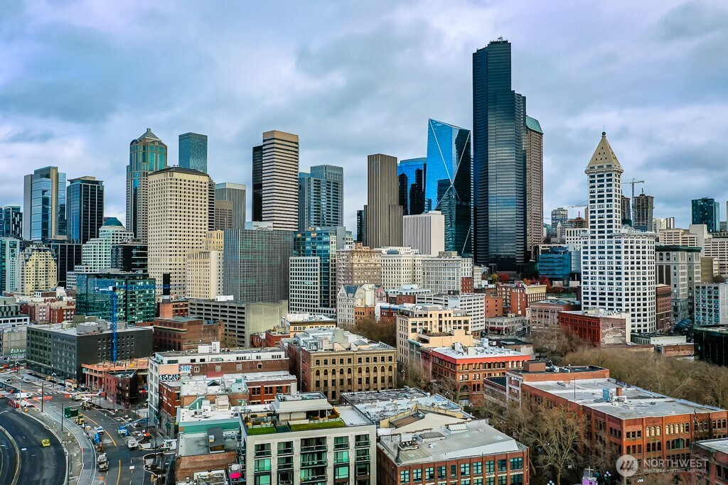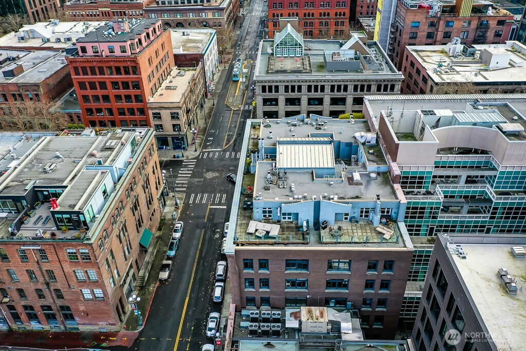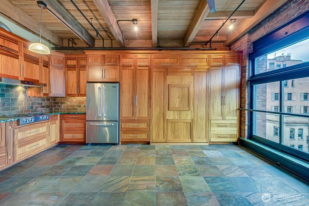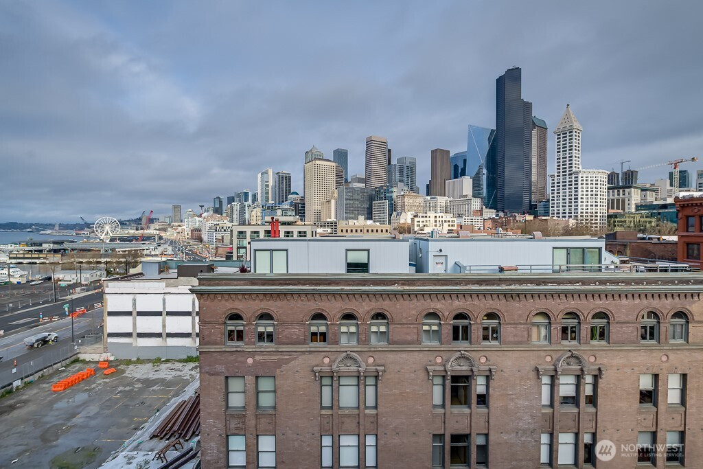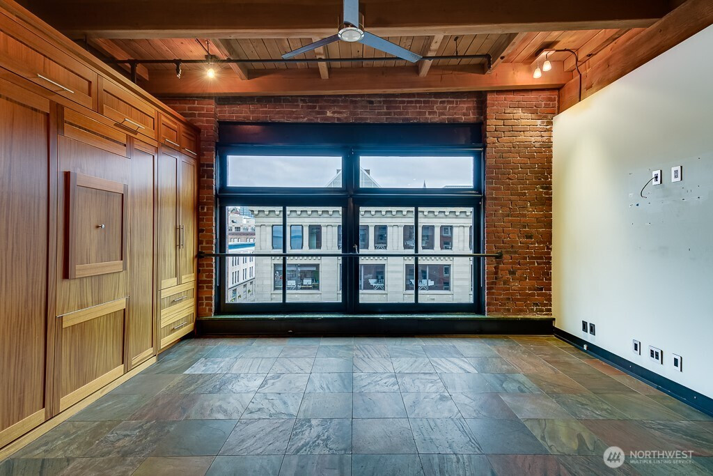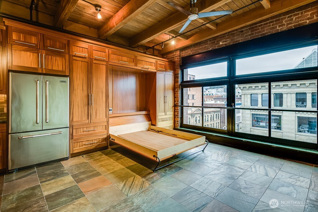 Perfectly positioned near premier galleries, iconic stadiums, and acclaimed restaurants, with a very fast elevator to the 5th floor, this home is a refined showpiece in Seattle’s most sought-after urban district. A stunning top-floor condominium in the heart of historic Pioneer Square, in a very secure building that also boasts a private parking space in a secure garage, while offering sweeping city views and an exceptional, fully reimagined pied-à -terre. Over $300,000 has been invested in premium, high-end craftsmanship, thoughtfully designed to maximize every inch of space. The residence features gorgeous granite countertops, rare mahogany cabinetry, and a spa-inspired steam shower. A hidden Murphy bed enhances functionality, while custom stainless-steel appliances—including a Gaggenau Lift Oven, gas cooktop, and cabinet-integrated dishwasher—deliver both style and performance. Vaulted ceilings showcase reclaimed old-growth beams from Bainbridge Island, complemented by heated slate flooring throughout. Additional highlights include extensive concealed storage, a built-in wall-mounted tank toilet, floating sink, and in-unit washer and dryer. Ideally located just blocks from stadiums, renowned dining, cafés, and vibrant nightlife, with easy access to mass transit, ferries, and major highways. Situated near the revitalized Seattle waterfront, large picture windows that open for that perfect sea breeze, & having a private secure downtown covered parking garage is ideal.
