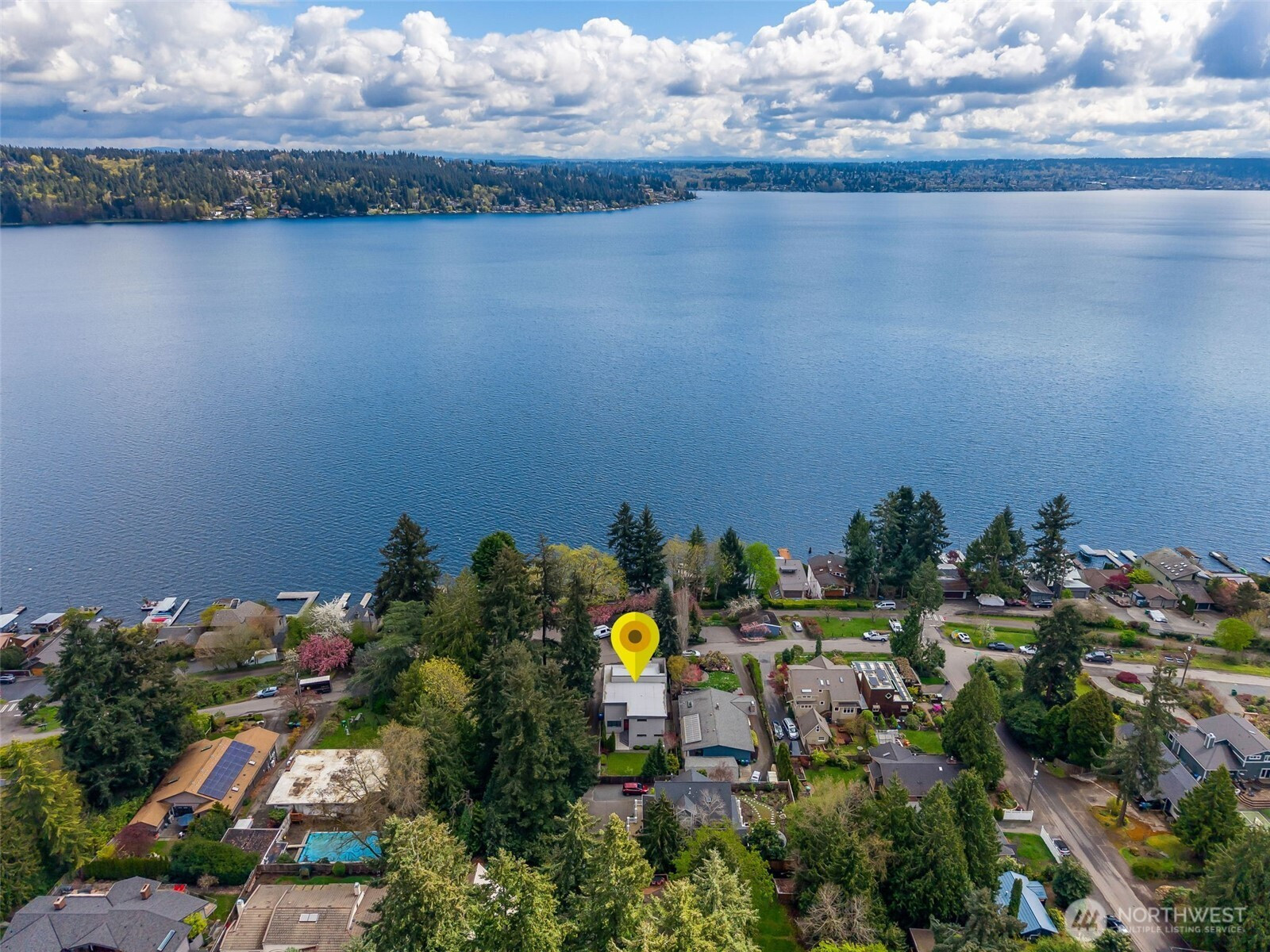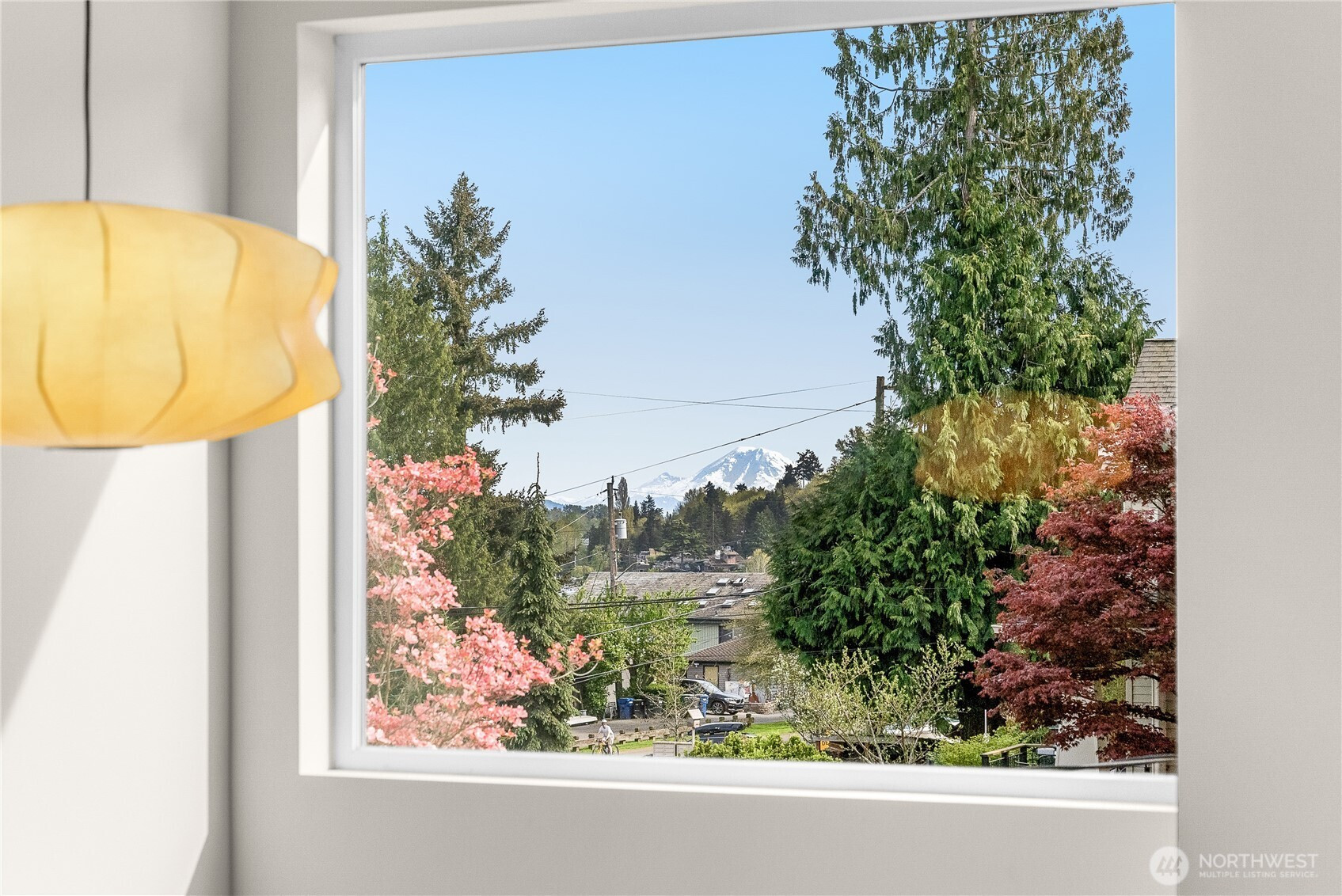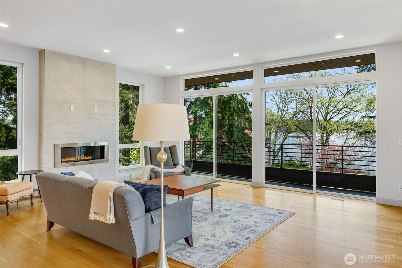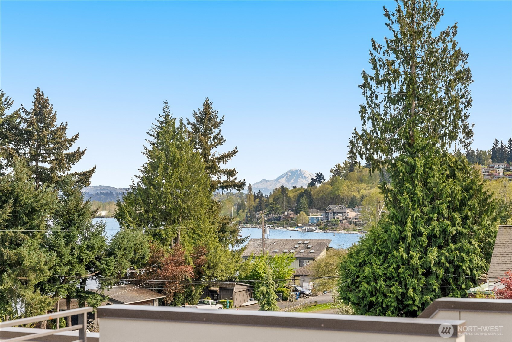 Nestled within this serene Matthews Beach enclave, this striking modern residence offers a refined balance of design and livability. With lake and Mt. Rainier views, the home unfolds across two levels with a seamless connection to its natural surroundings. The lower level is quietly private, anchored by a spa-inspired primary suite, with direct access to the patio for true respite. Three additional bedrooms and a full bath complete the lower level. The main level features soaring ceilings, a thoughtfully designed chef’s kitchen and a dedicated dining area. The open living room, with warm wood floors and a custom gas fireplace, enjoys views from every angle. A dedicated media lounge—ideal for both entertaining and everyday living—includes a wet bar, wine fridge and storage. Expansive walls of glass invite soft, shifting light throughout, and open to a covered balcony with room to relax and access to a roof top deck. 2 car attached garage plus additional off-street parking. Just steps from the Burke-Gilman Trail, right across the street, and moments from Matthews Beach Park. Easy access to Magnuson, UVillage, UW and more, this home offers a rare combination of tranquility, design, and proximity. PNW living at its finest.