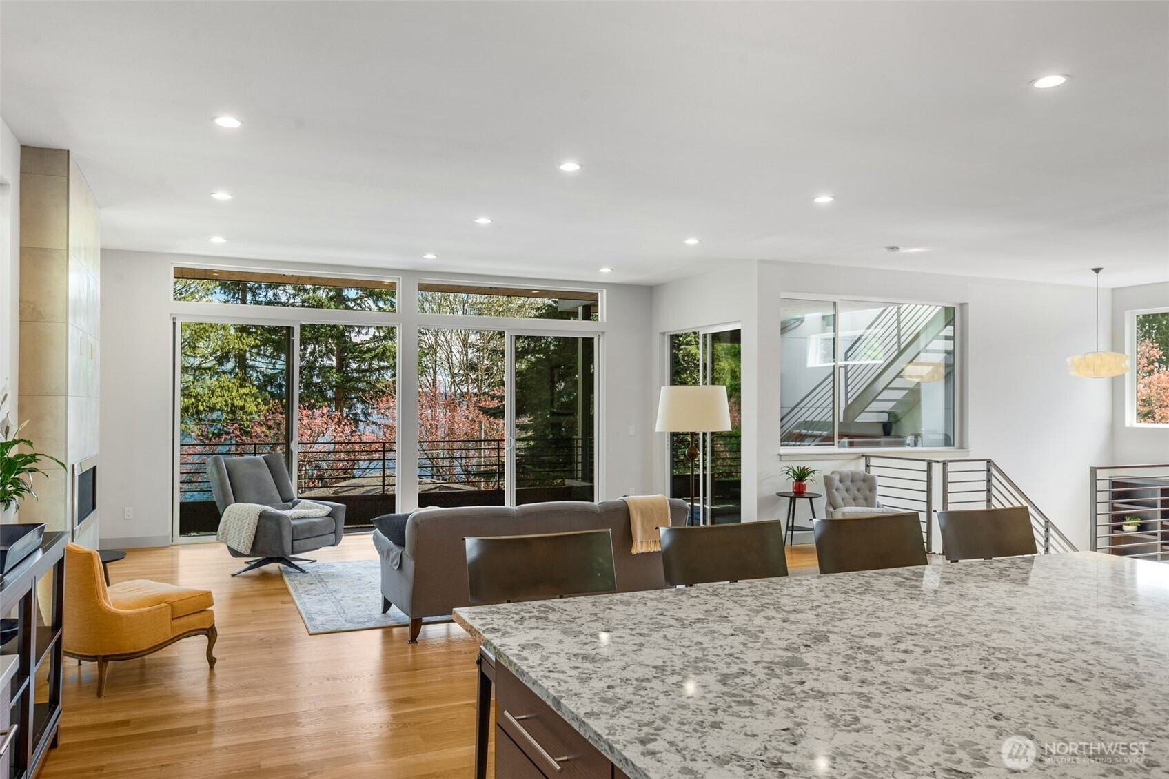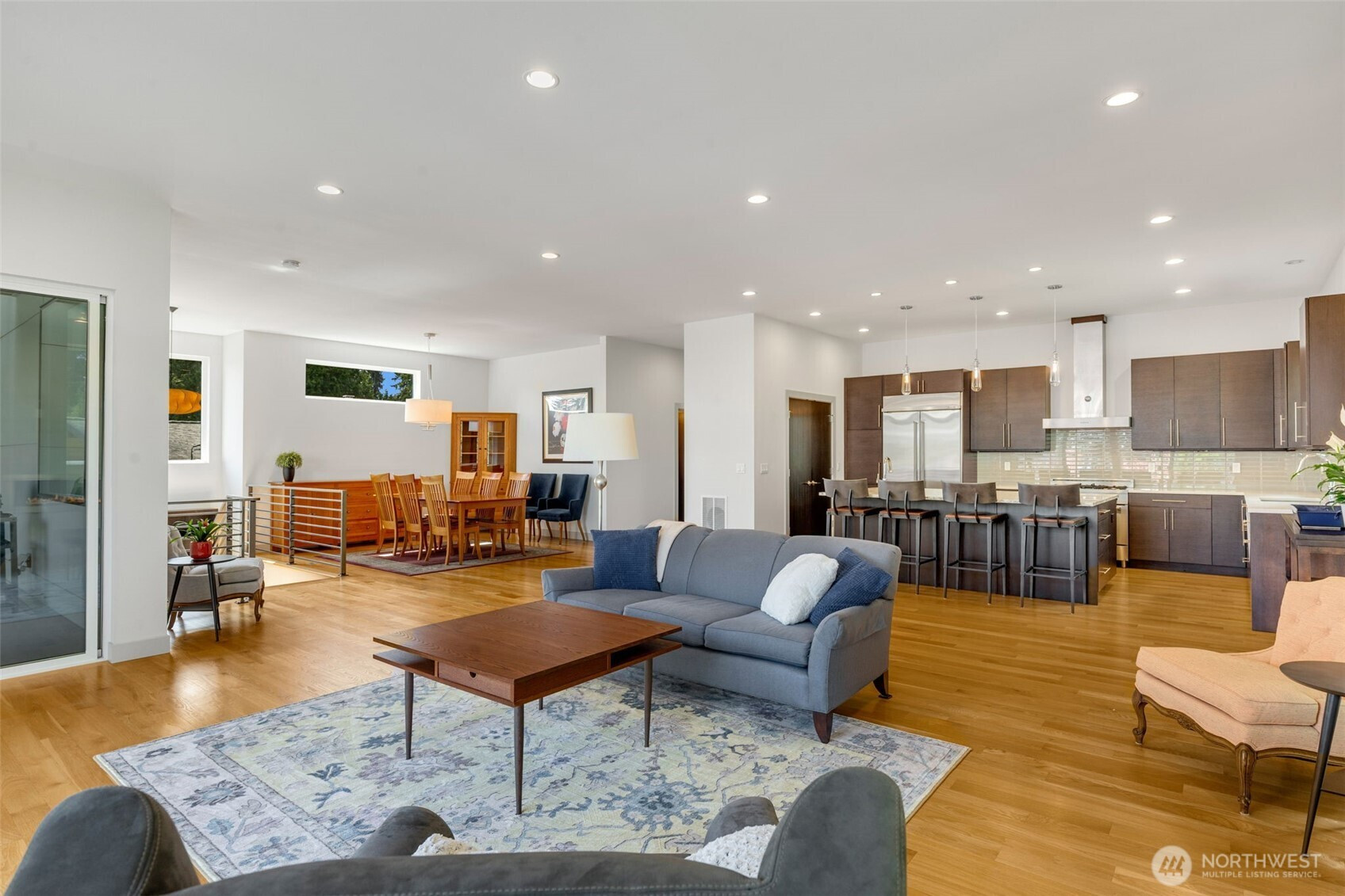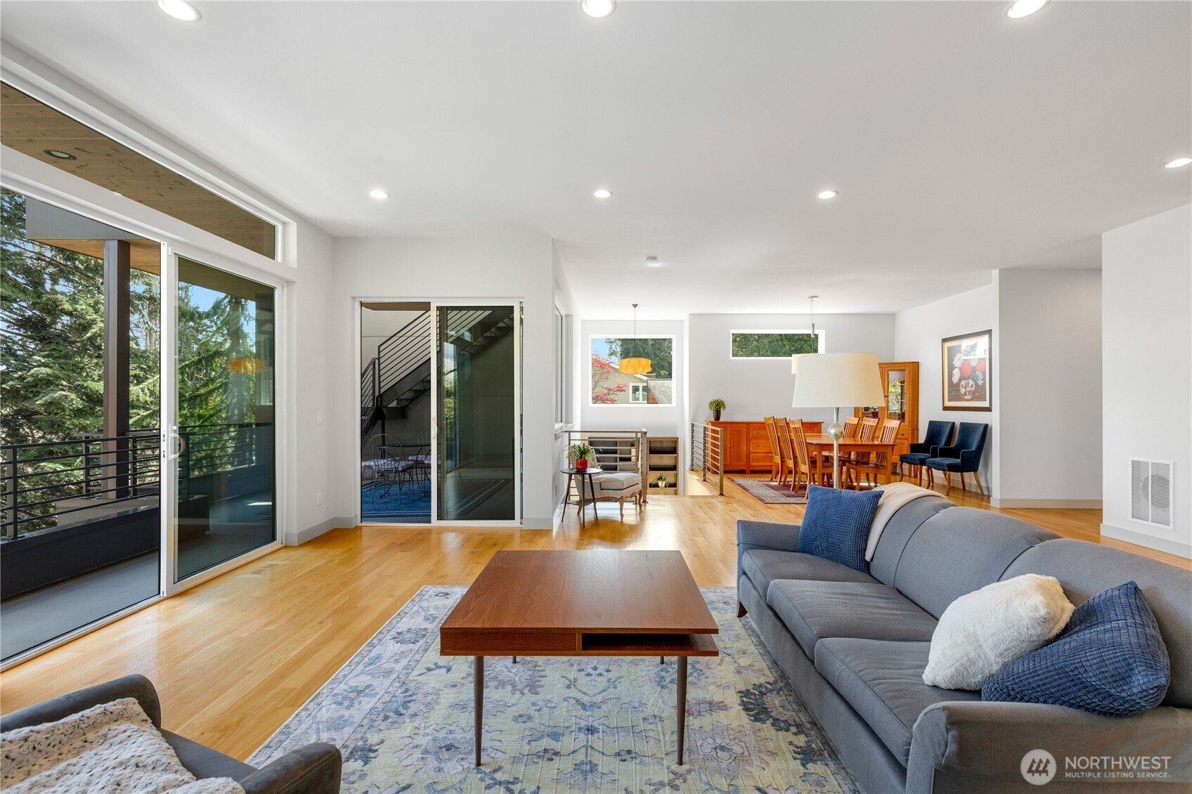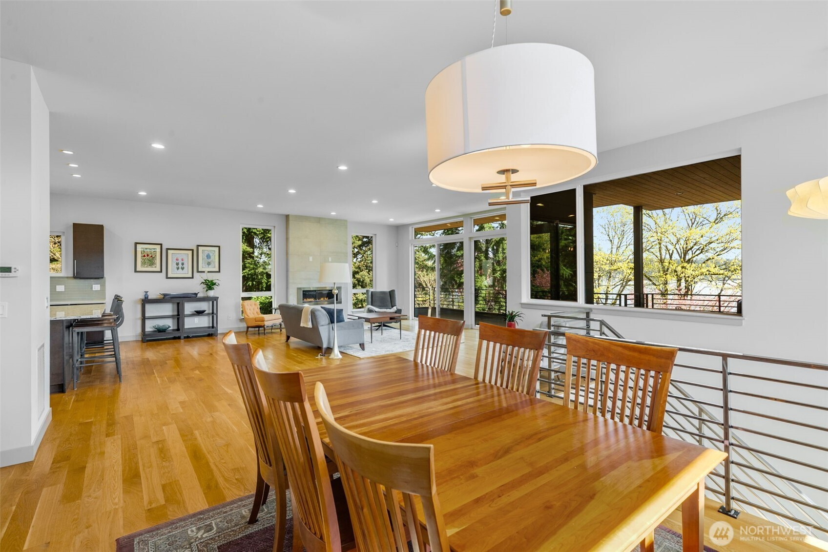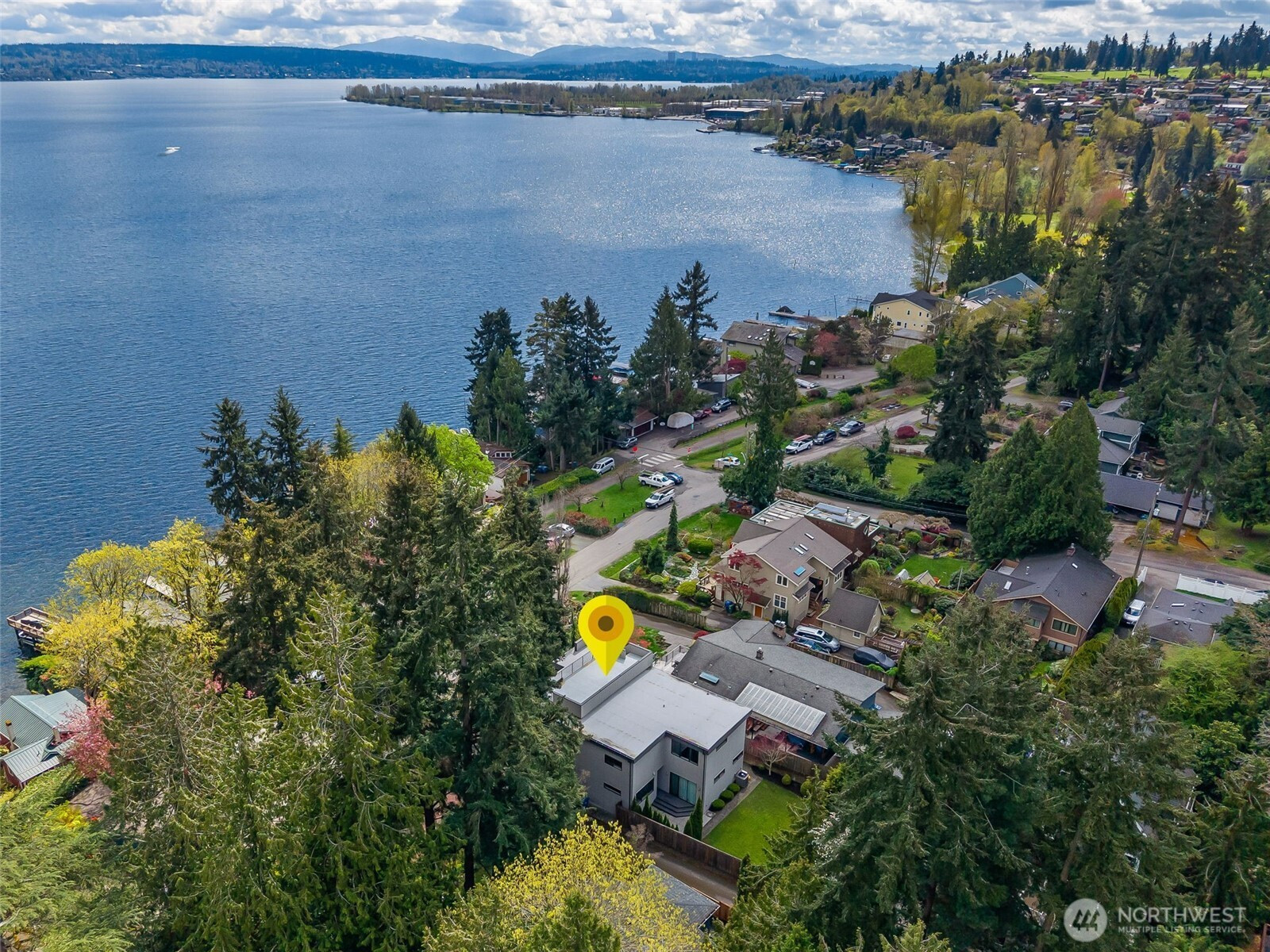 Nestled within this serene Matthews Beach enclave, this striking modern residence offers a refined balance of design and livability. With lake and Mt. Rainier views, the home unfolds across two levels with a seamless connection to its natural surroundings. The lower level is quietly private, anchored by a spa-inspired primary suite, with direct access to the patio for true respite. Three additional bedrooms and a full bath complete the lower level. The main level features soaring ceilings, a thoughtfully designed chef’s kitchen and a dedicated dining area. The open living room, with warm wood floors and a custom gas fireplace, enjoys views from every angle. A dedicated media lounge—ideal for both entertaining and everyday living—includes a wet bar, wine fridge and storage. Expansive walls of glass invite soft, shifting light throughout, and open to a covered balcony with room to relax and access to a roof top deck. 2 car attached garage plus additional off-street parking. Just steps from the Burke-Gilman Trail, right across the street, and moments from Matthews Beach Park. Easy access to Magnuson, UVillage, UW and more, this home offers a rare combination of tranquility, design, and proximity. PNW living at its finest.