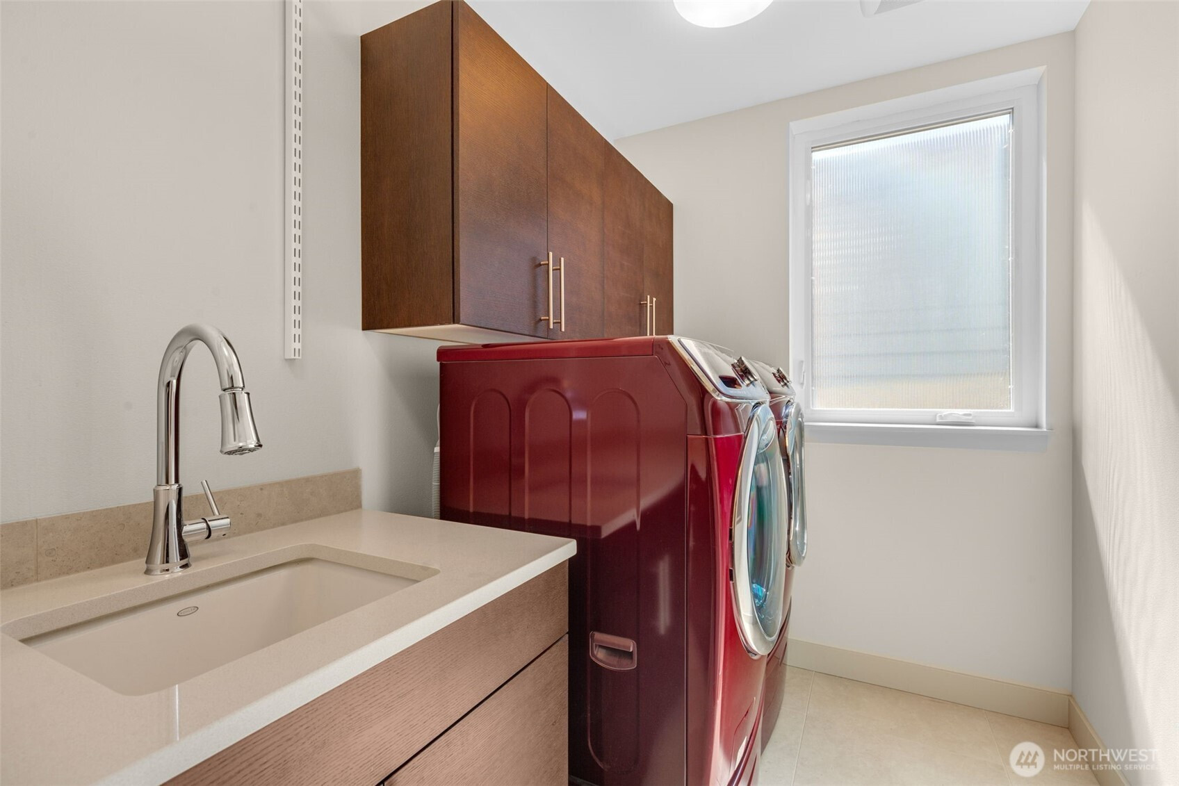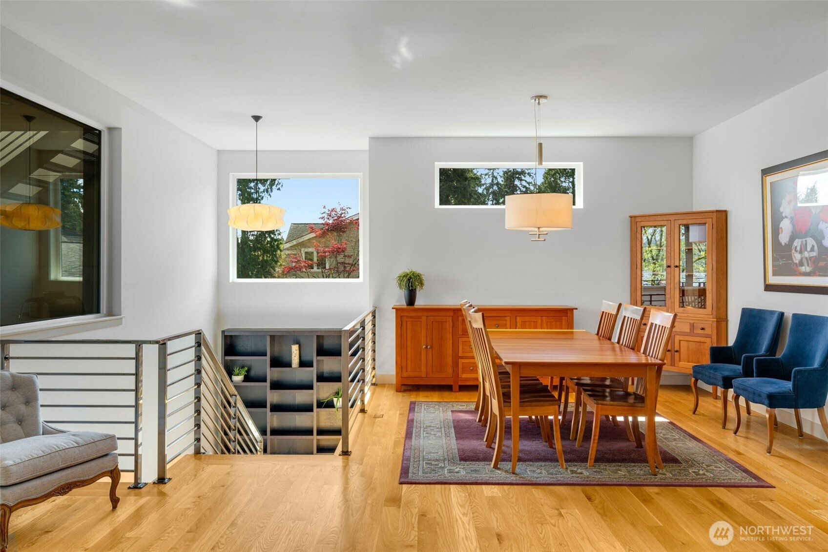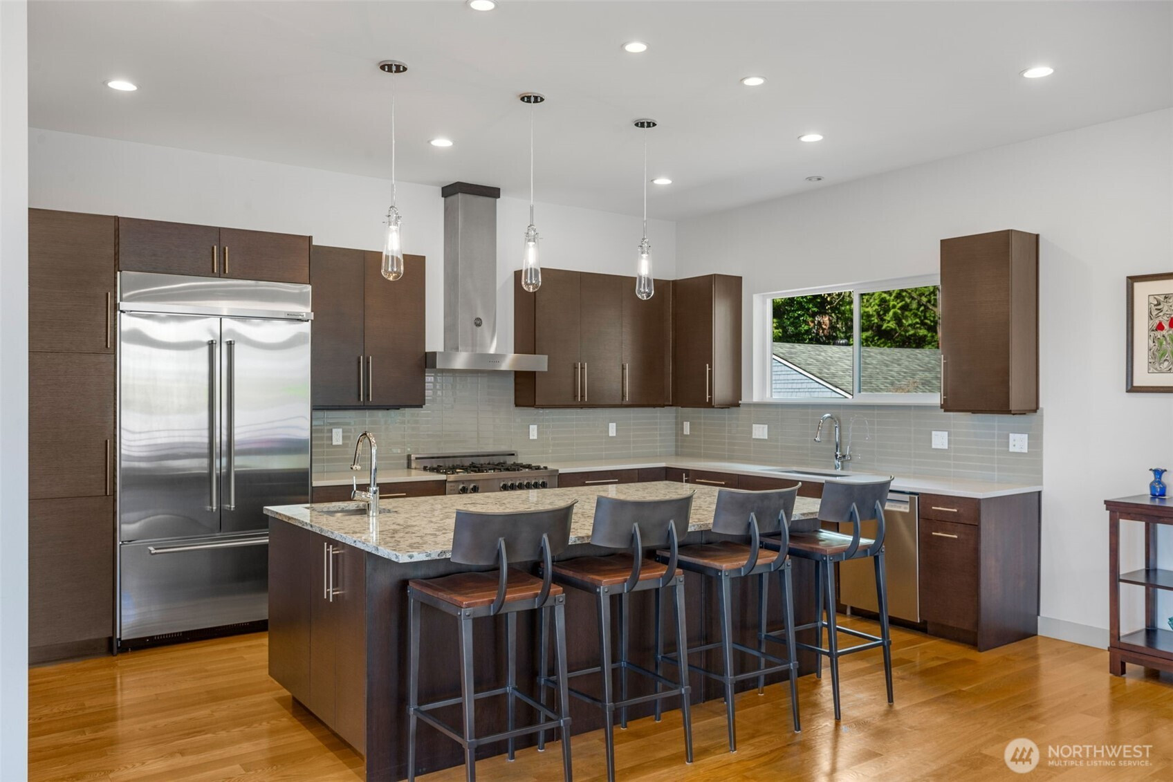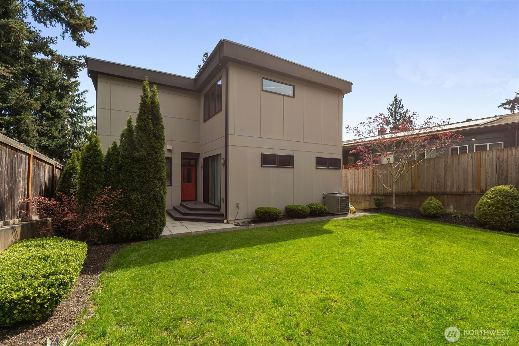 Nestled within this serene Matthews Beach enclave, this striking modern residence offers a refined balance of design and livability. With lake and Mt. Rainier views, the home unfolds across two levels with a seamless connection to its natural surroundings. The lower level is quietly private, anchored by a spa-inspired primary suite, with direct access to the patio for true respite. Three additional bedrooms and a full bath complete the lower level. The main level features soaring ceilings, a thoughtfully designed chef’s kitchen and a dedicated dining area. The open living room, with warm wood floors and a custom gas fireplace, enjoys views from every angle. A dedicated media lounge—ideal for both entertaining and everyday living—includes a wet bar, wine fridge and storage. Expansive walls of glass invite soft, shifting light throughout, and open to a covered balcony with room to relax and access to a roof top deck. 2 car attached garage plus additional off-street parking. Just steps from the Burke-Gilman Trail, right across the street, and moments from Matthews Beach Park. Easy access to Magnuson, UVillage, UW and more, this home offers a rare combination of tranquility, design, and proximity. PNW living at its finest.