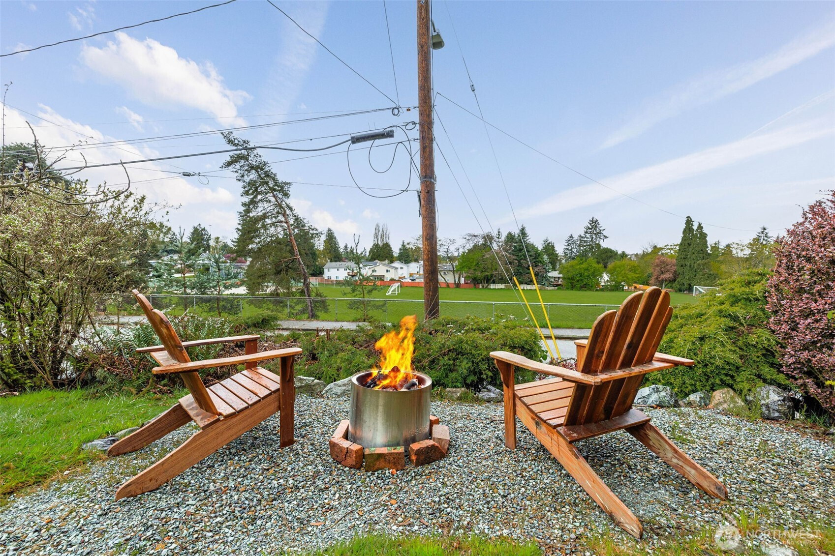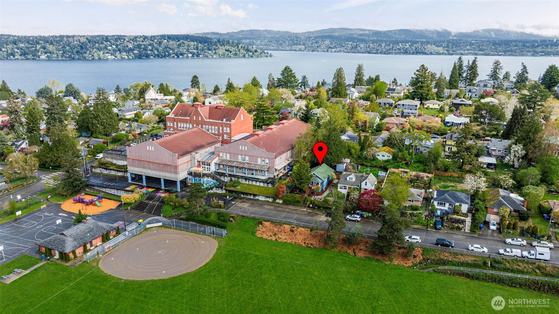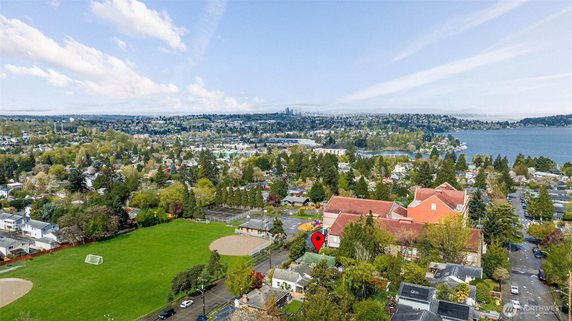 Park adjacent NW Craftsman on a private, dead-end street with rare parking and only one neighboring home. This charming 2-bed, 1 bath bungalow offers open green views, covered patios, and a fully fenced backyard oasis. Sip coffee on your covered patio overlooking Hutchinson Park with glimpses of DT Seattle & Lake WA. Two detached studios (+240 sqft, 2019) w/ additional 3/4 bath and utility sink offer incredible flexibility, ideal for guests, creative space, or income potential. Inside features original hardwoods, modern kitchen with custom counters, and a spa-like bath with radiant heated floors. Additional upgrades include LVP kitchen flooring, newer GE kitchen appliances (2021), Samsung washer and dryer, fresh interior paint, professional roof cleaning (2026), and gutter guards. Located just minutes to I 5, light rail, Lake Washington, and The Landing. Pre inspection and sewer scope available.