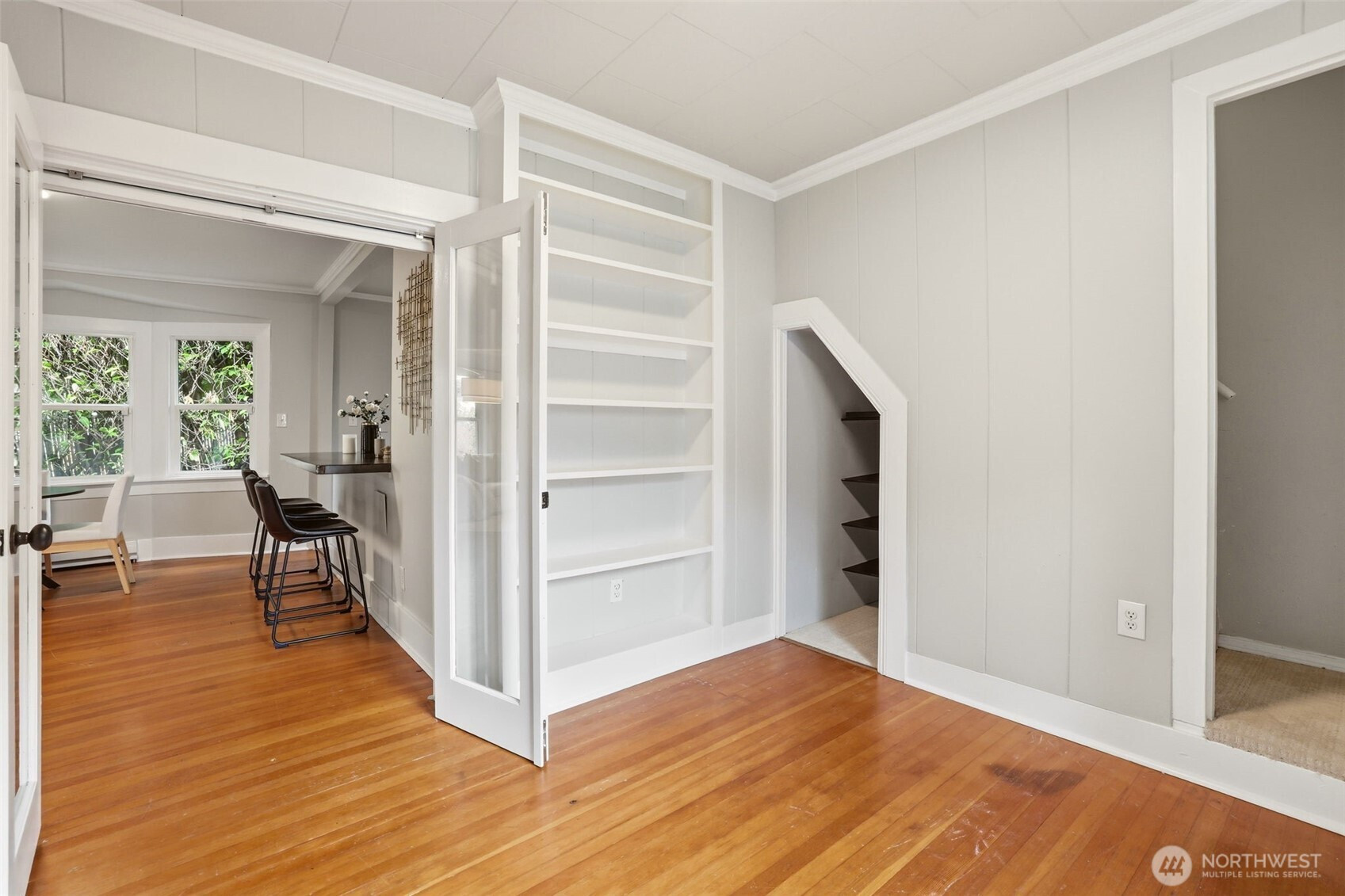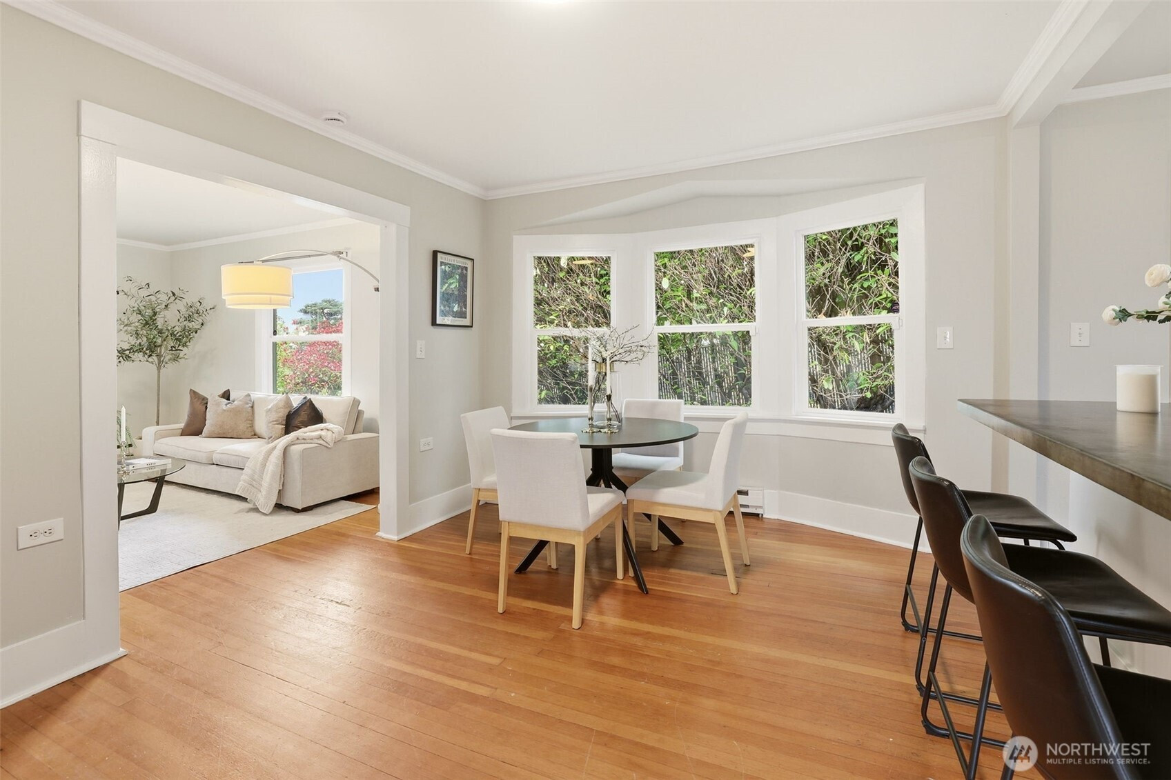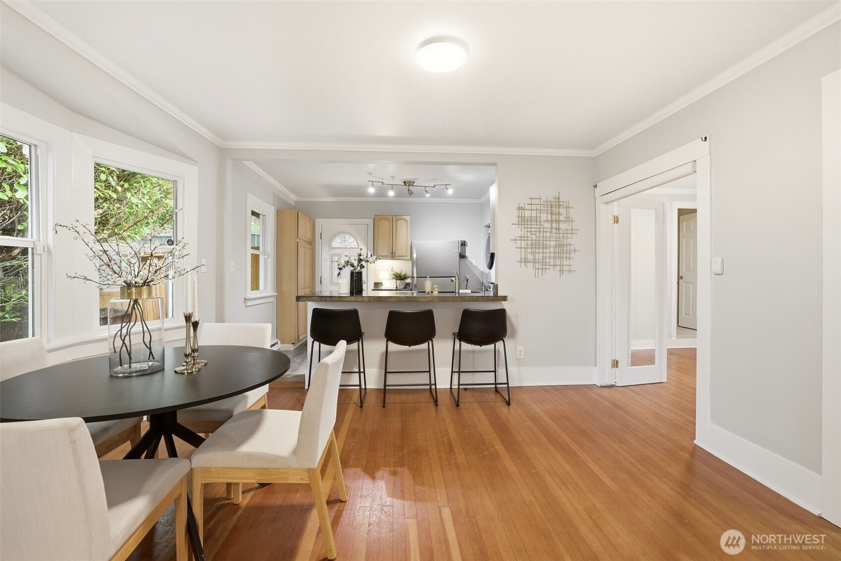Park adjacent NW Craftsman on a private, dead-end street with rare parking and only one neighboring home. This charming 2-bed, 1 bath bungalow offers open green views, covered patios, and a fully fenced backyard oasis. Sip coffee on your covered patio overlooking Hutchinson Park with glimpses of DT Seattle & Lake WA. Two detached studios (+240 sqft, 2019) w/ additional 3/4 bath and utility sink offer incredible flexibility, ideal for guests, creative space, or income potential. Inside features original hardwoods, modern kitchen with custom counters, and a spa-like bath with radiant heated floors. Additional upgrades include LVP kitchen flooring, newer GE kitchen appliances (2021), Samsung washer and dryer, fresh interior paint, professional roof cleaning (2026), and gutter guards. Located just minutes to I 5, light rail, Lake Washington, and The Landing. Pre inspection and sewer scope available.