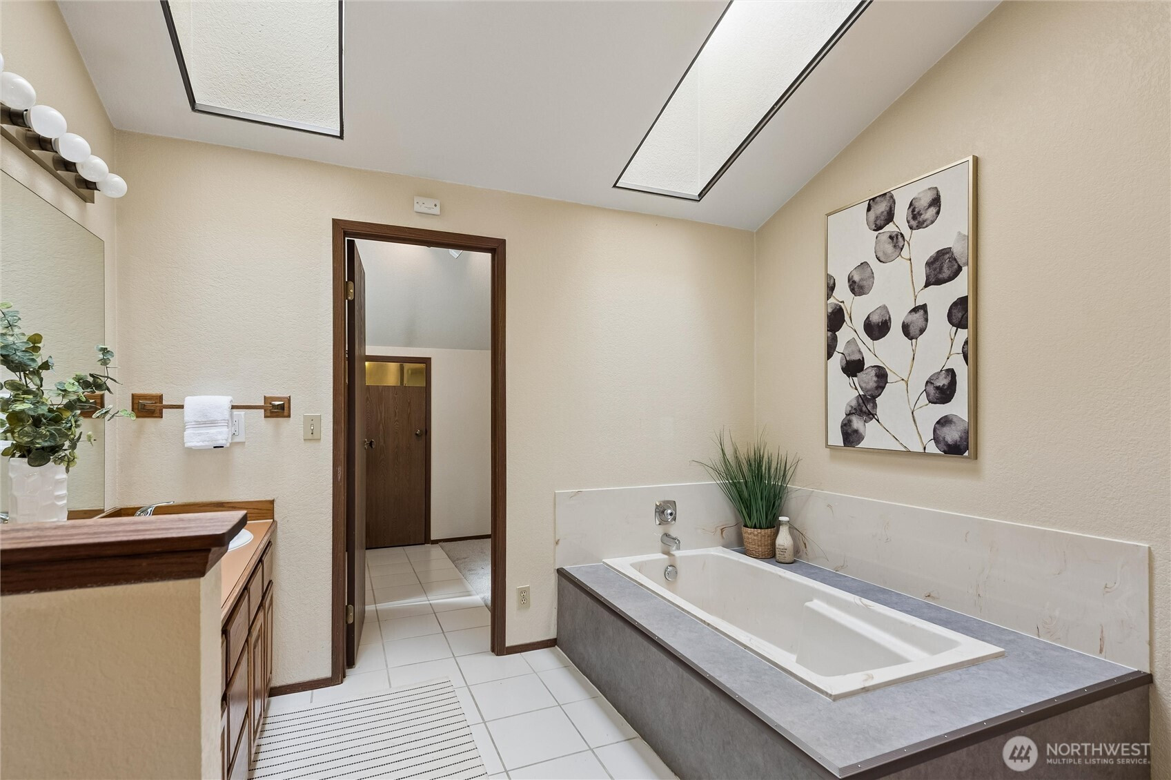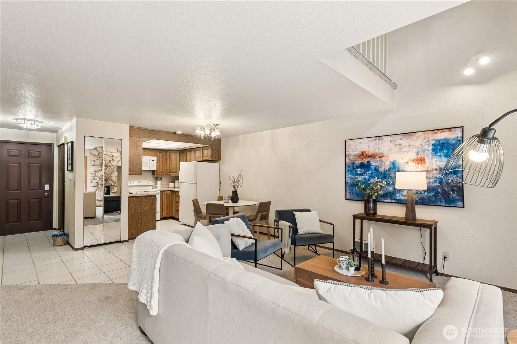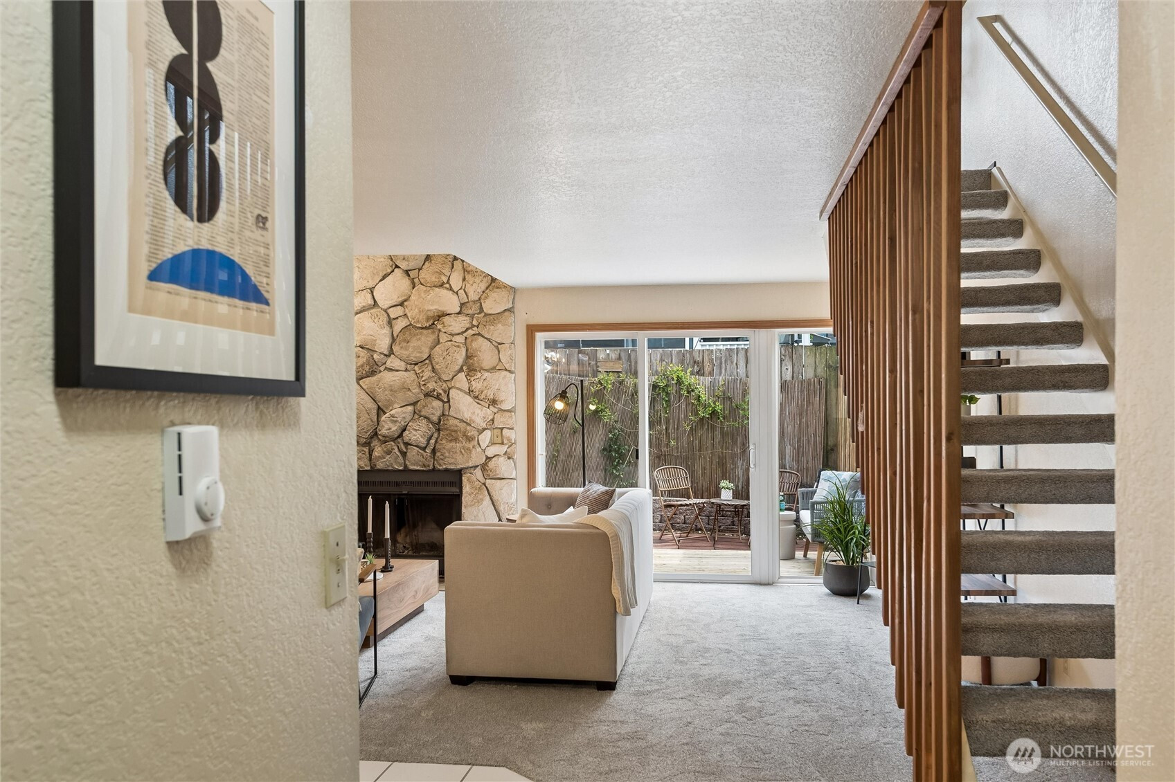 This is the mid-century moment you’ve been waiting for. Ideally located, this townhouse-style home lives like a single-family residence. Bright, private, and thoughtfully designed, the open-concept main level features a dramatic floor-to-ceiling river rock fireplace, clean architectural lines, and effortless flow throughout. A striking floating staircase leads to an oversized loft-style primary retreat with vaulted ceilings and skylights that flood the space with natural light. The flexible layout offers room for a home office, while the ensuite bath features a soaking tub, separate shower, double vanity, and walk-in closet with full-size washer and dryer. Large sliding doors create seamless indoor-outdoor living, opening to a fully fenced yard with dedicated gardening space. Additional highlights include a private one-car garage, new water heater, new carpet throughout, new thermostat, newer dishwasher, a main-level half bath, and no rental or pet restrictions. Located near the new light rail, this home blends design, function, and long-term potential in one of North Seattle’s most connected pockets. Pre-inspected and move-in ready!