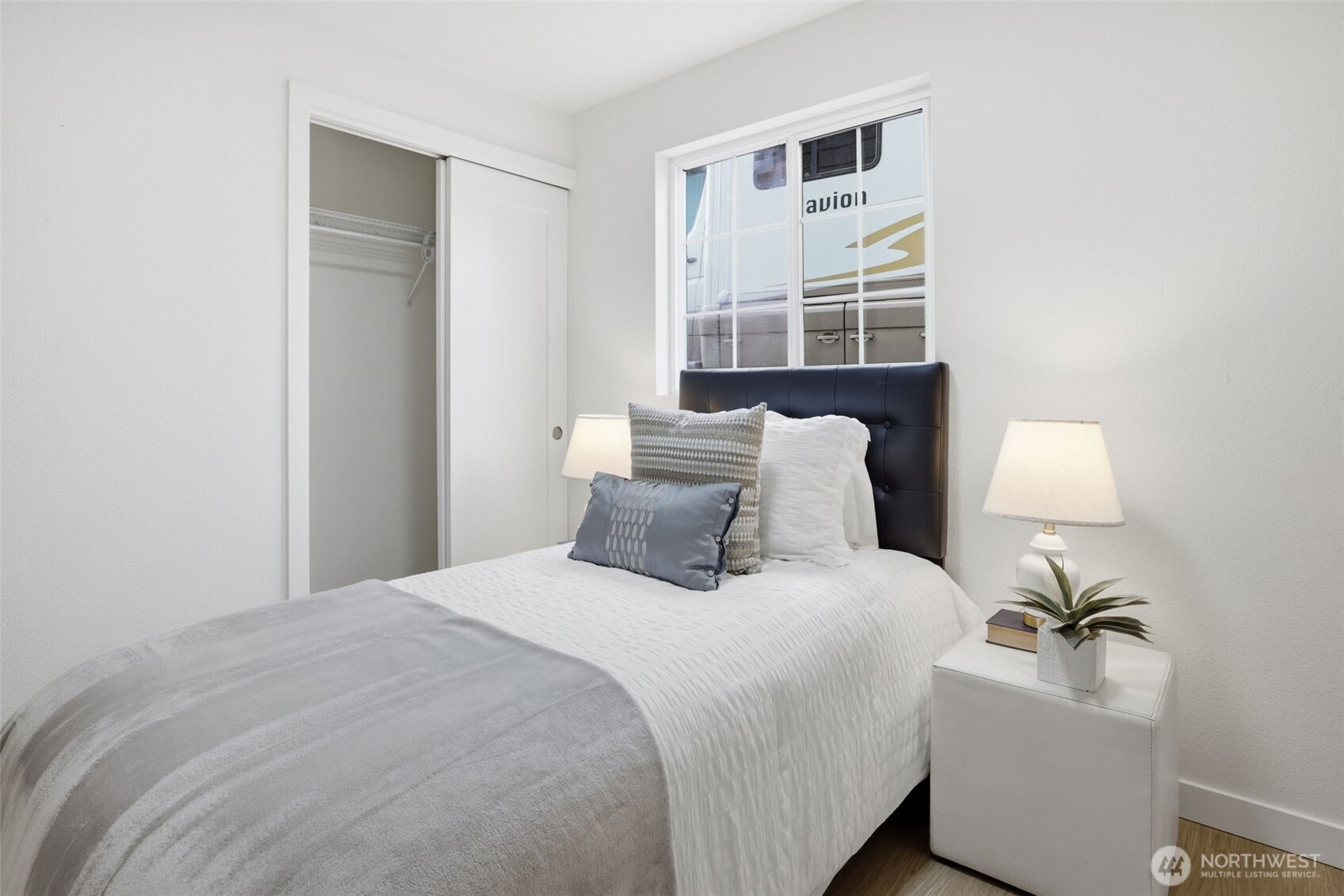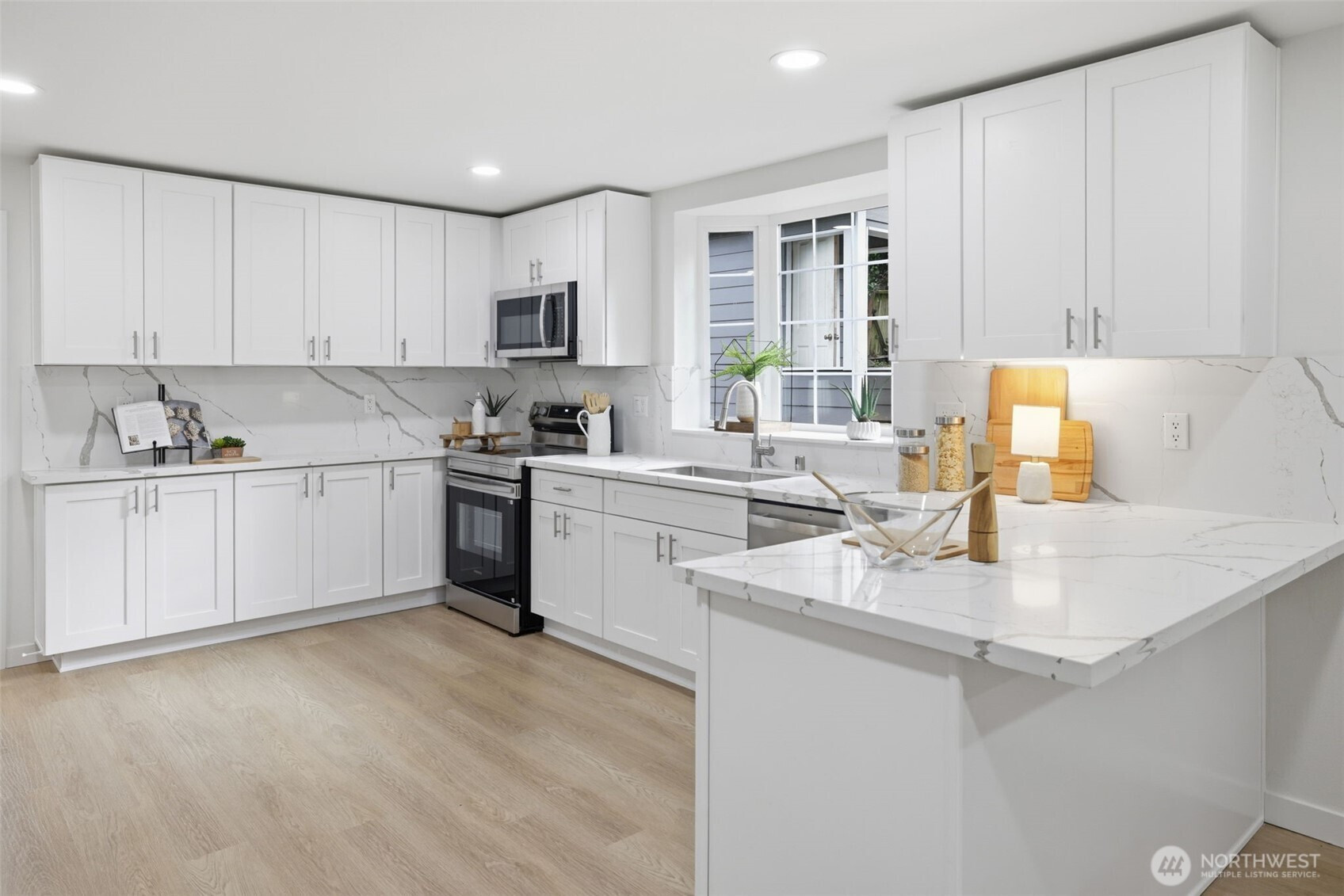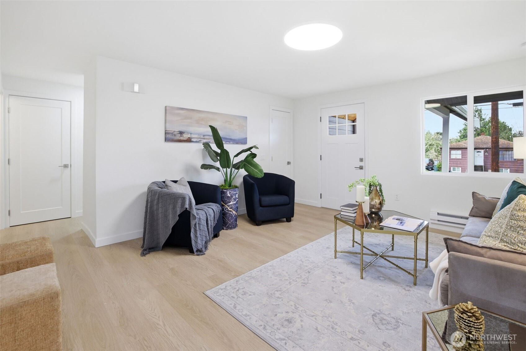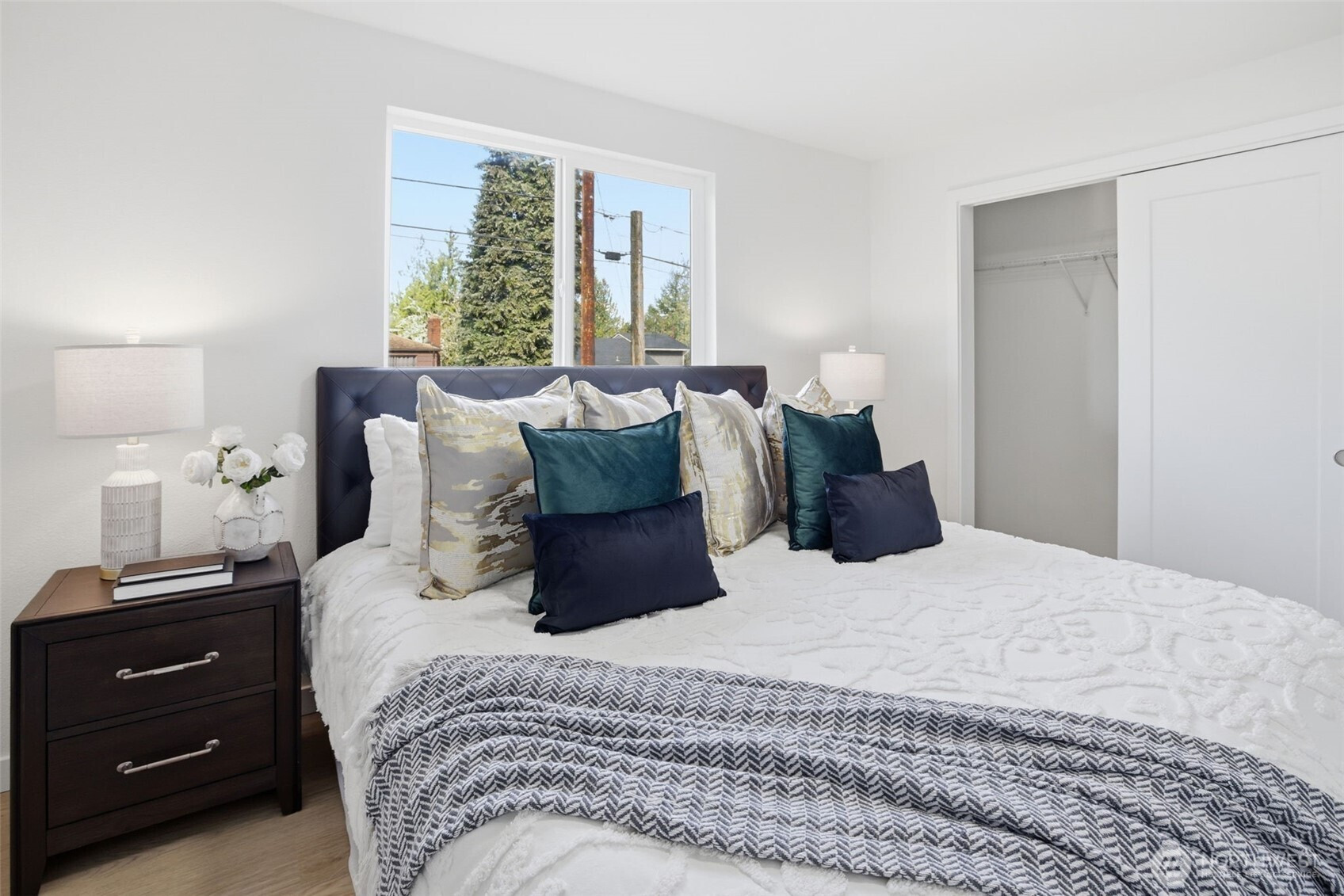 Innovative remodel has transformed this modest original build into a sleek, fashion-forward modern dwelling. Interior spaces are designed for open-concept living and rooms on both levels are absolutely glowing with light from strategic placement of expansive windows and hi-end lighting. Everything is new, barely unwrapped, and polished to a radiant shine. Quality finishes from the outside in: Cement siding, durable luxury vinyl plank flooring thruout, quartz kitchen, new appliances, new bathrooms, updated electrical, new Pex plumbing, the works. Thoughtful layout designed with a nod to flexible spaces and lots of hidden cubbies for storing all your stuff. Main floor: Living room, den/ tv rm, huge bright kitchen w/ eating space opening to outdoors for easy entertaining, 2bedrms, full bath. Upper level:Primary bedrm w/ private balcony & City skyline views, 4th bedroom, office area and full bath. Ideal location! All the favorite hangouts are just a stroll away. Start the day with coffee/breakfast at Redwing Café, relax with craft cocktails at Jude’s bistro, satisfy pizza/gourmet ice cream cravings at Paranormal Pie and Creamy Cone. For outdoor lovers, there is quick access to Lk WA, nature trails, Kubota Gardens and nearby pickle ball courts. Metro #7 just 2-3 blocks away (every 5-10min.), 5min drive to Light Rail, and “silly-close” access to major freeways. Daily essentials w/i 1mile radius. Effortless carefree living in a quiet friendly neighborhood. Just.Move.In.