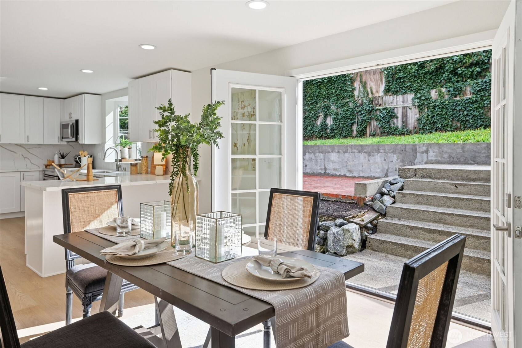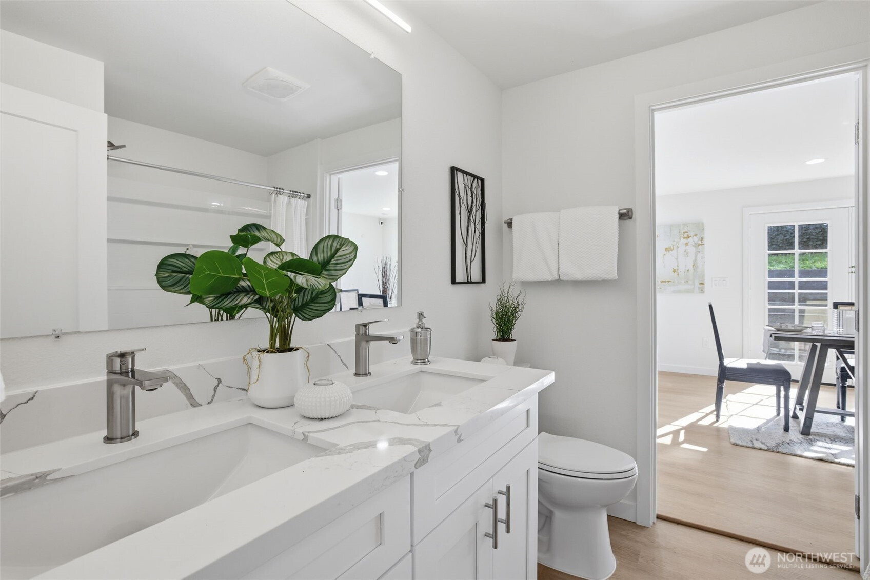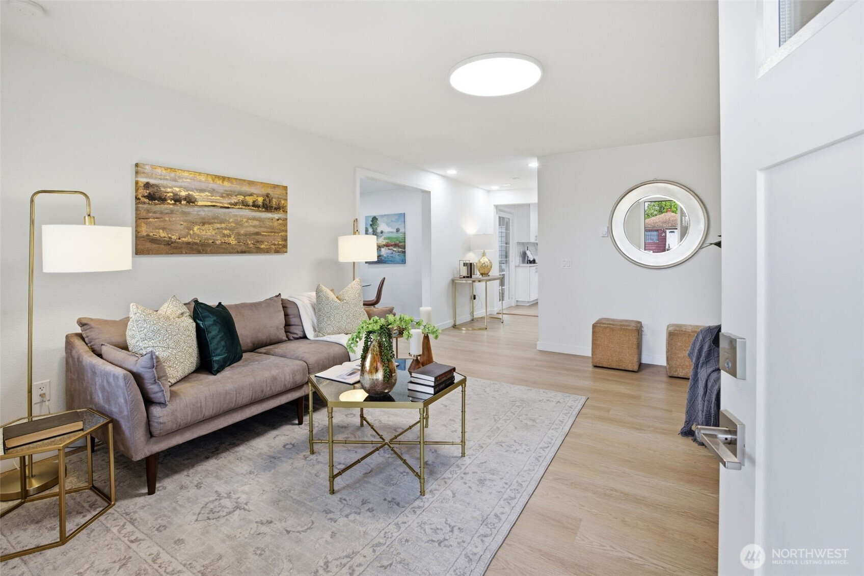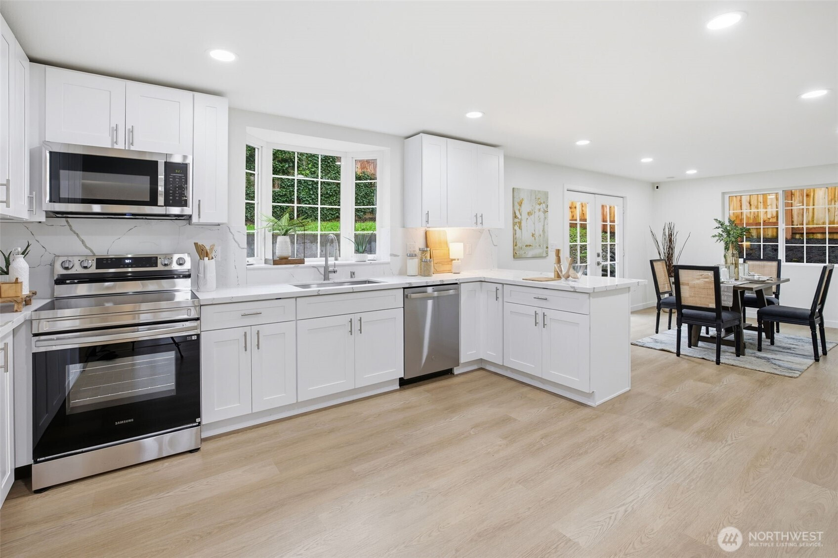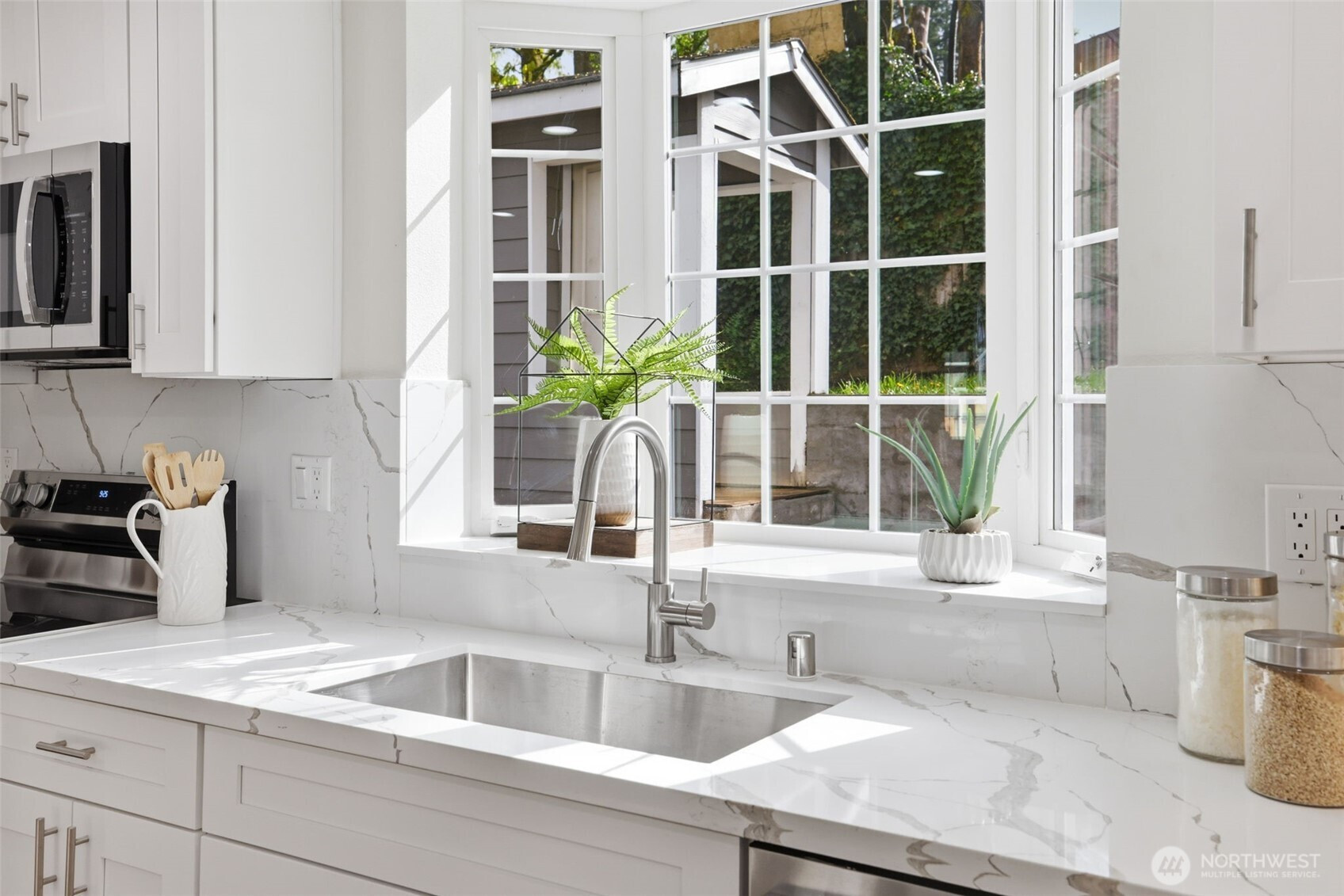 Innovative remodel has transformed this modest original build into a sleek, fashion-forward modern dwelling. Interior spaces are designed for open-concept living and rooms on both levels are absolutely glowing with light from strategic placement of expansive windows and hi-end lighting. Everything is new, barely unwrapped, and polished to a radiant shine. Quality finishes from the outside in: Cement siding, durable luxury vinyl plank flooring thruout, quartz kitchen, new appliances, new bathrooms, updated electrical, new Pex plumbing, the works. Thoughtful layout designed with a nod to flexible spaces and lots of hidden cubbies for storing all your stuff. Main floor: Living room, den/ tv rm, huge bright kitchen w/ eating space opening to outdoors for easy entertaining, 2bedrms, full bath. Upper level:Primary bedrm w/ private balcony & City skyline views, 4th bedroom, office area and full bath. Ideal location! All the favorite hangouts are just a stroll away. Start the day with coffee/breakfast at Redwing Café, relax with craft cocktails at Jude’s bistro, satisfy pizza/gourmet ice cream cravings at Paranormal Pie and Creamy Cone. For outdoor lovers, there is quick access to Lk WA, nature trails, Kubota Gardens and nearby pickle ball courts. Metro #7 just 2-3 blocks away (every 5-10min.), 5min drive to Light Rail, and “silly-close” access to major freeways. Daily essentials w/i 1mile radius. Effortless carefree living in a quiet friendly neighborhood. Just.Move.In.