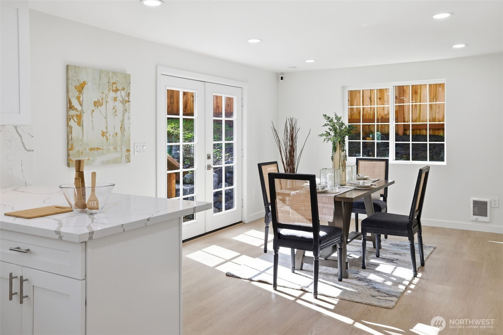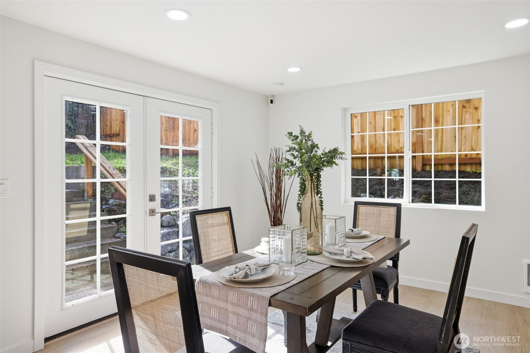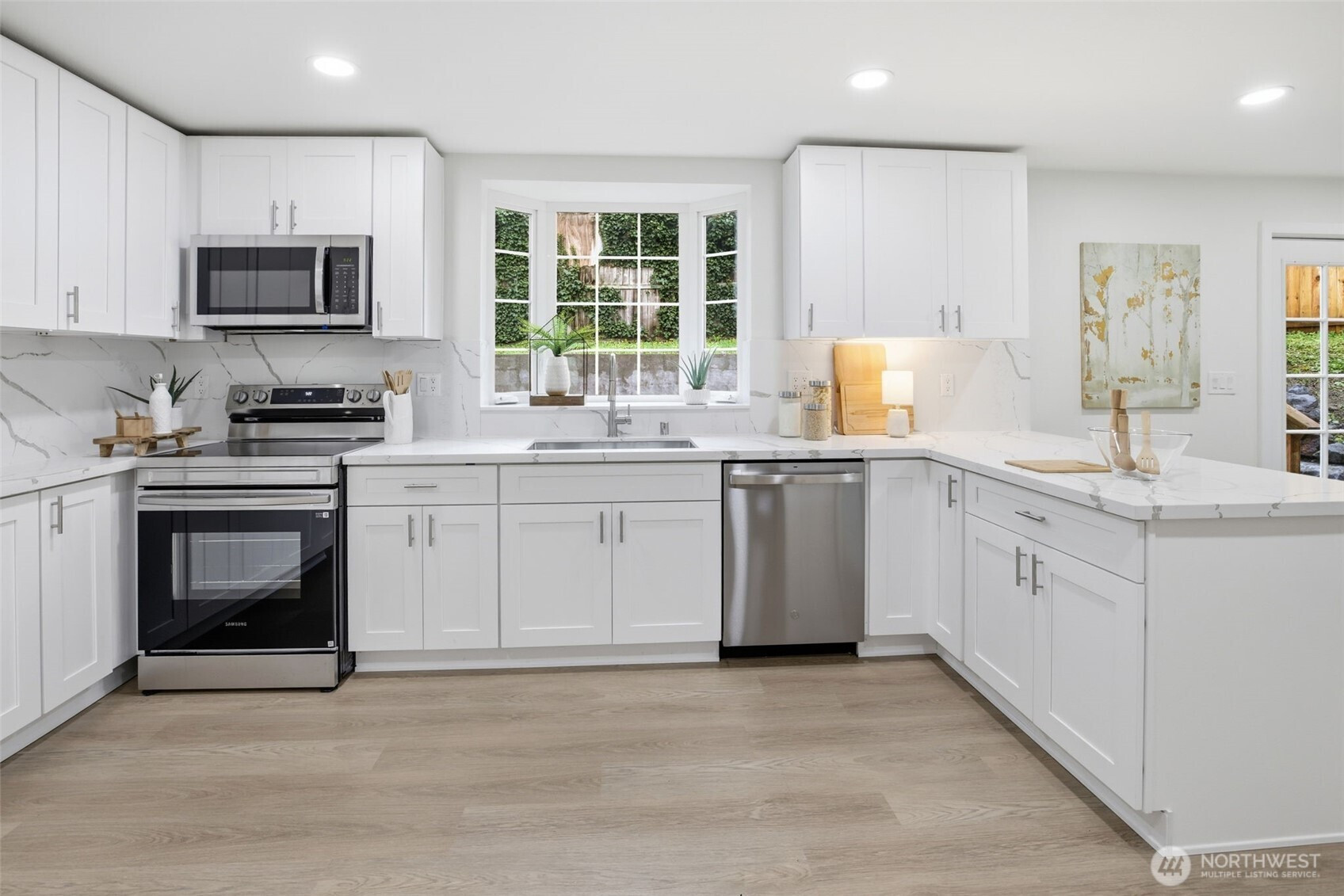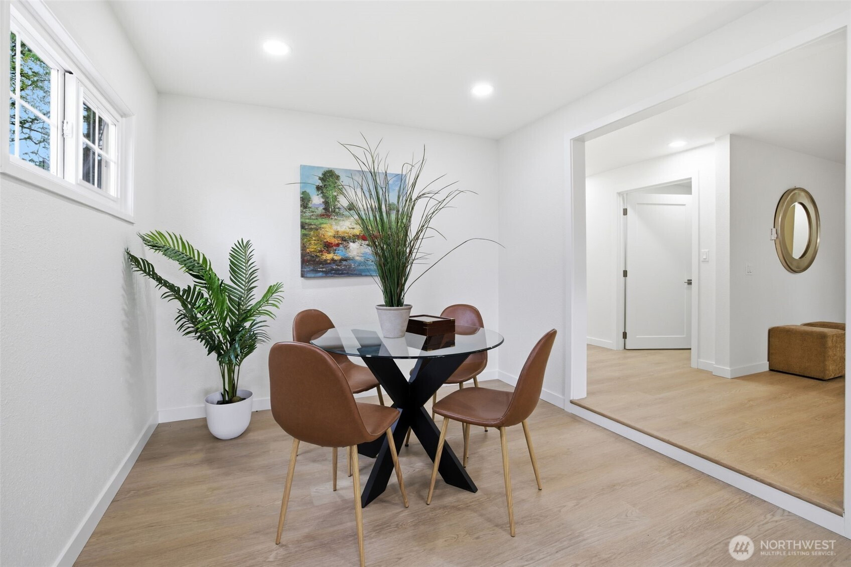 Innovative remodel has transformed this modest original build into a sleek, fashion-forward modern dwelling. Interior spaces are designed for open-concept living and rooms on both levels are absolutely glowing with light from strategic placement of expansive windows and hi-end lighting. Everything is new, barely unwrapped, and polished to a radiant shine. Quality finishes from the outside in: Cement siding, durable luxury vinyl plank flooring thruout, quartz kitchen, new appliances, new bathrooms, updated electrical, new Pex plumbing, the works. Thoughtful layout designed with a nod to flexible spaces and lots of hidden cubbies for storing all your stuff. Main floor: Living room, den/ tv rm, huge bright kitchen w/ eating space opening to outdoors for easy entertaining, 2bedrms, full bath. Upper level:Primary bedrm w/ private balcony & City skyline views, 4th bedroom, office area and full bath. Ideal location! All the favorite hangouts are just a stroll away. Start the day with coffee/breakfast at Redwing Café, relax with craft cocktails at Jude’s bistro, satisfy pizza/gourmet ice cream cravings at Paranormal Pie and Creamy Cone. For outdoor lovers, there is quick access to Lk WA, nature trails, Kubota Gardens and nearby pickle ball courts. Metro #7 just 2-3 blocks away (every 5-10min.), 5min drive to Light Rail, and “silly-close” access to major freeways. Daily essentials w/i 1mile radius. Effortless carefree living in a quiet friendly neighborhood. Just.Move.In.