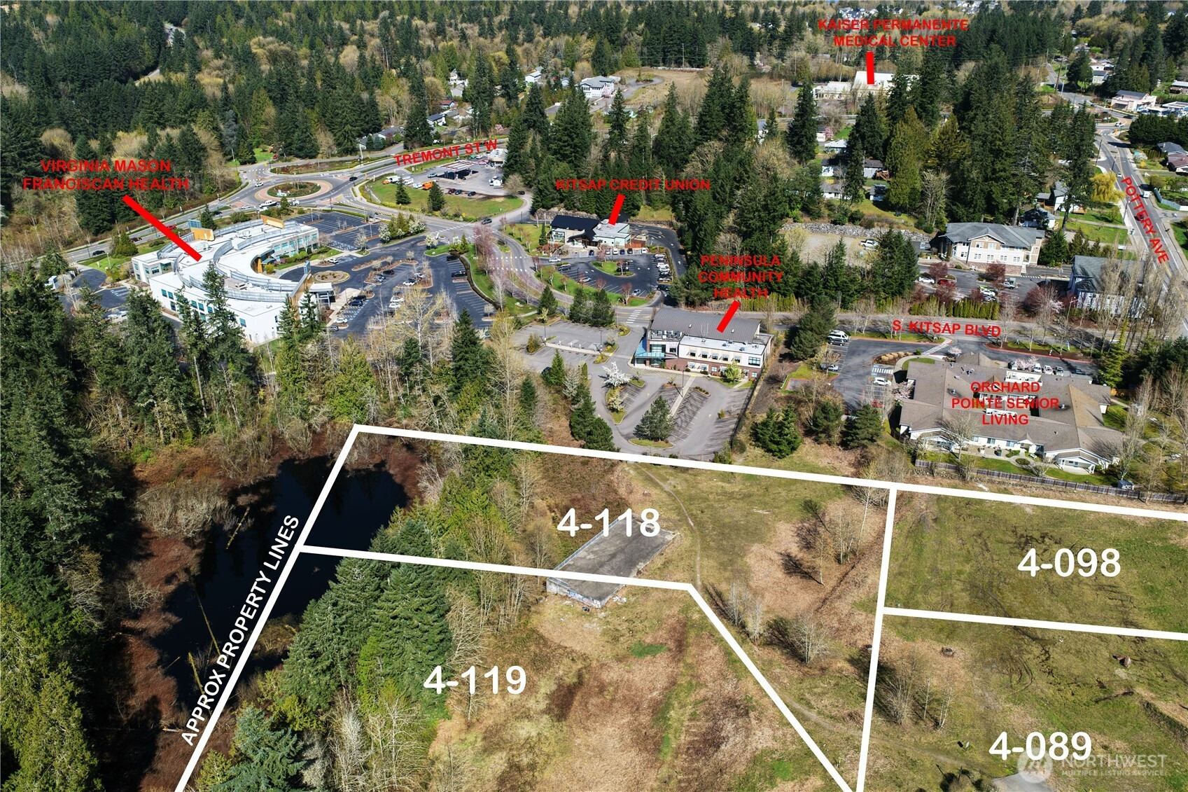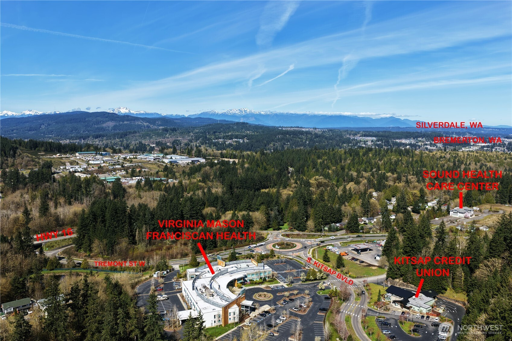 Premier medical/professional office development site located in the heart of South Kitsap’s rapidly expanding healthcare corridor. Positioned at the highly trafficked Tremont/Pottery Ave/Hwy 16 intersection, this property sits within the region’s established medical, dental, and professional services hub. All utilities are stubbed to the site, providing a streamlined path to development within the City of Port Orchard. Adjacent to the Harrison Medical Center urgent care expansion, the location offers immediate synergy with surrounding healthcare providers and continued growth in the area. Ideal for medical, dental, or professional office users seeking expansion or relocation in a high-demand service area. Excellent access to and from Highway 16, combined with attractive territorial and mountain views, enhances both convenience and long-term value. Accumulation of 4 Parcels.