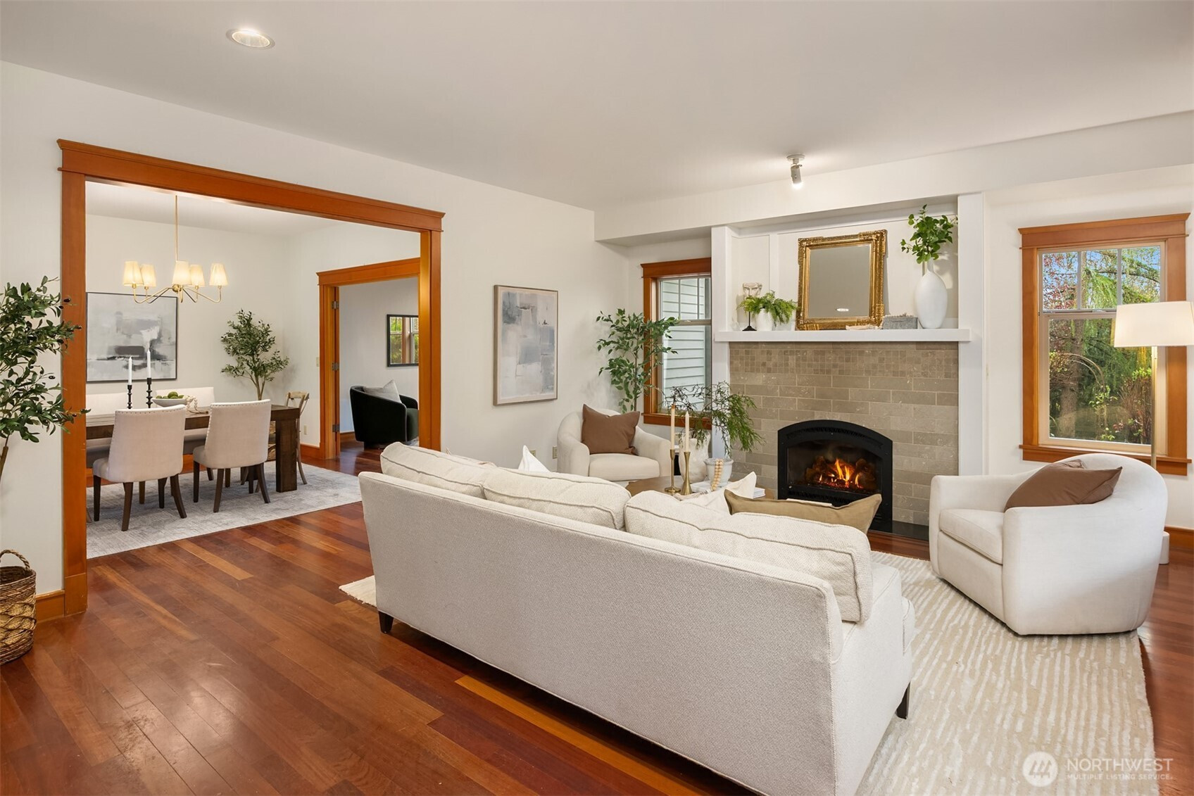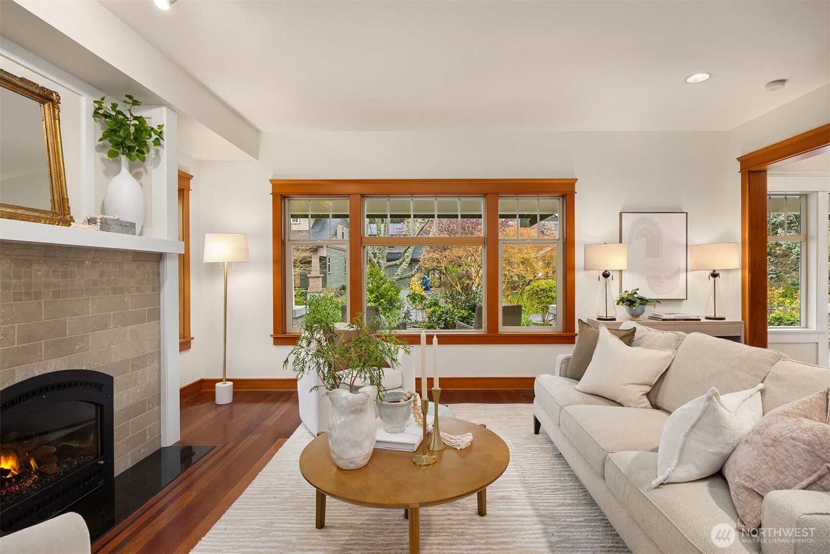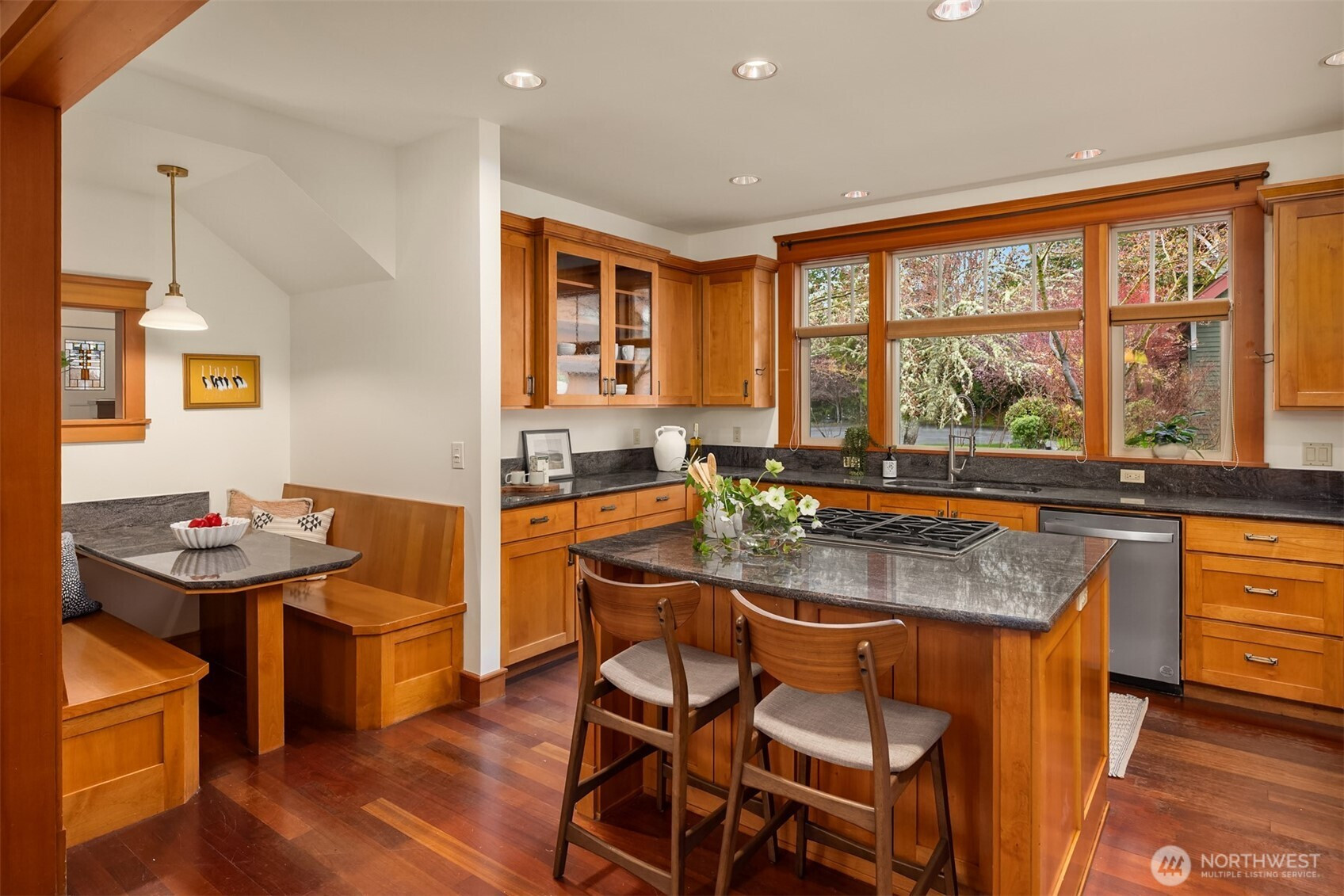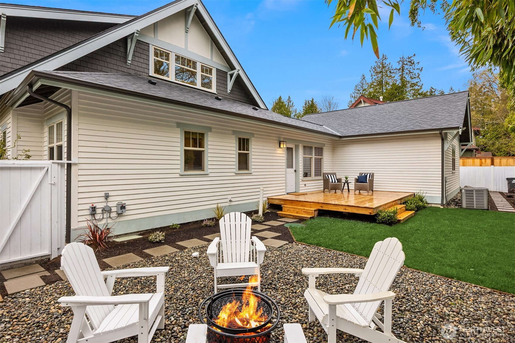 Rolling Bay gem! This modern bungalow blends timeless Arts & Crafts charm with a peaceful corner-lot setting. The 4 bedroom and 2.5 bathroom layout features a main-level primary suite with a five-piece bath and walk-in closet. Rich wood trim and thoughtful finishes run throughout. Unwind in the garden-facing living room with a cozy gas fireplace, or gather in the spacious kitchen with a built-in bench nook and plenty of room to entertain. The open dining area flows into a bright office with French doors. Upstairs offers three bedrooms, a full bath, and a versatile open family room. Enjoy sunsets from the covered front patio or host guests on the large back deck overlooking the fully fenced yard. A generous two-car garage and extra driveway parking provide convenience. Built in 2004 by Sandy Beach Holdings, this home features the sought-after Hawthorn floorplan by Christian Gladu. Ideally located with easy access to Rolling Bay amenities, Manitou Beach, and the ferry for commuting.