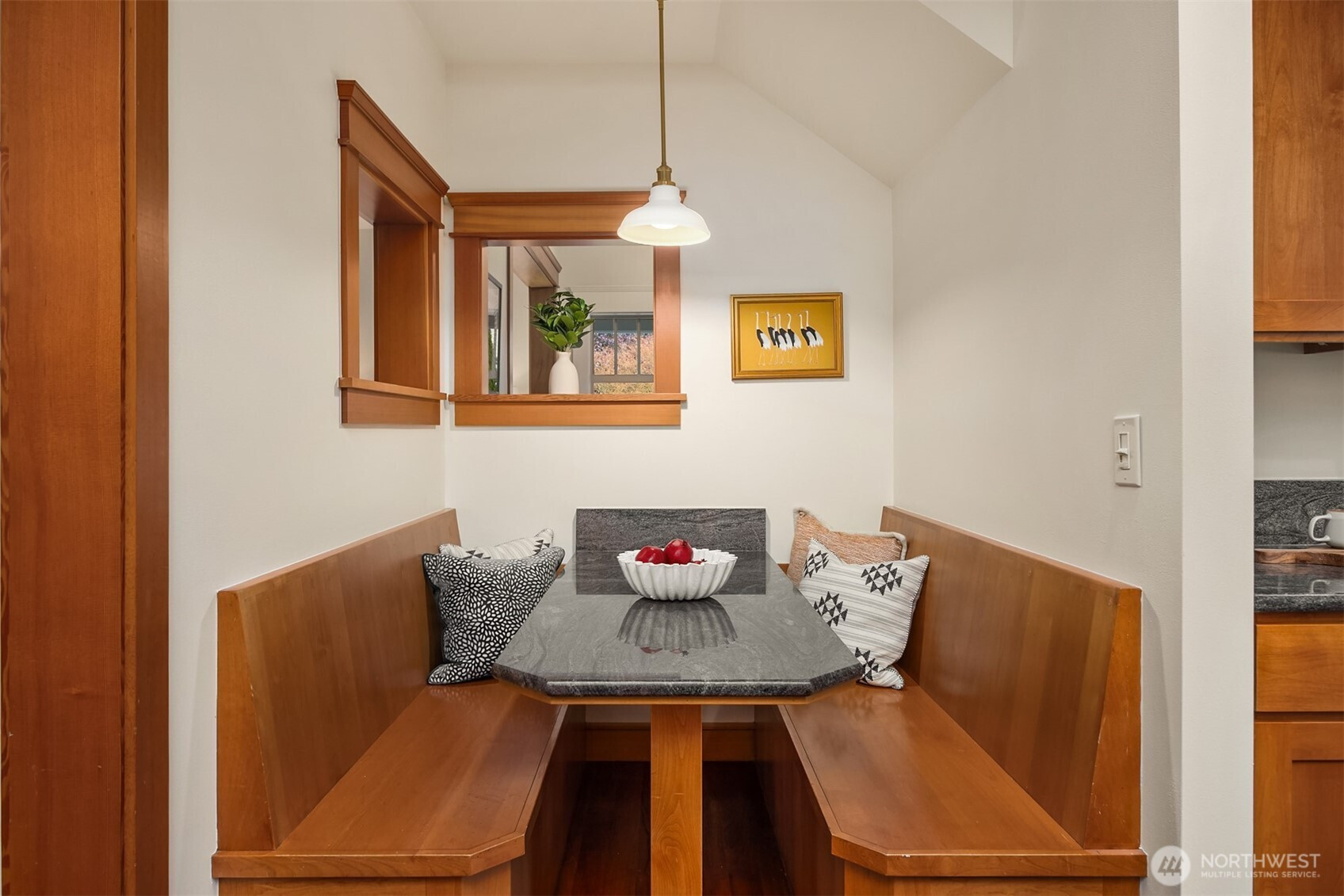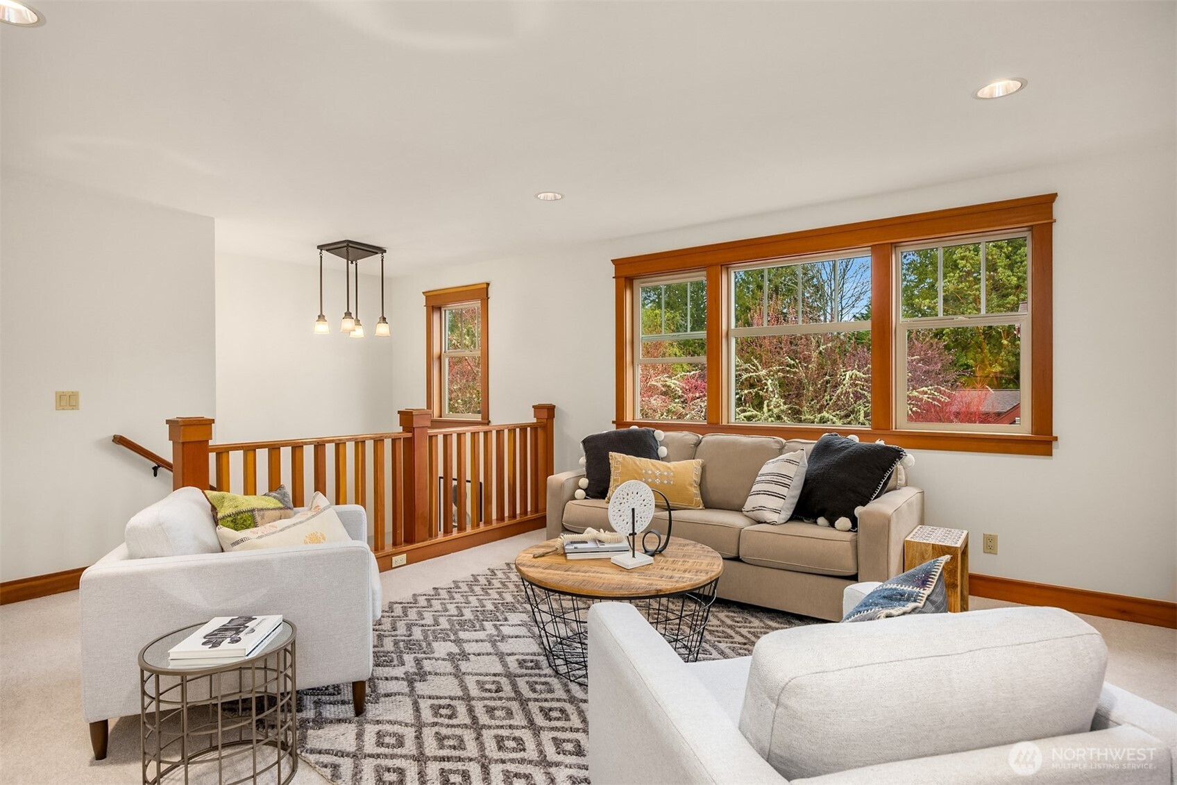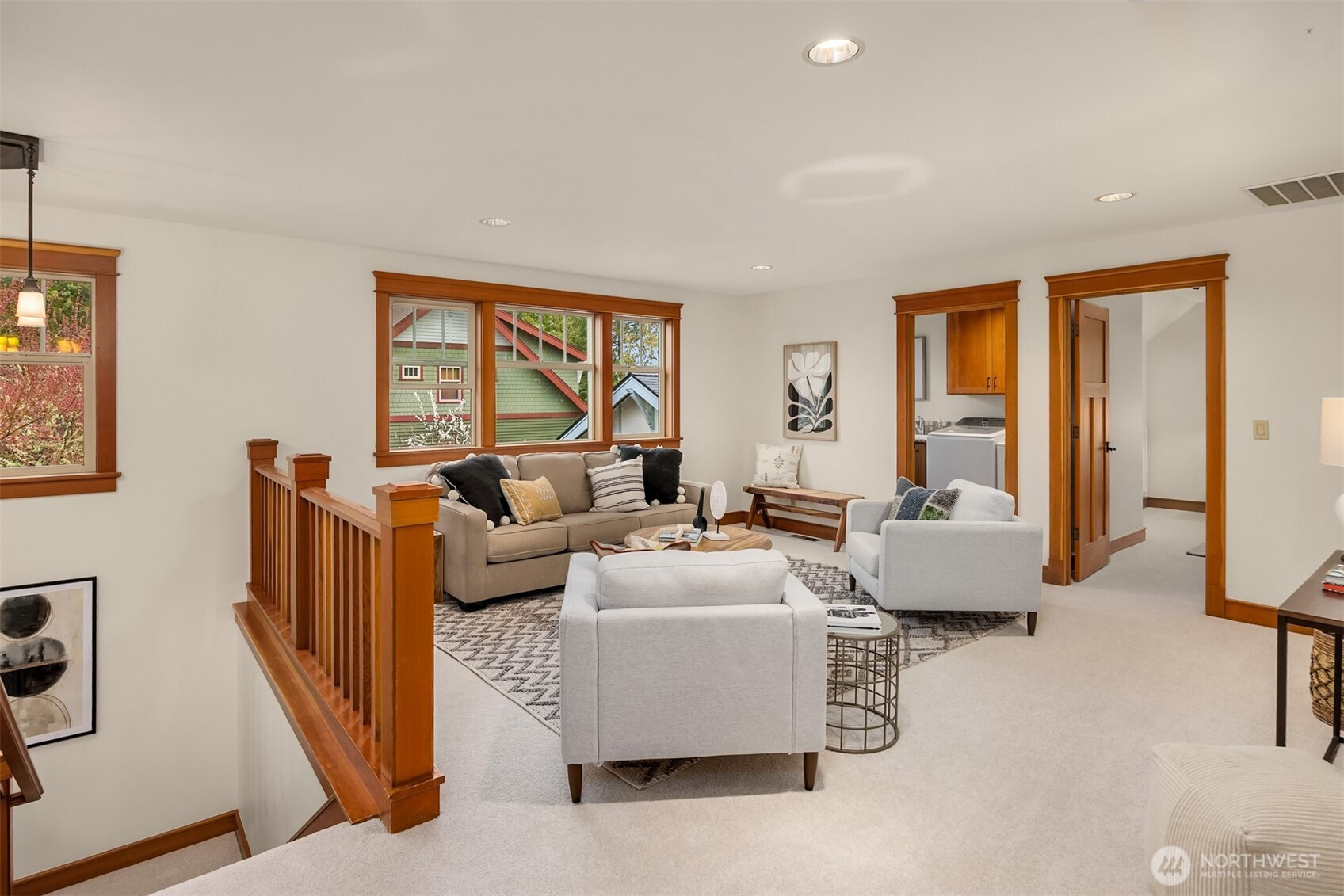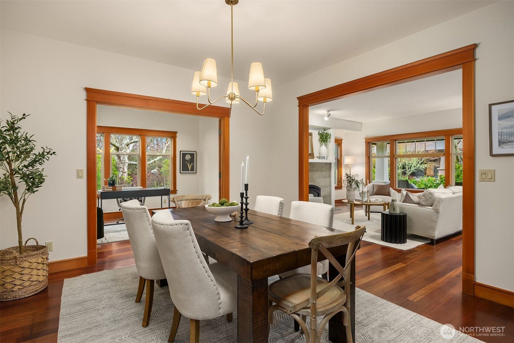 Rolling Bay gem! This modern bungalow blends timeless Arts & Crafts charm with a peaceful corner-lot setting. The 4 bedroom and 2.5 bathroom layout features a main-level primary suite with a five-piece bath and walk-in closet. Rich wood trim and thoughtful finishes run throughout. Unwind in the garden-facing living room with a cozy gas fireplace, or gather in the spacious kitchen with a built-in bench nook and plenty of room to entertain. The open dining area flows into a bright office with French doors. Upstairs offers three bedrooms, a full bath, and a versatile open family room. Enjoy sunsets from the covered front patio or host guests on the large back deck overlooking the fully fenced yard. A generous two-car garage and extra driveway parking provide convenience. Built in 2004 by Sandy Beach Holdings, this home features the sought-after Hawthorn floorplan by Christian Gladu. Ideally located with easy access to Rolling Bay amenities, Manitou Beach, and the ferry for commuting.