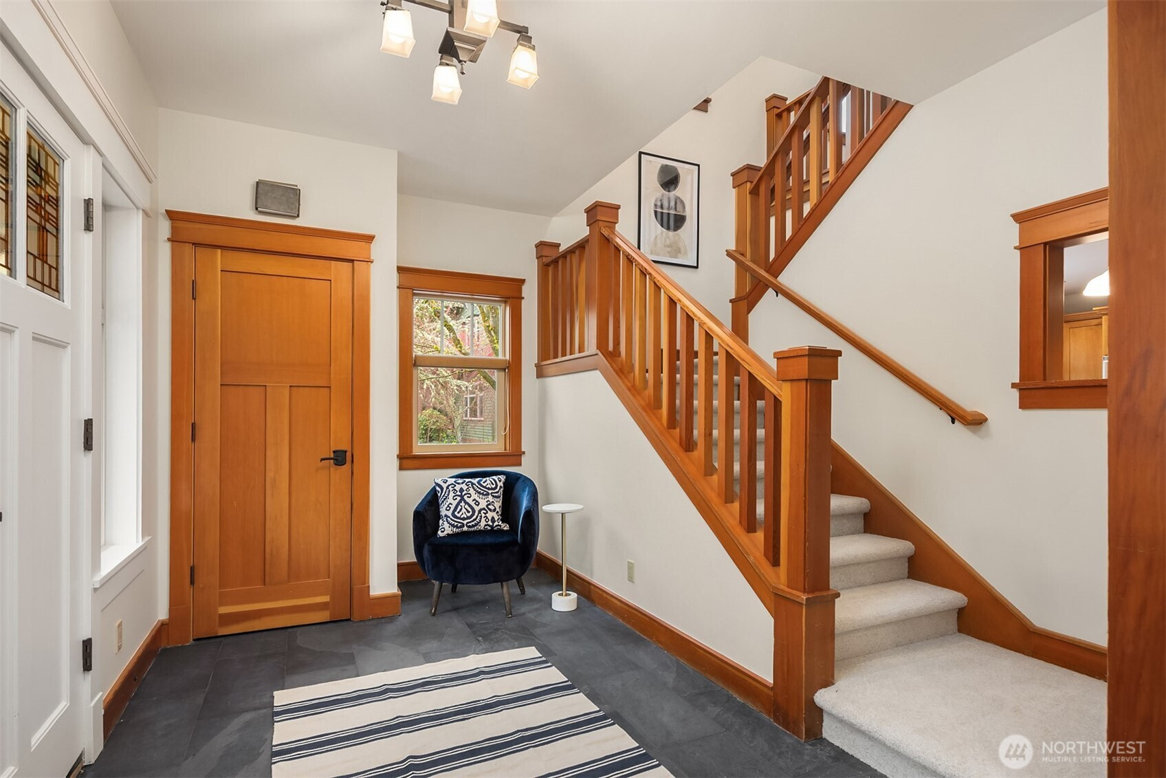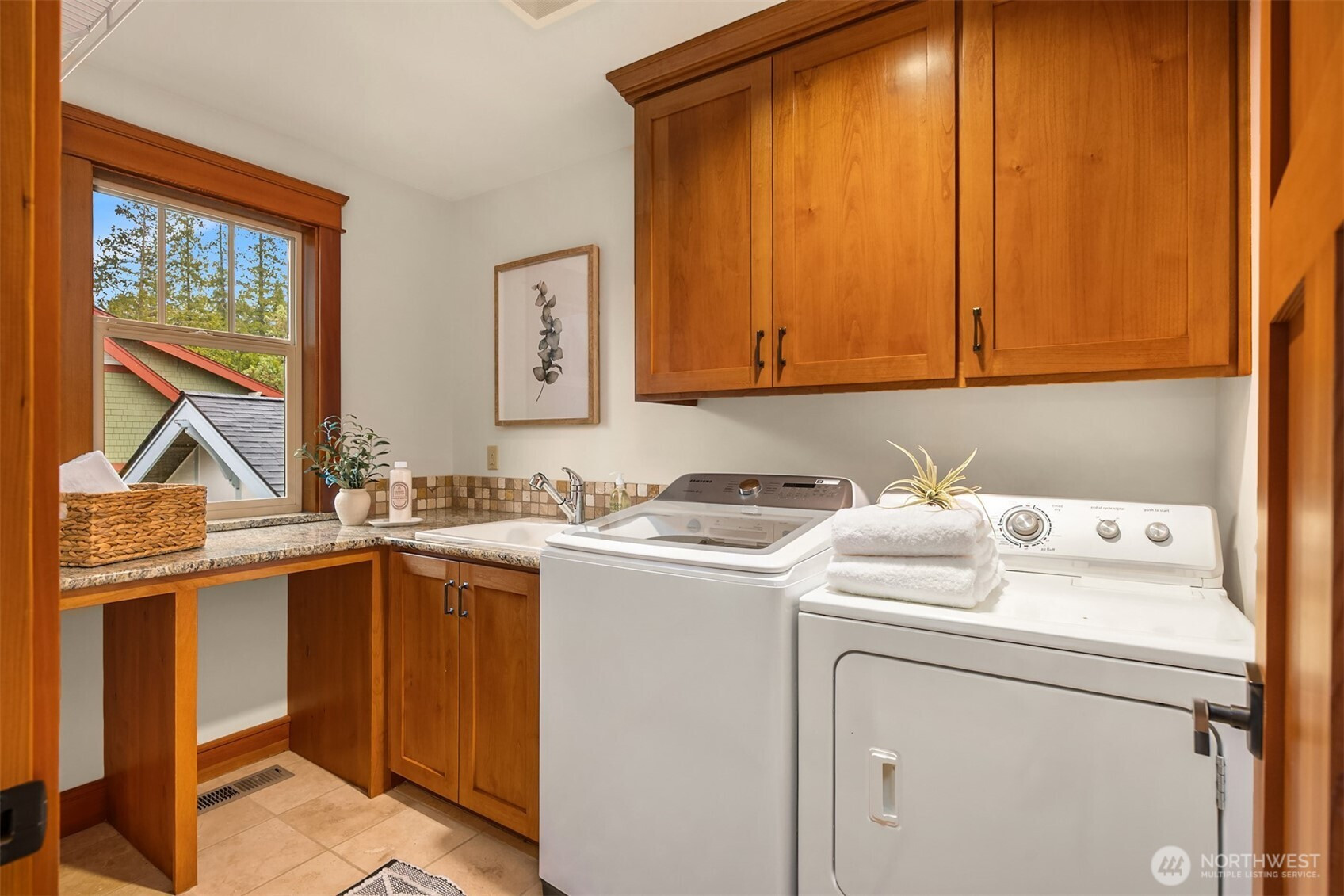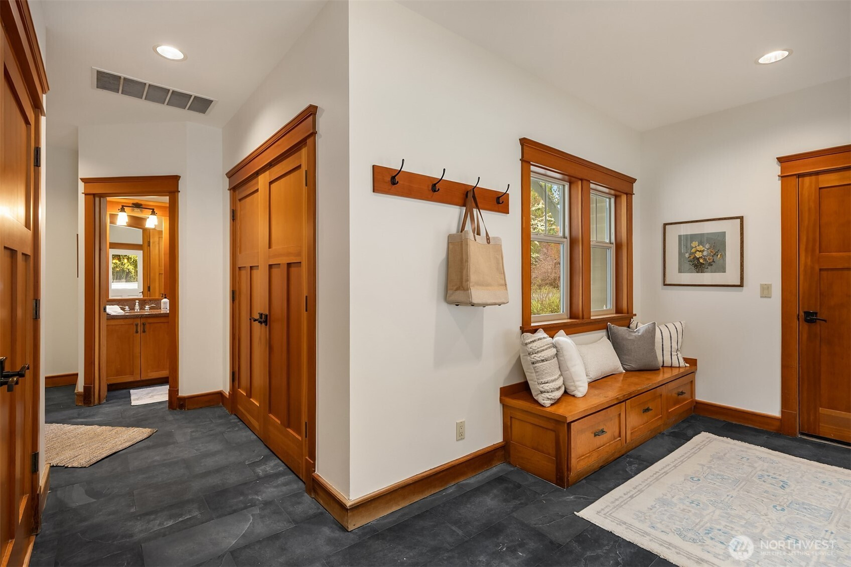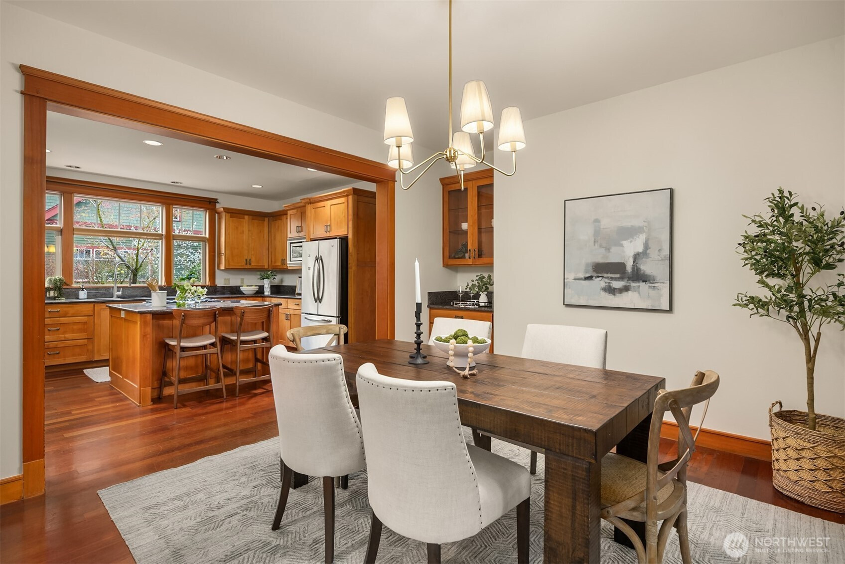 Rolling Bay gem! This modern bungalow blends timeless Arts & Crafts charm with a peaceful corner-lot setting. The 4 bedroom and 2.5 bathroom layout features a main-level primary suite with a five-piece bath and walk-in closet. Rich wood trim and thoughtful finishes run throughout. Unwind in the garden-facing living room with a cozy gas fireplace, or gather in the spacious kitchen with a built-in bench nook and plenty of room to entertain. The open dining area flows into a bright office with French doors. Upstairs offers three bedrooms, a full bath, and a versatile open family room. Enjoy sunsets from the covered front patio or host guests on the large back deck overlooking the fully fenced yard. A generous two-car garage and extra driveway parking provide convenience. Built in 2004 by Sandy Beach Holdings, this home features the sought-after Hawthorn floorplan by Christian Gladu. Ideally located with easy access to Rolling Bay amenities, Manitou Beach, and the ferry for commuting.