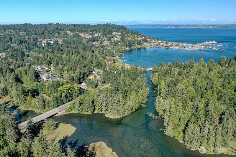First time on the market! Private oasis near town. Gracious floor plan blends comfort and sophistication, ideal for entertaining and everyday living. This light-filled home blends timeless architecture with thoughtful modern updates. Expansive windows bring in natural light, creating warm, and welcoming spaces. View home offers a total of 1.55 acres with approx 608' of tidal front on Peninsula, 3 bedrooms, 2.5 baths. East facing front porch showcases City, Sound, Kingston Harbor, Mountain views. Outdoor stairs take you down to a private lagoon with a private dock. Centrally designed main level living room with pair of double doors opens to West facing large entertainment deck, eat-in kitchen, stainless appliances, dining room, den, utility, half-bath, and bonus room. Main level private guest quarters with walk in closet & ensuite bath. Upstairs primary ensuite retreat w/attached den/office/flex room w/deck access. Additional 2 bedrooms share a Jack & Jill bath. Upstairs also includes expansive bonus room w/deck access. Unfinished lower level as potential media room/gym/playroom/bedroom. Home offers expansive views w/stunning sunrises/sunsets from every room. Enjoy back deck privacy. Prime front yard viewing of Kingston 4th of July fireworks! Property has both mature fruit Apple tree and plants. Detached garage w/unfinished upper level workshop/storage area. Separate custom built shop. Easy walk to downtown Kingston, marina, parks, and ferry. Minutes to White Horse Golf Course