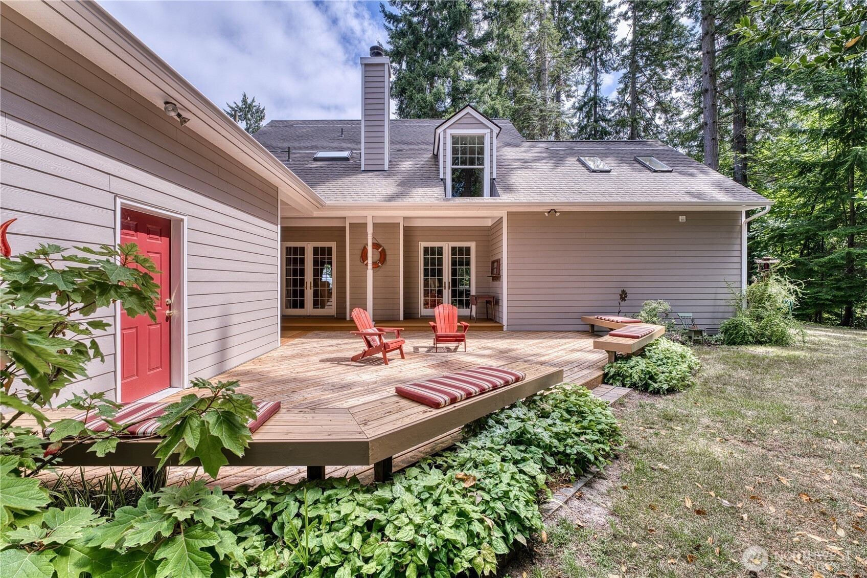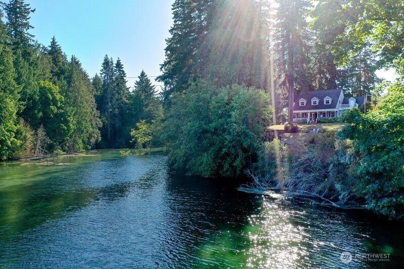 First time on the market! Private oasis near town. Gracious floor plan blends comfort and sophistication, ideal for entertaining and everyday living. This light-filled home blends timeless architecture with thoughtful modern updates. Expansive windows bring in natural light, creating warm, and welcoming spaces. View home offers a total of 1.55 acres with approx 608' of tidal front on Peninsula, 3 bedrooms, 2.5 baths. East facing front porch showcases City, Sound, Kingston Harbor, Mountain views. Outdoor stairs take you down to a private lagoon with a private dock. Centrally designed main level living room with pair of double doors opens to West facing large entertainment deck, eat-in kitchen, stainless appliances, dining room, den, utility, half-bath, and bonus room. Main level private guest quarters with walk in closet & ensuite bath. Upstairs primary ensuite retreat w/attached den/office/flex room w/deck access. Additional 2 bedrooms share a Jack & Jill bath. Upstairs also includes expansive bonus room w/deck access. Unfinished lower level as potential media room/gym/playroom/bedroom. Home offers expansive views w/stunning sunrises/sunsets from every room. Enjoy back deck privacy. Prime front yard viewing of Kingston 4th of July fireworks! Property has both mature fruit Apple tree and plants. Detached garage w/unfinished upper level workshop/storage area. Separate custom built shop. Easy walk to downtown Kingston, marina, parks, and ferry. Minutes to White Horse Golf Course