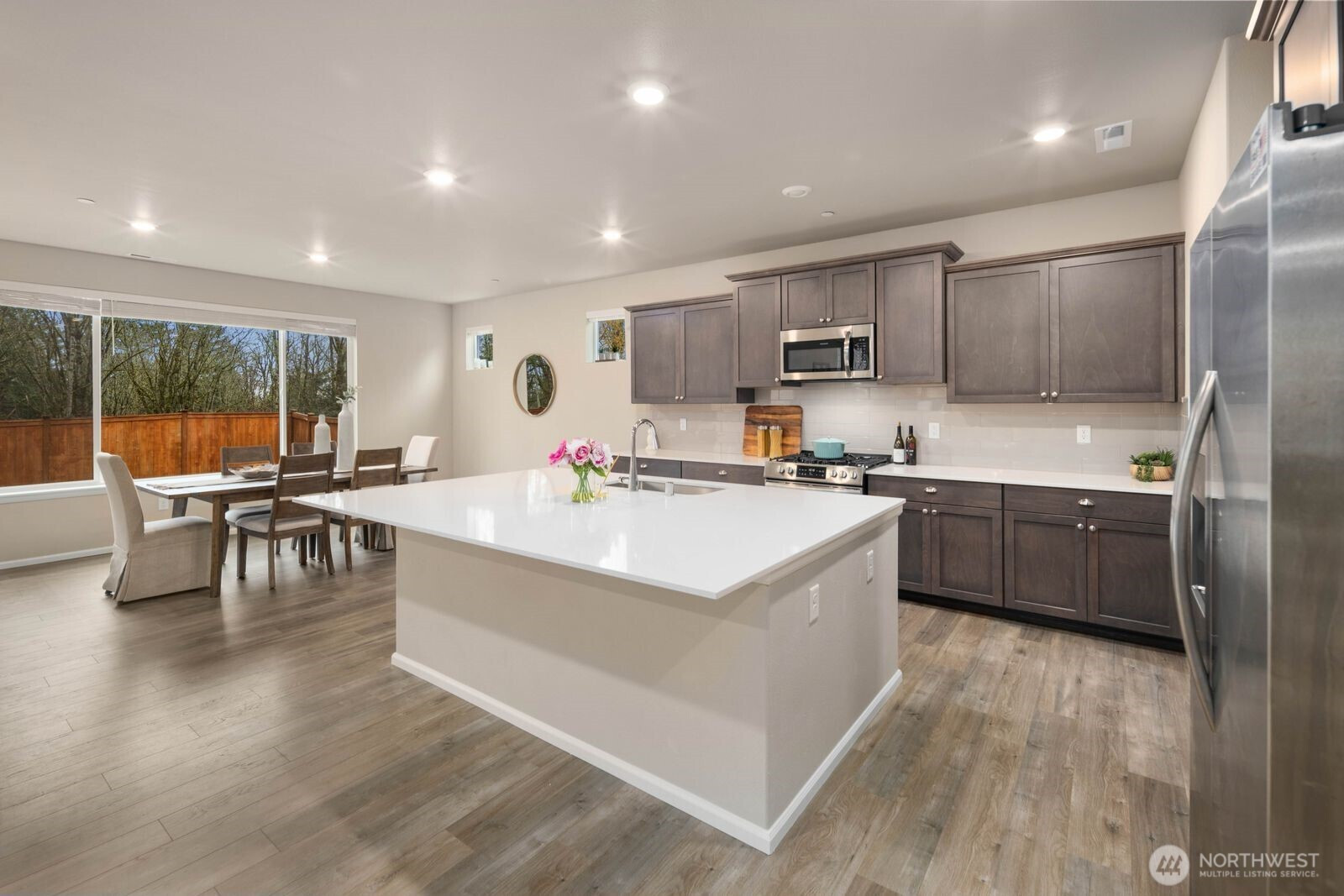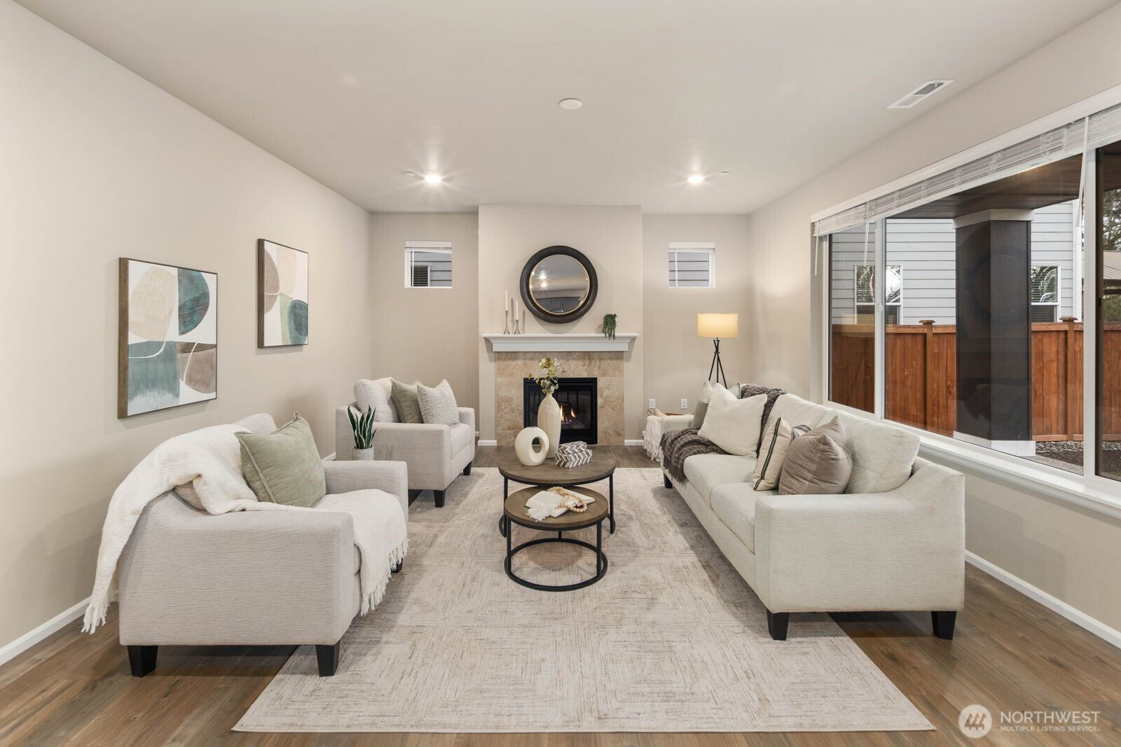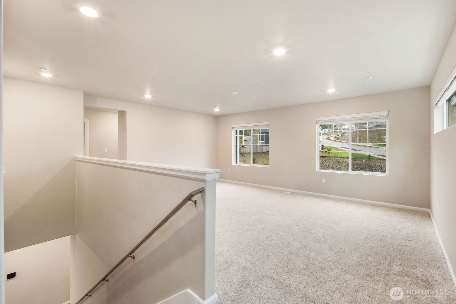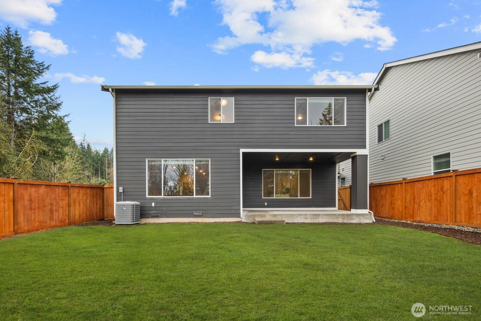 Discover serene living in at Soundview Estates. Featuring 5 bedrooms, 2.75 baths, including a luxurious primary bedroom with 5-piece en suite, large walk-in closet, and views of lush greenery, plus a main-floor bedroom with 3/4 bathroom. A spacious loft and expansive covered patio provide year-round entertaining. The 3,081 sq. ft. home boasts an oversized kitchen island with abundant cabinetry, a pantry, custom soft-close cabinets, quartz counters, stainless steel appliances, A/C, and a fully fenced yard. High-tech cable, smart home devices. Oversized garage w/storage. Situated on a prime land at the end of the street, overlooking a greenbelt with nearby trails and a playground - an ideal setting for comfort, seclusion, and modern living.