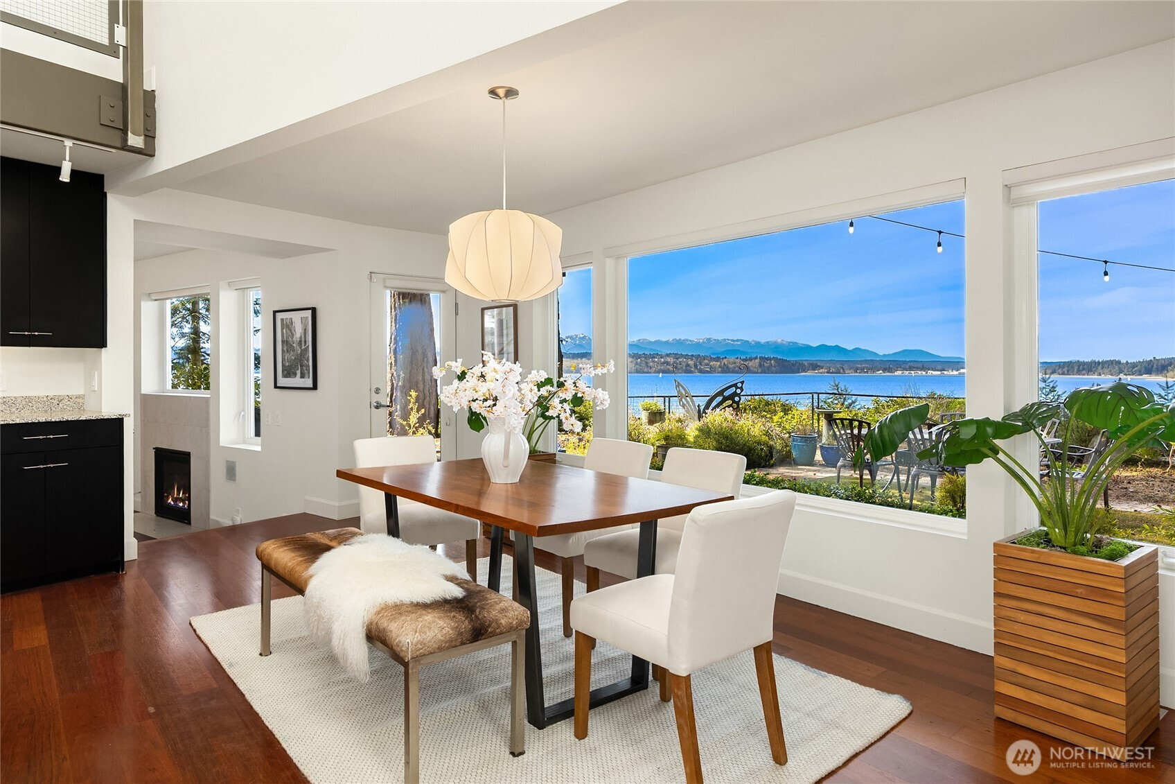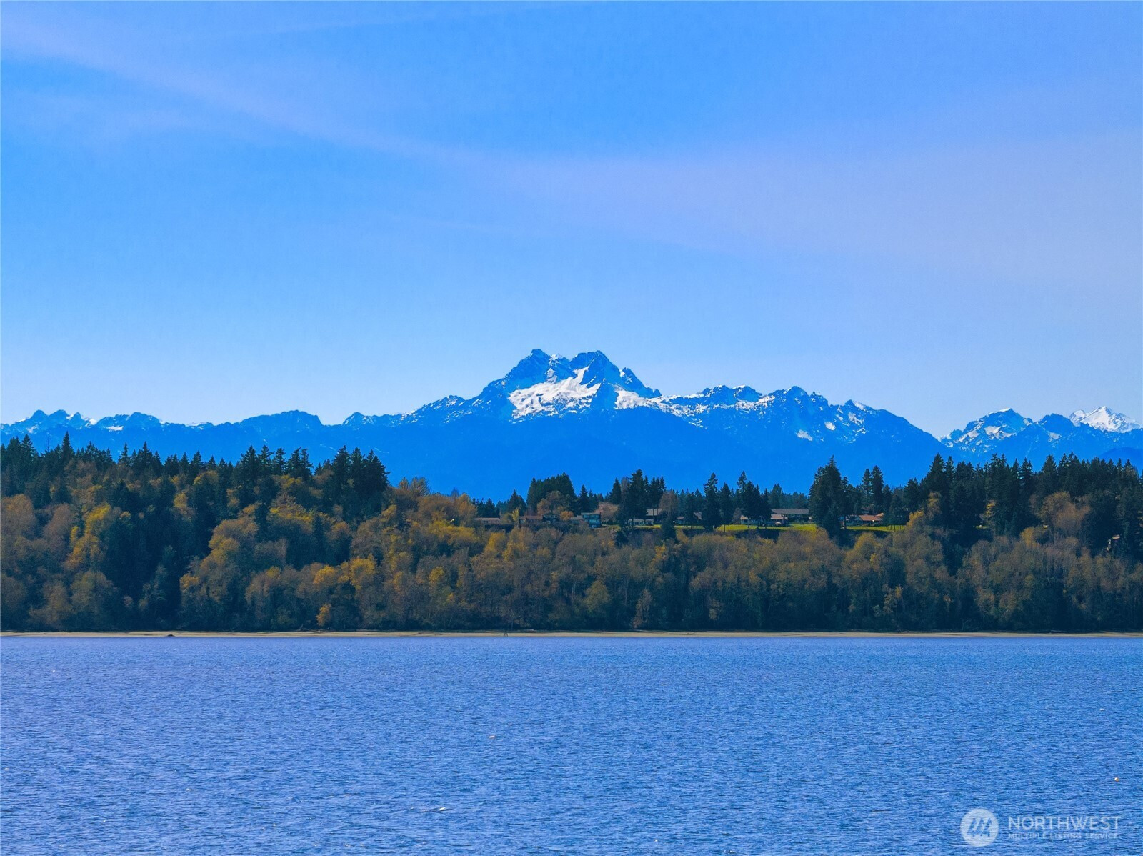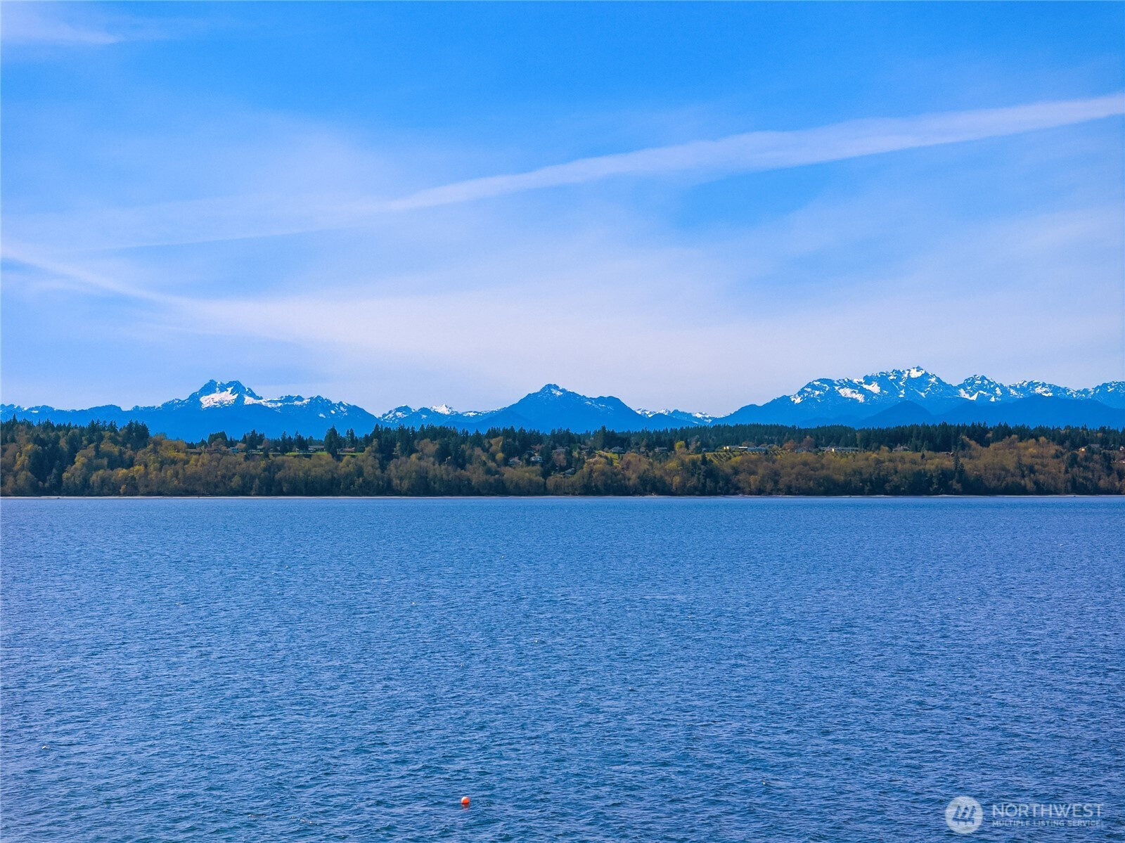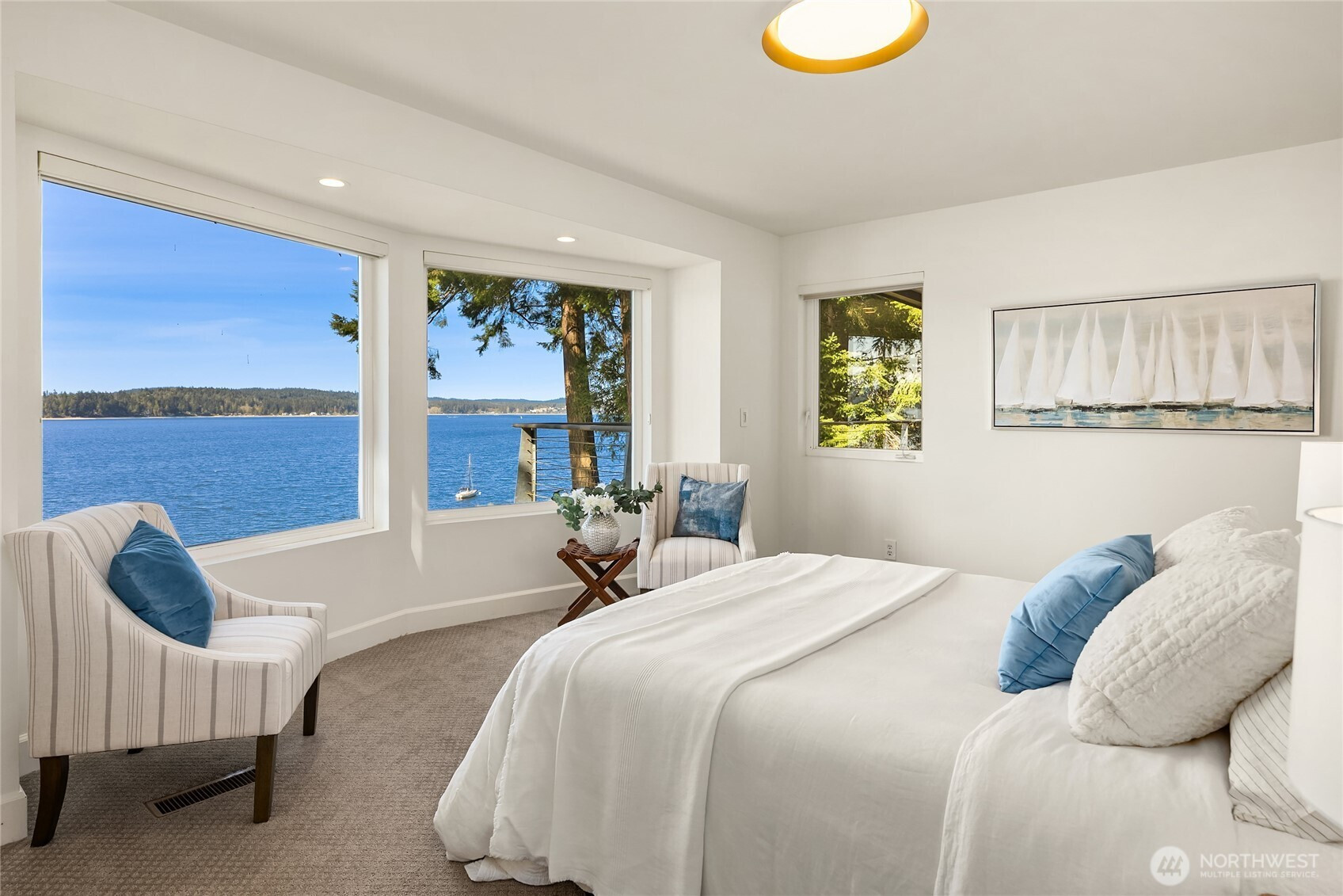 A refined expression of post-modernism by renowned Seattle architect John Brenneis, set in a stunning waterfront setting with sweeping Olympic Mountain and Puget Sound views from every room, abundant natural light, and unforgettable sunsets. Masterfully designed for both style and function, the airy open floor plan centers around a dramatic 2-story kitchen and dining space crowned by a pyramidal skylight. The layout offers 3 ensuite bedrooms plus an office, including a spacious primary suite with dual walk-in closets, a spa-like bathroom, and a private deck. The spacious main level invites indoor-outdoor living, with seamless access to the fully fenced waterside patio and landscaped yard, set against sweeping water and mountain views. Follow the solid beach stairs to your own ±90 feet of bulkheaded shoreline, dotted with oysters and anchored by a distinctive natural boulder, a rarity along Bainbridge’s shoreline, with your own deep-water mooring buoy for days on the water. Set on a quiet street with a tree-lined approach, the property includes partial ownership in the 4.7-acre forested lot across the road. In the highly sought-after Arrow Point neighborhood, an active island lifestyle is just a stroll away at Battle Point Park, offering 90 acres of open space, trails, ponds, summer concerts, and sports courts (pickleball, basketball, soccer, softball, tennis). A rare opportunity for those drawn to modern design, an active lifestyle, and waterfront living.