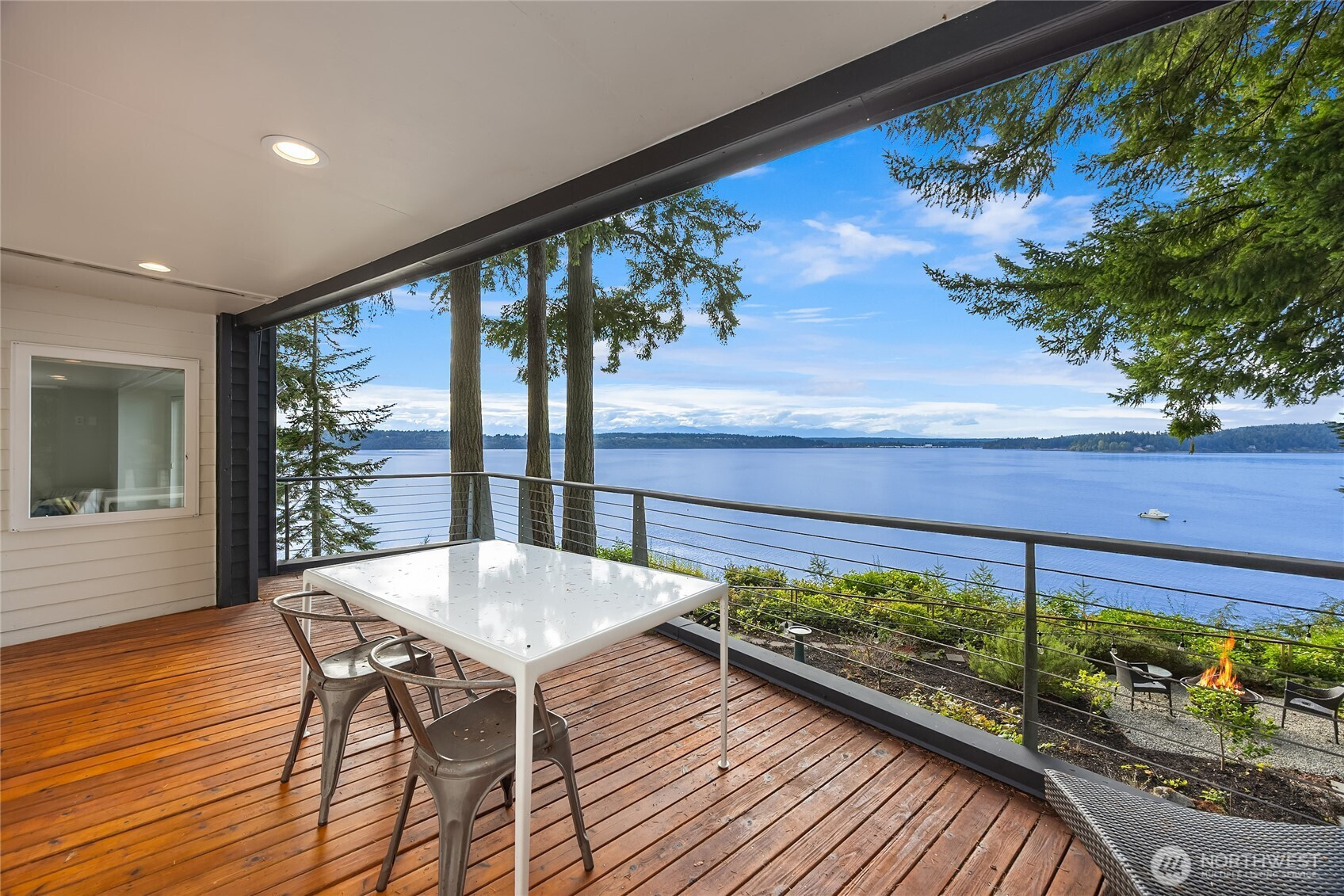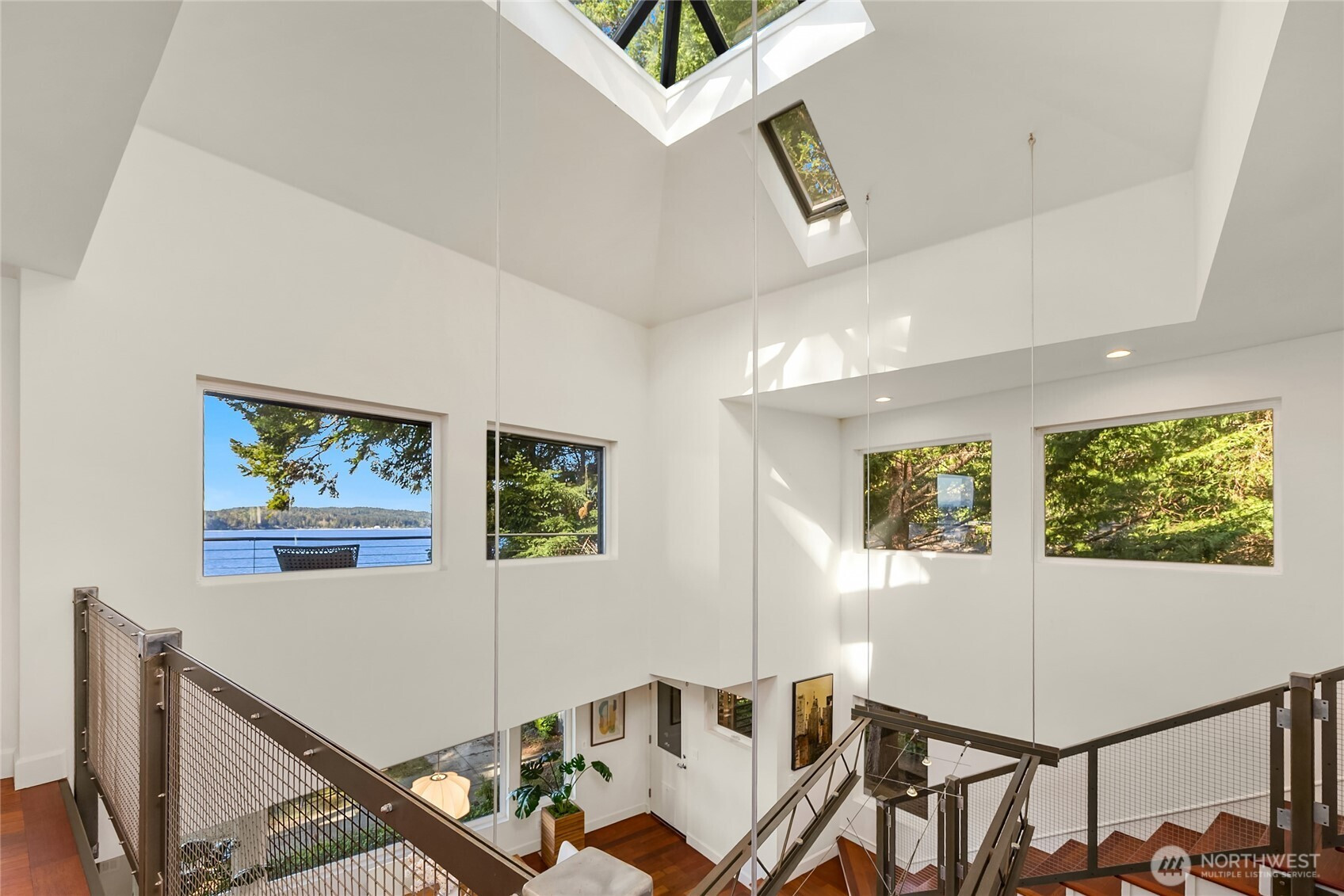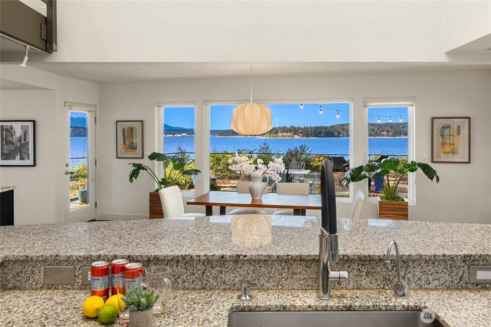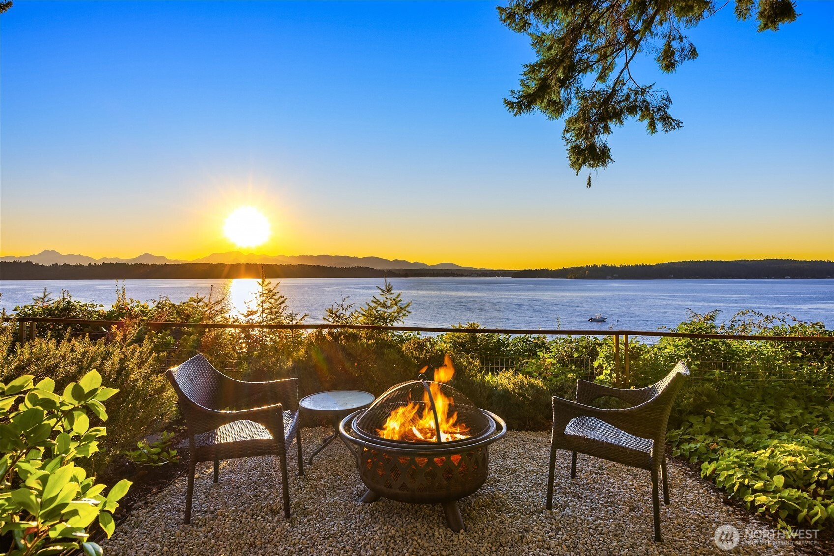A refined expression of post-modernism by renowned Seattle architect John Brenneis, set in a stunning waterfront setting with sweeping Olympic Mountain and Puget Sound views from every room, abundant natural light, and unforgettable sunsets. Masterfully designed for both style and function, the airy open floor plan centers around a dramatic 2-story kitchen and dining space crowned by a pyramidal skylight. The layout offers 3 ensuite bedrooms plus an office, including a spacious primary suite with dual walk-in closets, a spa-like bathroom, and a private deck. The spacious main level invites indoor-outdoor living, with seamless access to the fully fenced waterside patio and landscaped yard, set against sweeping water and mountain views. Follow the solid beach stairs to your own ±90 feet of bulkheaded shoreline, dotted with oysters and anchored by a distinctive natural boulder, a rarity along Bainbridge’s shoreline, with your own deep-water mooring buoy for days on the water. Set on a quiet street with a tree-lined approach, the property includes partial ownership in the 4.7-acre forested lot across the road. In the highly sought-after Arrow Point neighborhood, an active island lifestyle is just a stroll away at Battle Point Park, offering 90 acres of open space, trails, ponds, summer concerts, and sports courts (pickleball, basketball, soccer, softball, tennis). A rare opportunity for those drawn to modern design, an active lifestyle, and waterfront living.