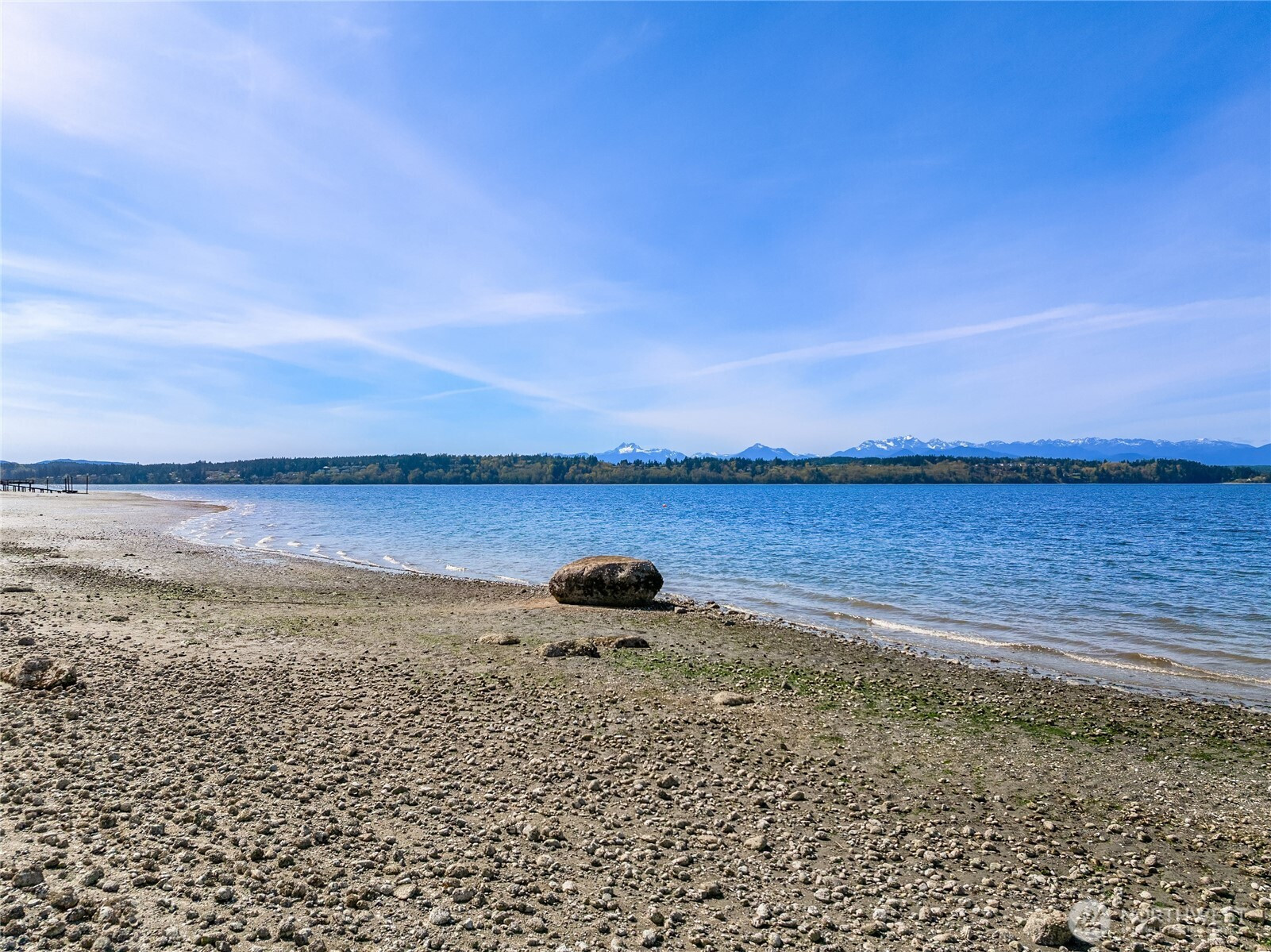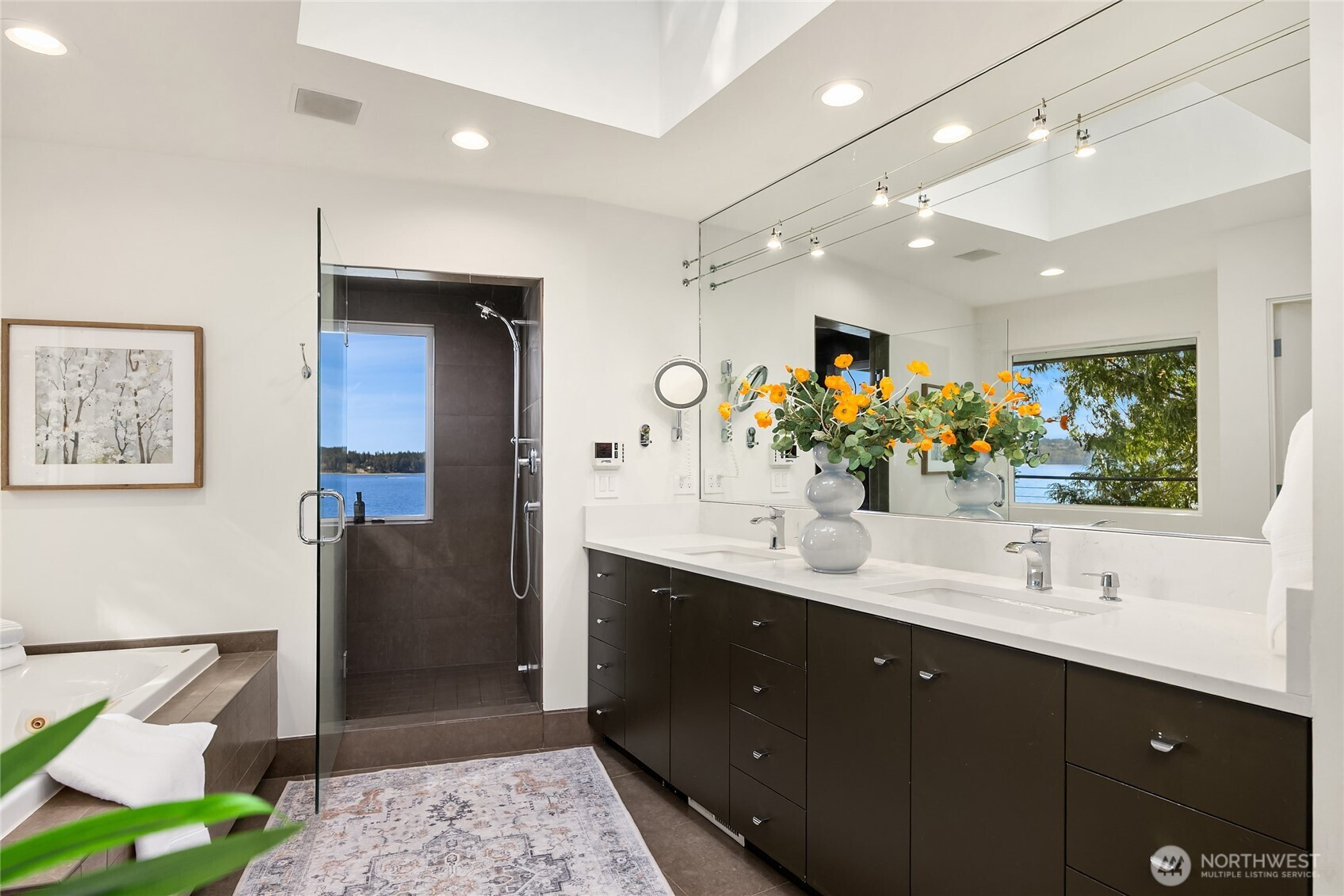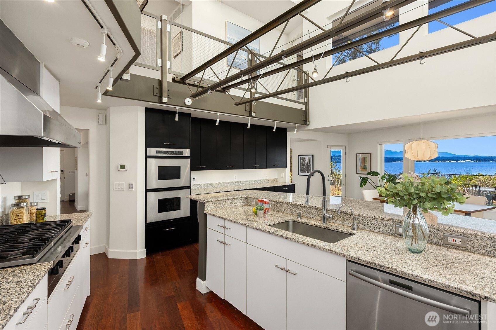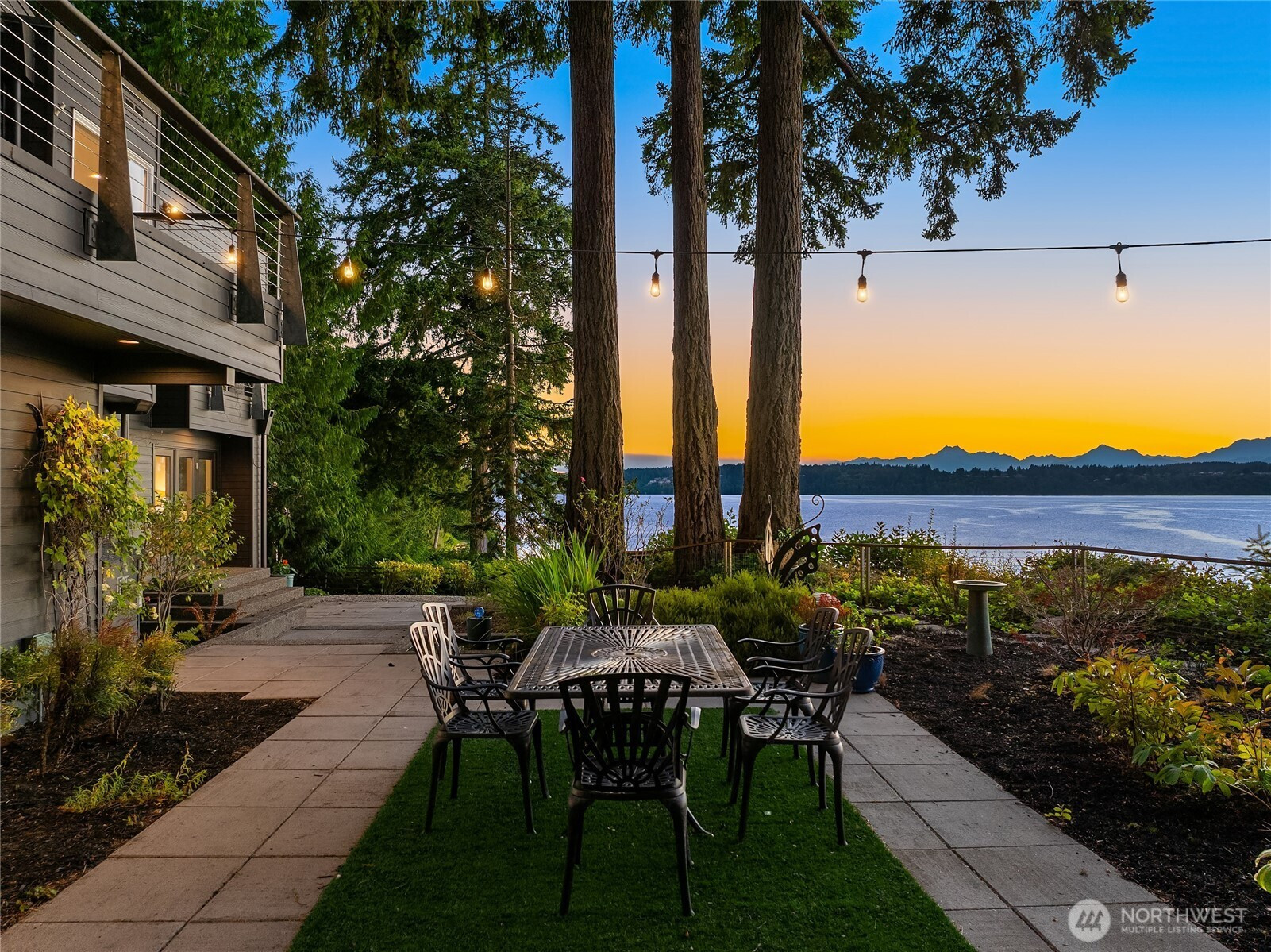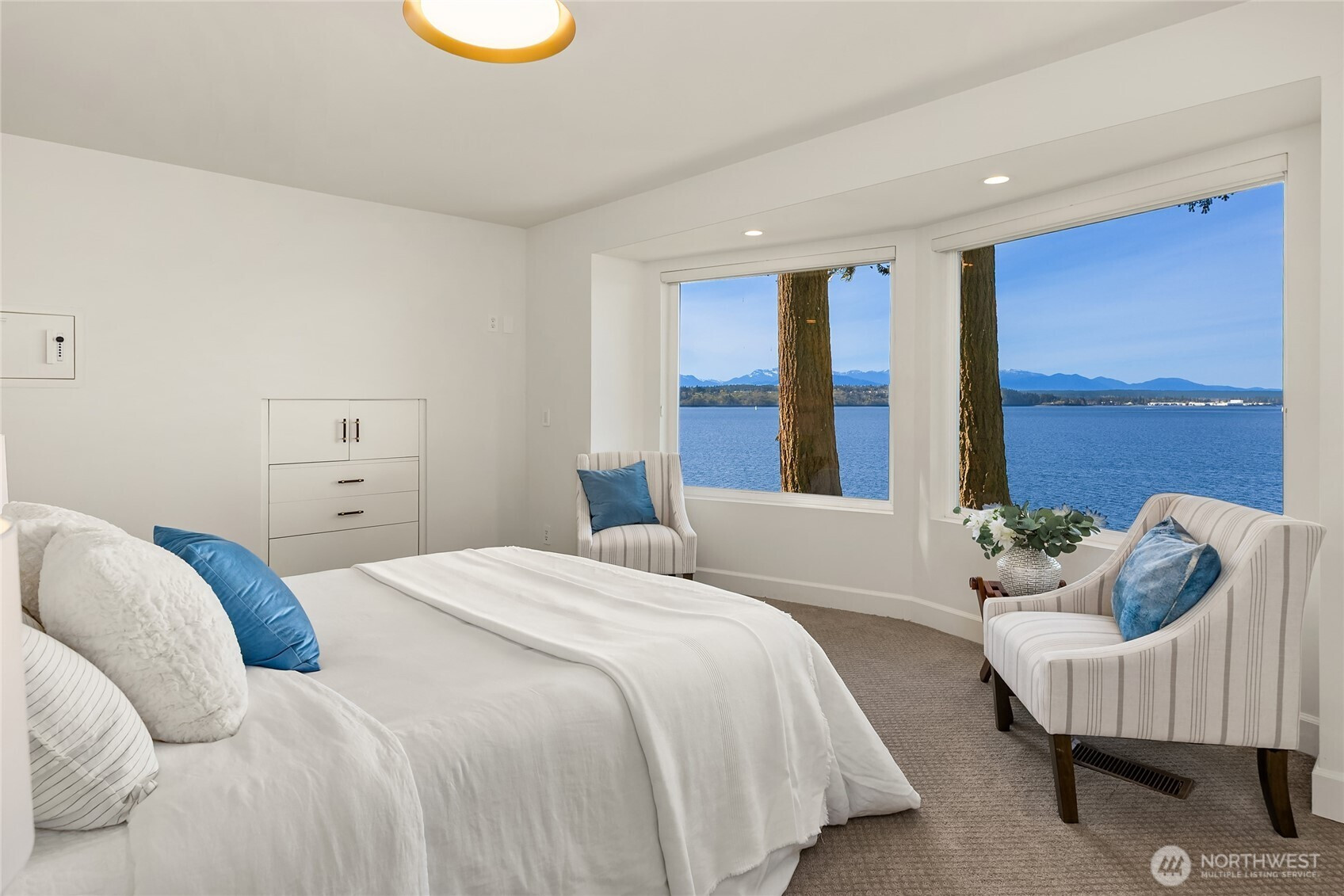 A refined expression of post-modernism by renowned Seattle architect John Brenneis, set in a stunning waterfront setting with sweeping Olympic Mountain and Puget Sound views from every room, abundant natural light, and unforgettable sunsets. Masterfully designed for both style and function, the airy open floor plan centers around a dramatic 2-story kitchen and dining space crowned by a pyramidal skylight. The layout offers 3 ensuite bedrooms plus an office, including a spacious primary suite with dual walk-in closets, a spa-like bathroom, and a private deck. The spacious main level invites indoor-outdoor living, with seamless access to the fully fenced waterside patio and landscaped yard, set against sweeping water and mountain views. Follow the solid beach stairs to your own ±90 feet of bulkheaded shoreline, dotted with oysters and anchored by a distinctive natural boulder, a rarity along Bainbridge’s shoreline, with your own deep-water mooring buoy for days on the water. Set on a quiet street with a tree-lined approach, the property includes partial ownership in the 4.7-acre forested lot across the road. In the highly sought-after Arrow Point neighborhood, an active island lifestyle is just a stroll away at Battle Point Park, offering 90 acres of open space, trails, ponds, summer concerts, and sports courts (pickleball, basketball, soccer, softball, tennis). A rare opportunity for those drawn to modern design, an active lifestyle, and waterfront living.