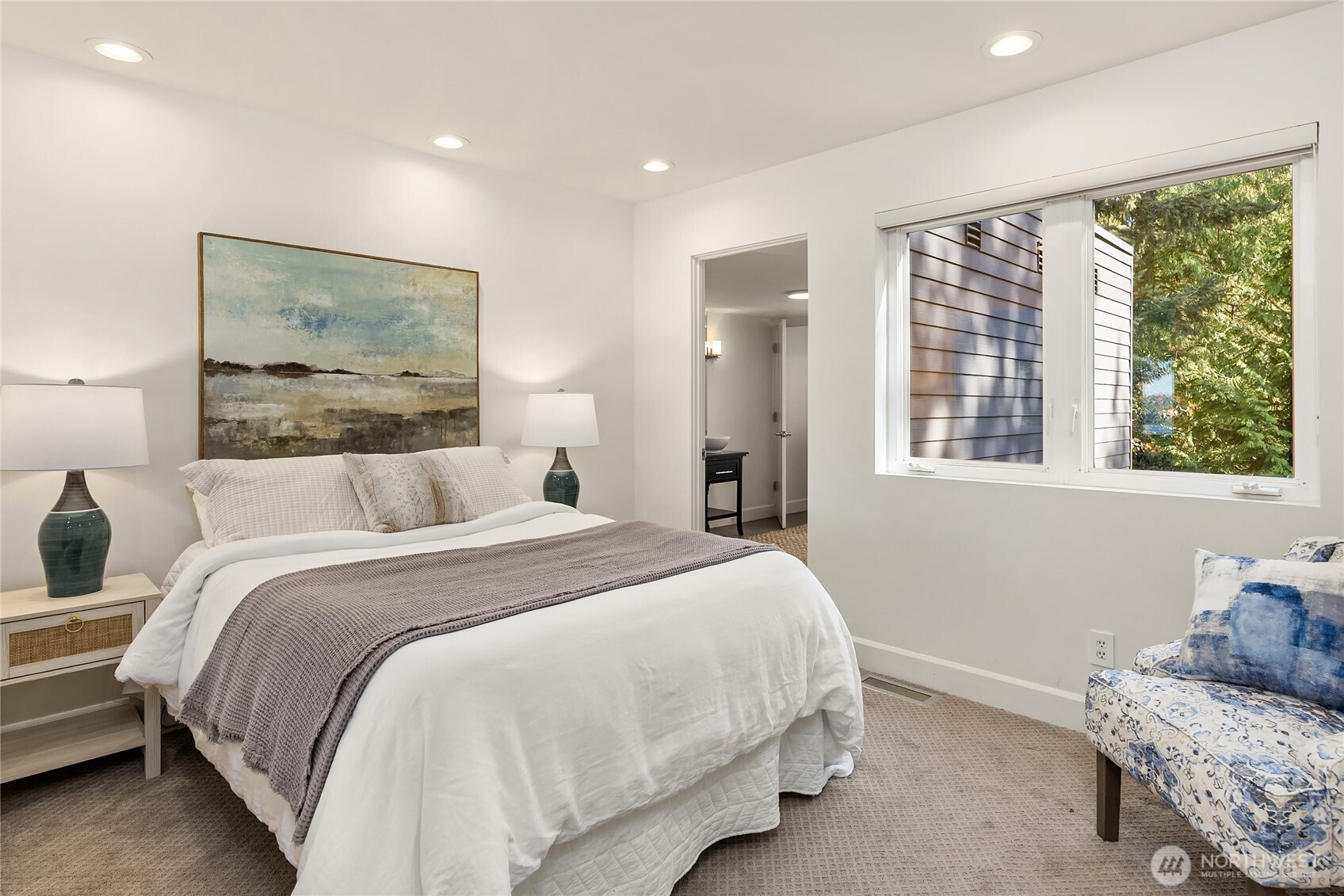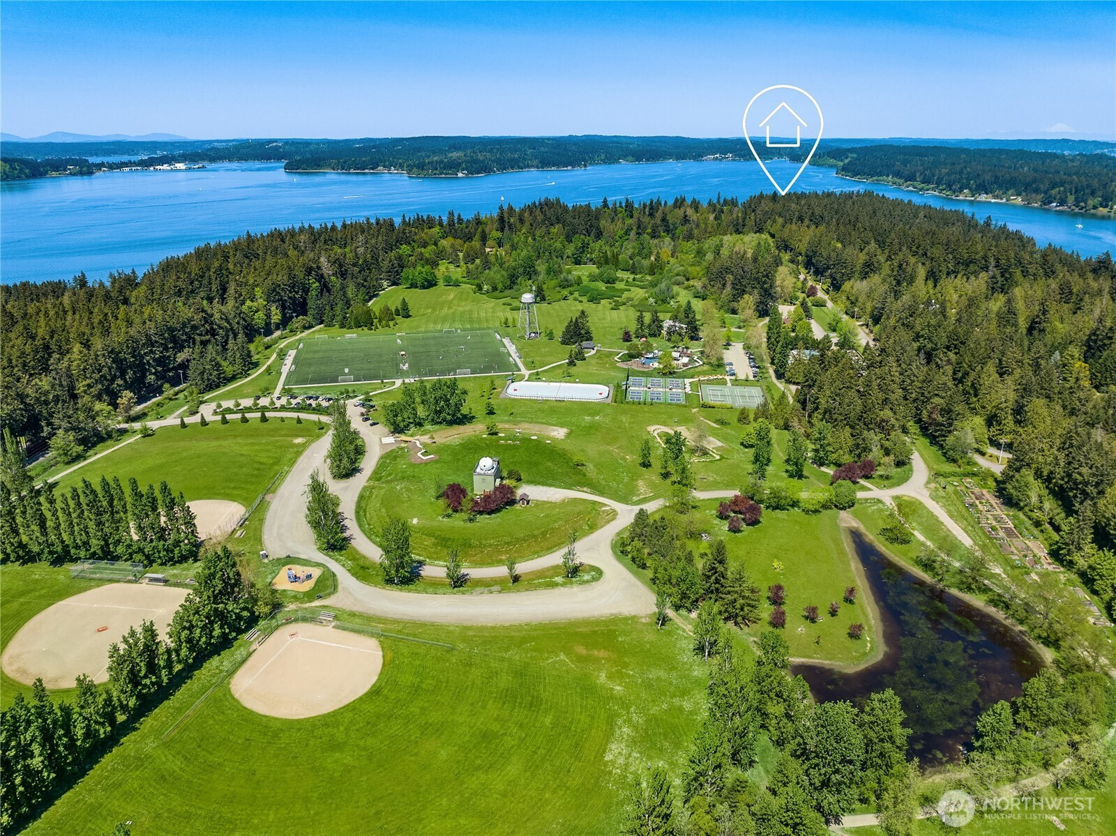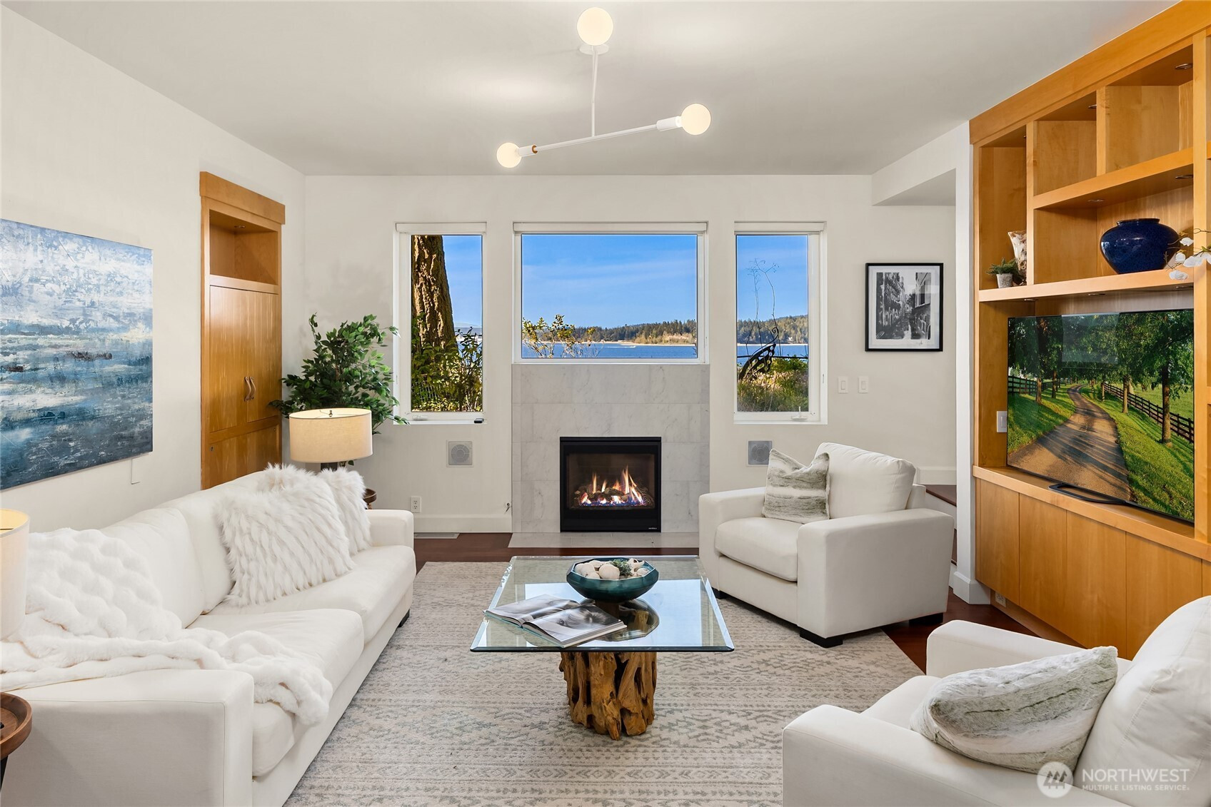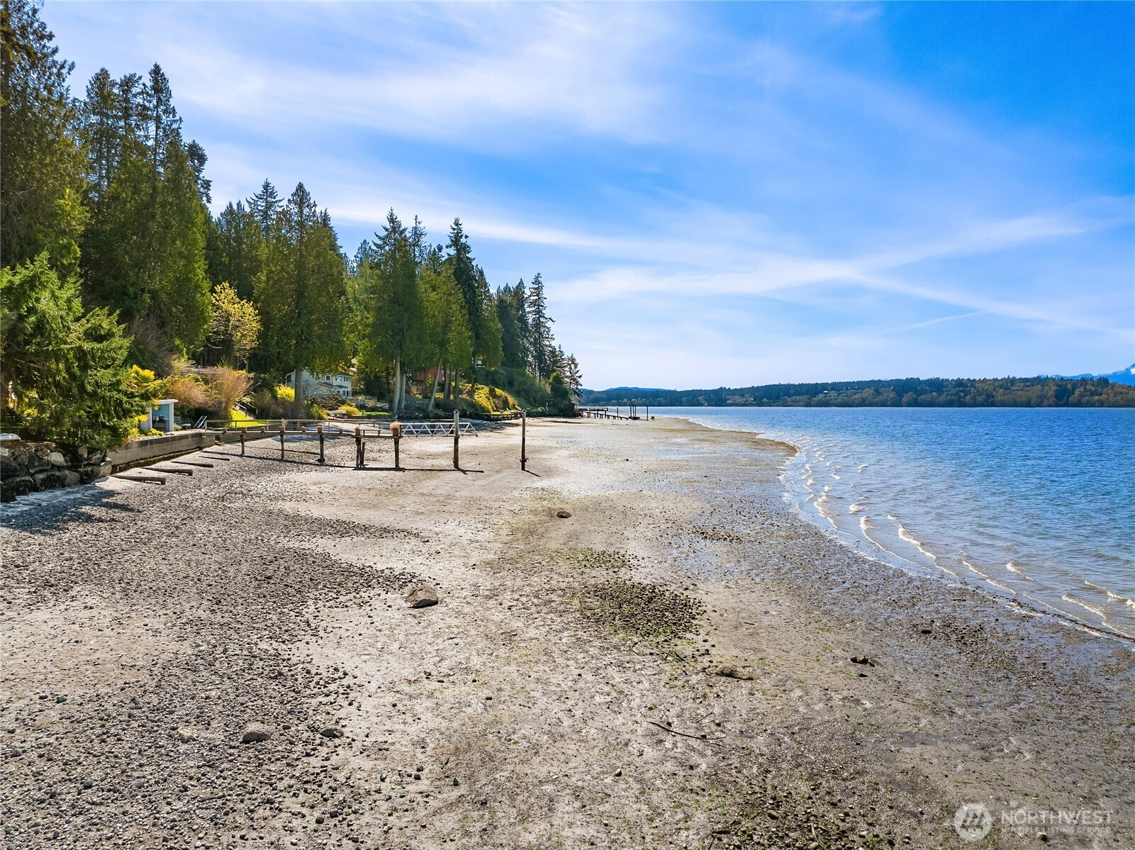 A refined expression of post-modernism by renowned Seattle architect John Brenneis, set in a stunning waterfront setting with sweeping Olympic Mountain and Puget Sound views from every room, abundant natural light, and unforgettable sunsets. Masterfully designed for both style and function, the airy open floor plan centers around a dramatic 2-story kitchen and dining space crowned by a pyramidal skylight. The layout offers 3 ensuite bedrooms plus an office, including a spacious primary suite with dual walk-in closets, a spa-like bathroom, and a private deck. The spacious main level invites indoor-outdoor living, with seamless access to the fully fenced waterside patio and landscaped yard, set against sweeping water and mountain views. Follow the solid beach stairs to your own ±90 feet of bulkheaded shoreline, dotted with oysters and anchored by a distinctive natural boulder, a rarity along Bainbridge’s shoreline, with your own deep-water mooring buoy for days on the water. Set on a quiet street with a tree-lined approach, the property includes partial ownership in the 4.7-acre forested lot across the road. In the highly sought-after Arrow Point neighborhood, an active island lifestyle is just a stroll away at Battle Point Park, offering 90 acres of open space, trails, ponds, summer concerts, and sports courts (pickleball, basketball, soccer, softball, tennis). A rare opportunity for those drawn to modern design, an active lifestyle, and waterfront living.