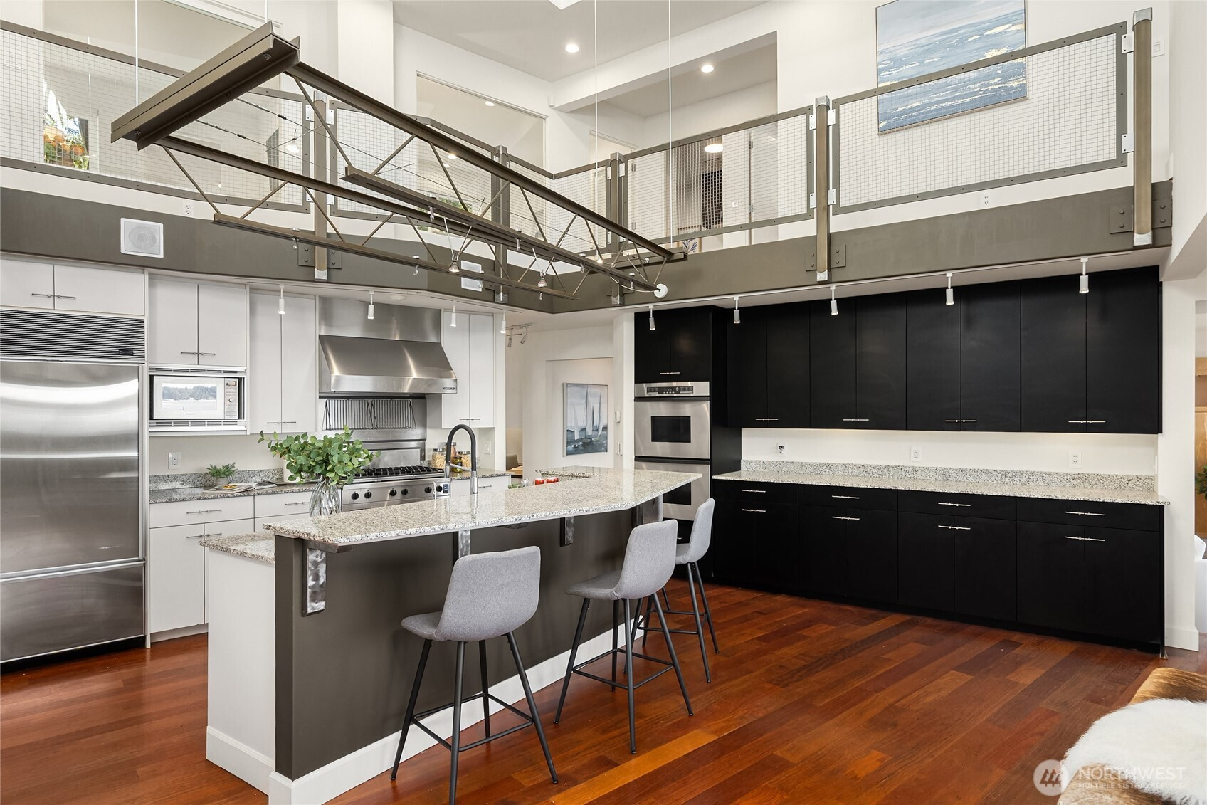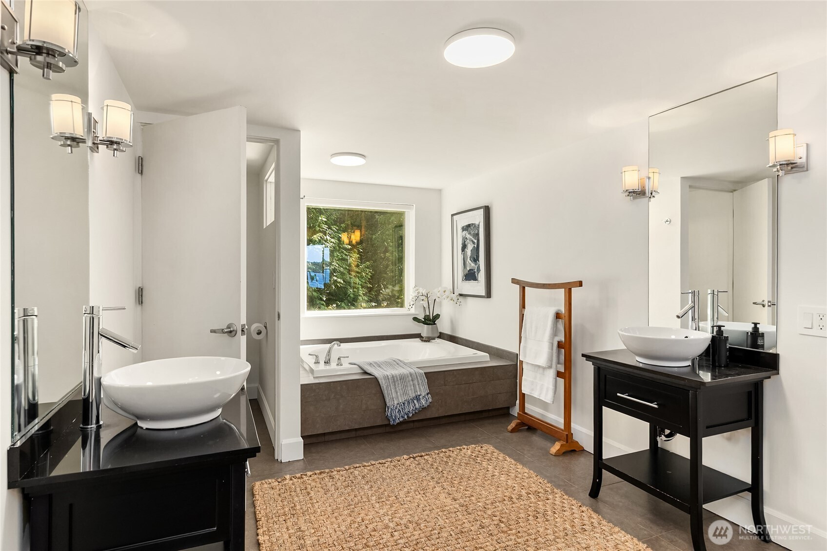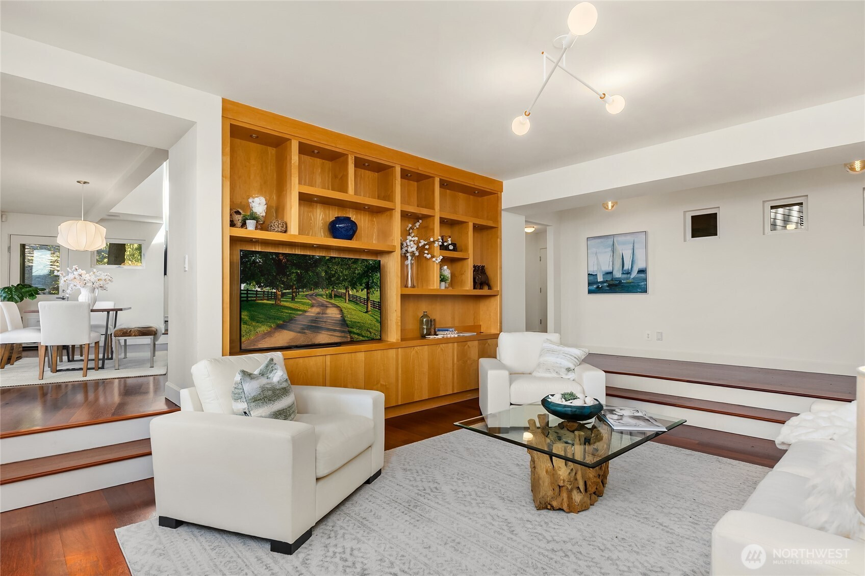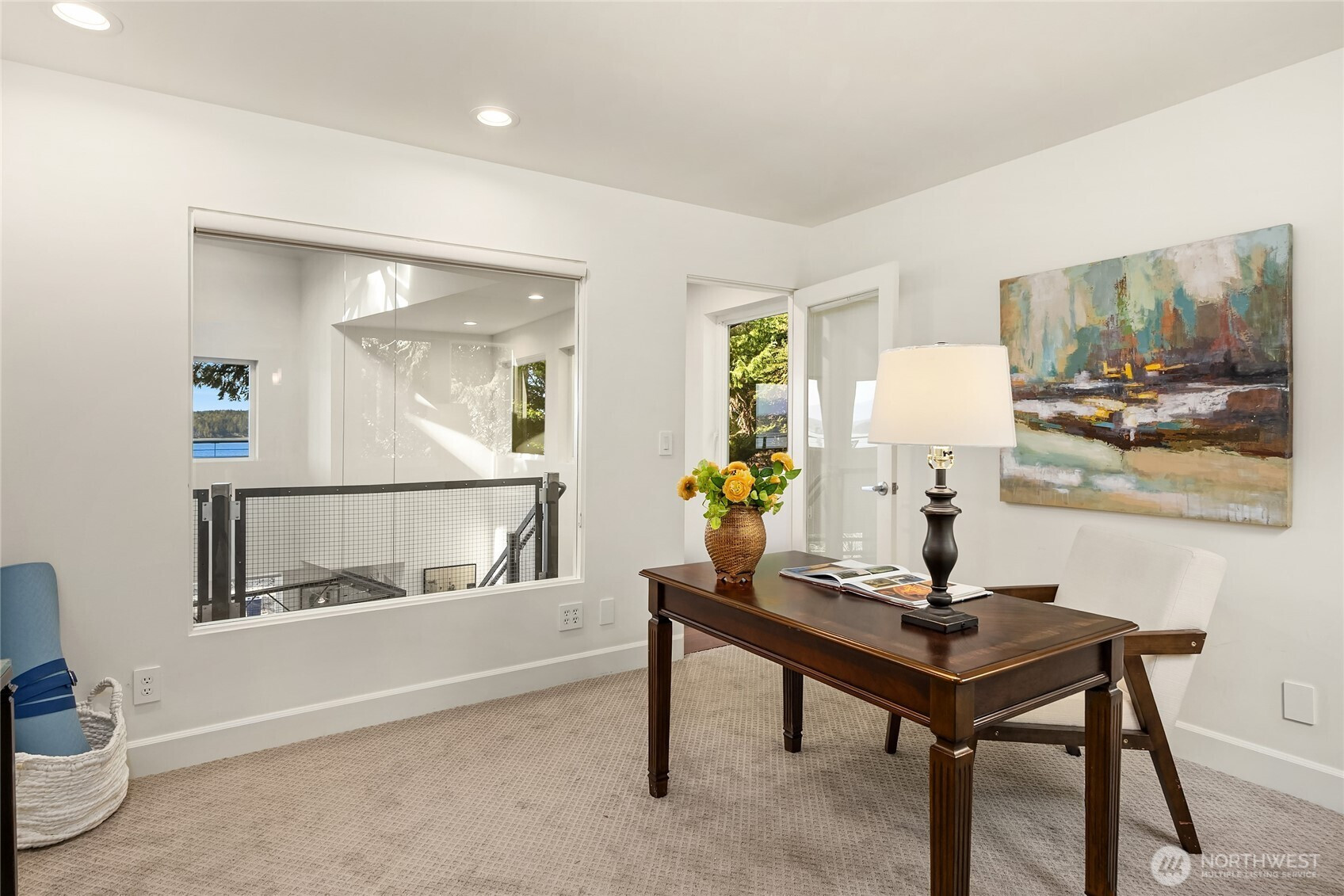 A refined expression of post-modernism by renowned Seattle architect John Brenneis, set in a stunning waterfront setting with sweeping Olympic Mountain and Puget Sound views from every room, abundant natural light, and unforgettable sunsets. Masterfully designed for both style and function, the airy open floor plan centers around a dramatic 2-story kitchen and dining space crowned by a pyramidal skylight. The layout offers 3 ensuite bedrooms plus an office, including a spacious primary suite with dual walk-in closets, a spa-like bathroom, and a private deck. The spacious main level invites indoor-outdoor living, with seamless access to the fully fenced waterside patio and landscaped yard, set against sweeping water and mountain views. Follow the solid beach stairs to your own ±90 feet of bulkheaded shoreline, dotted with oysters and anchored by a distinctive natural boulder, a rarity along Bainbridge’s shoreline, with your own deep-water mooring buoy for days on the water. Set on a quiet street with a tree-lined approach, the property includes partial ownership in the 4.7-acre forested lot across the road. In the highly sought-after Arrow Point neighborhood, an active island lifestyle is just a stroll away at Battle Point Park, offering 90 acres of open space, trails, ponds, summer concerts, and sports courts (pickleball, basketball, soccer, softball, tennis). A rare opportunity for those drawn to modern design, an active lifestyle, and waterfront living.