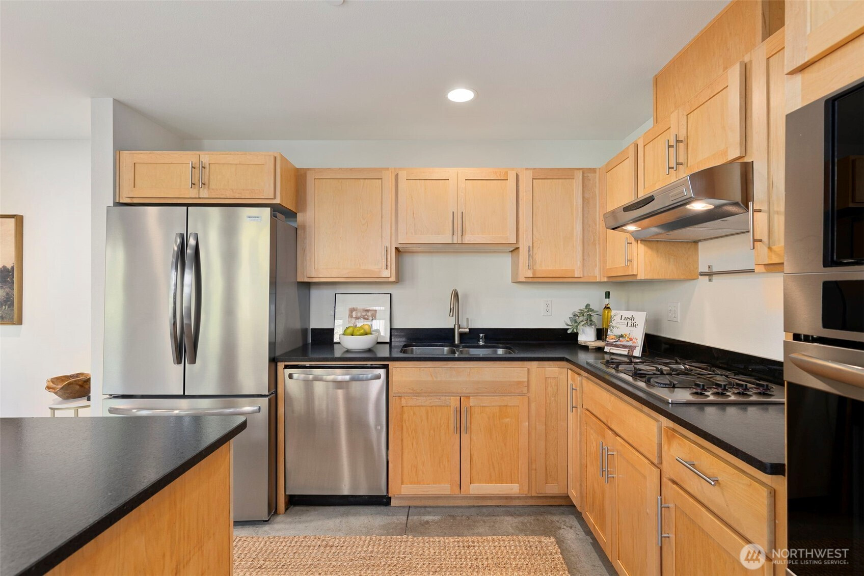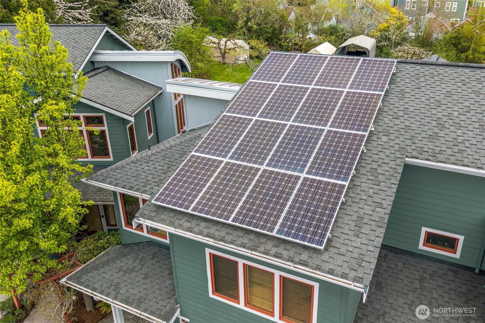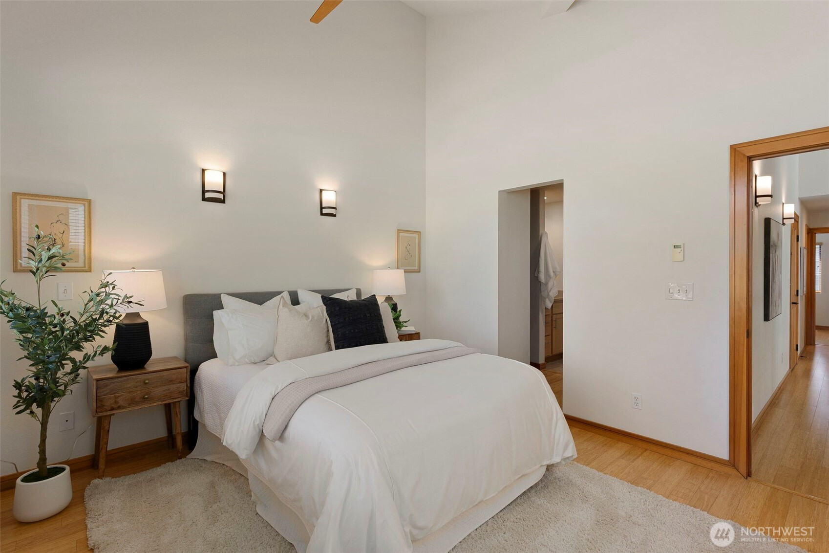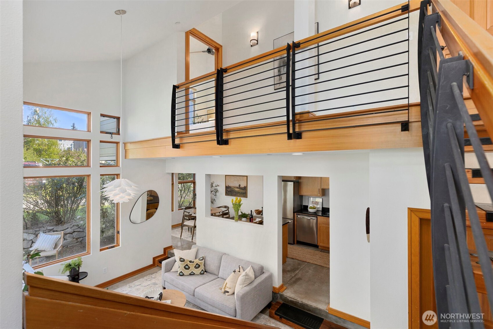 Tucked just off Madison Avenue, this Winslow townhome offers genuine walkability to town without the feel of being in it. Soaring cathedral ceilings and walls of windows give the main floor a scale and light that's rare in a townhome. Radiant-heated concrete floors run the main level, anchored by a propane fireplace and a kitchen with maple cabinetry, honed granite countertops, a generous island, and dining access to a private garden patio. Upstairs, heated bamboo floors carry through the upper level. The primary suite includes an en suite bath, marble countertops, and a California Closets walk-through system. Two additional bedrooms and a full bath complete the upper level — one bedroom could easily serve as a home office. The private patio extends living space year-round. Rooftop solar, a fire sprinkler system, and updated kitchen appliances reflect a home that's been thoughtfully maintained. A one-car garage rounds out the practical side — covered parking and storage this close to Winslow is a genuine advantage. One block from everything Winslow has to offer, tucked into a peaceful enclave — convenience without compromise!