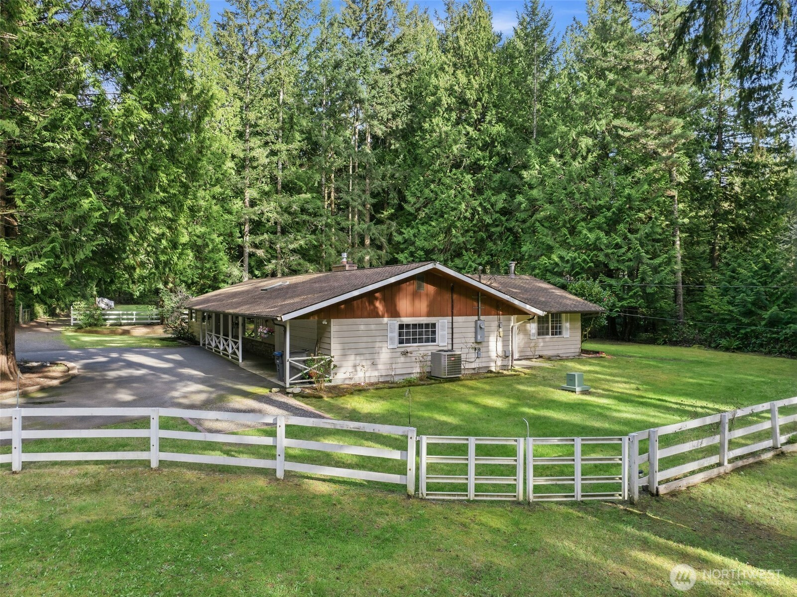 A Central Valley landmark, Mini Whinny Farm sits on a park-like 2.39 acres with mature trees and landscaping. The spacious 2000 sqft ranch style home includes 2 bedrooms, 3 bathrooms and several flex rooms. The level property boasts a three stall barn with electric and water and two large, fenced pastures. In addition, there are multiple outbuildings with power and a private back patio for outdoor entertaining. A PNW highly sought after feature, a private paved drive, grants access to a secluded paradise. The location is convenient to bases, shopping, hospitals and ferries.