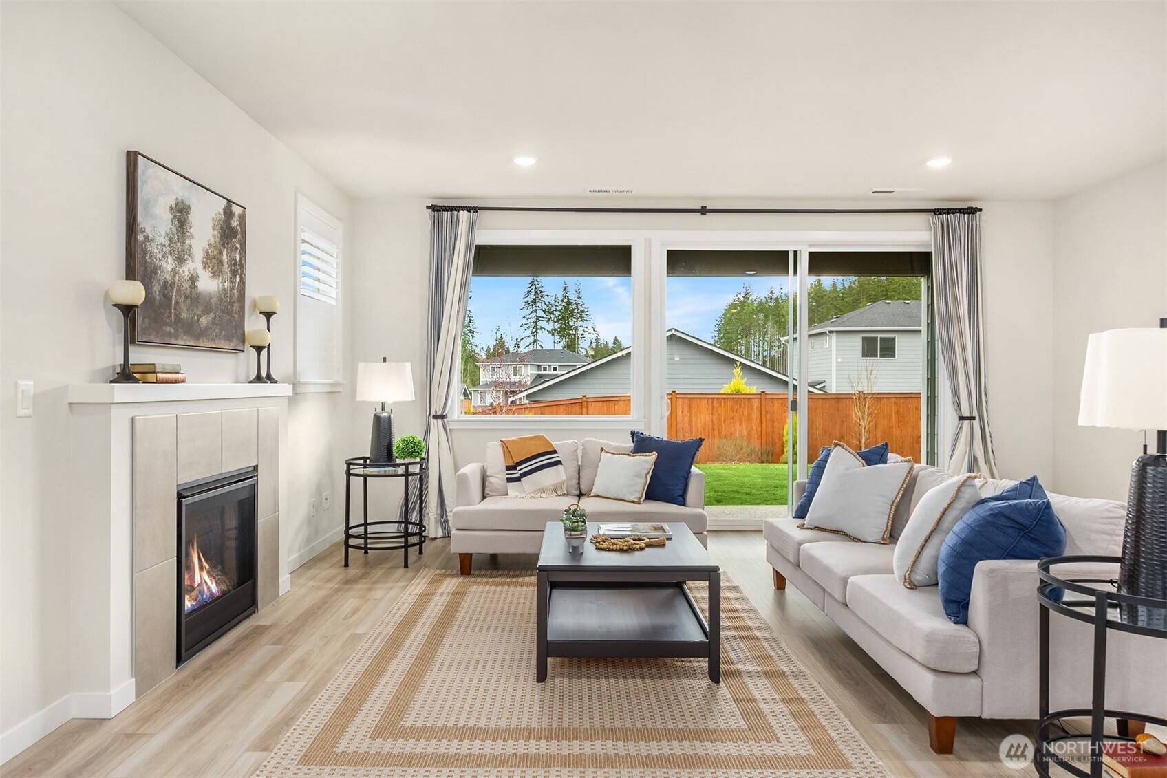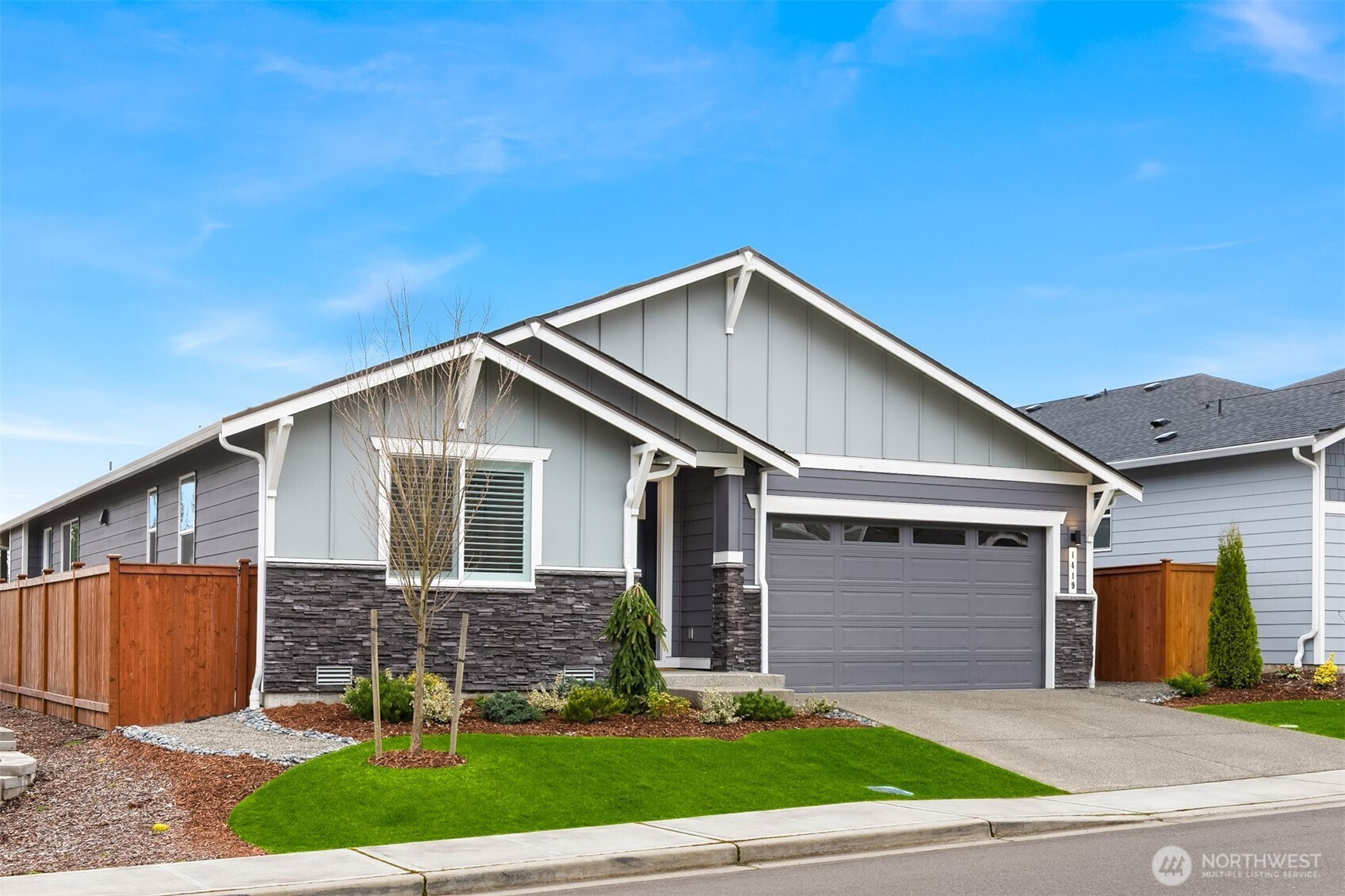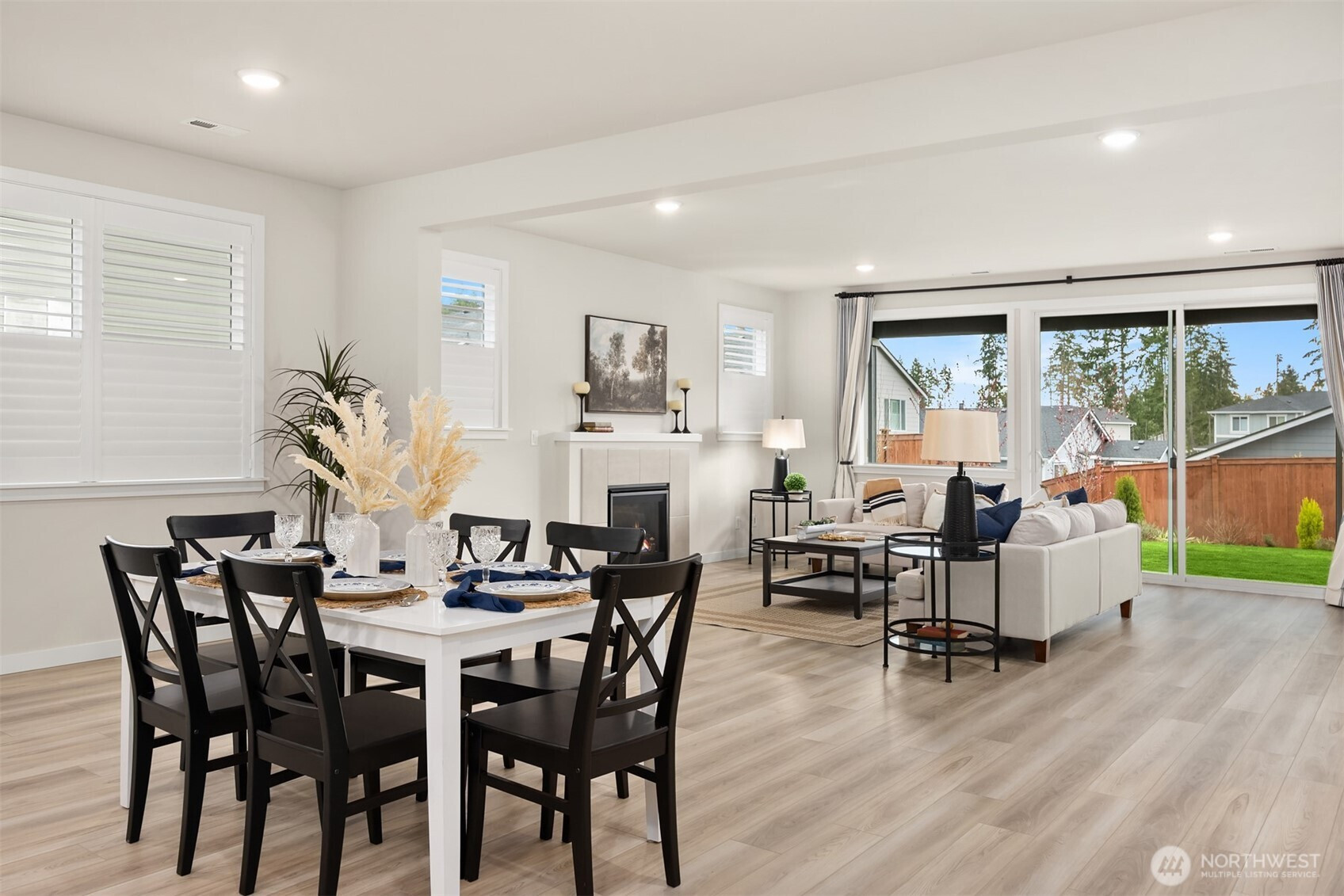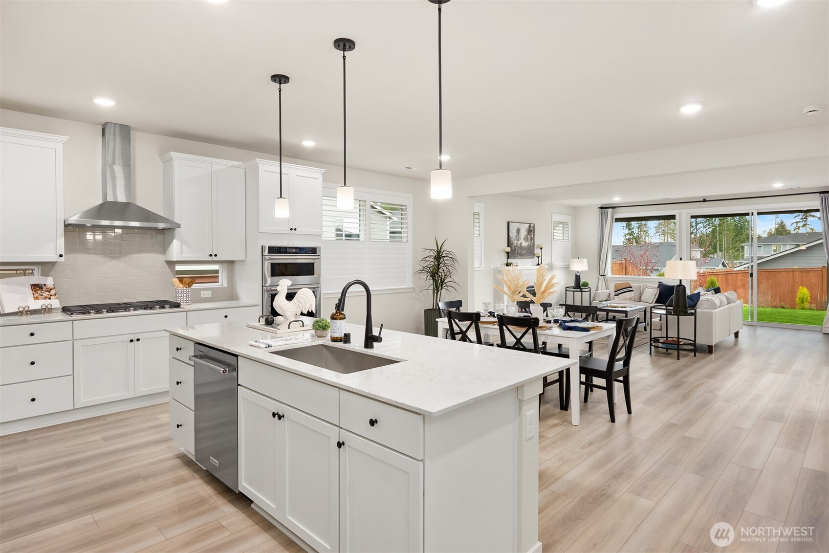 Immaculate Move-In Ready Rambler! This impeccably designed 2,237 SF, 3-bedroom, 2-bath one story home showcases sophisticated living with a light-filled, open-concept layout and soaring ceilings. At the heart of the home, the chef’s kitchen impresses with an expansive island, white soft-close, dovetail cabinetry, quartz countertops, full-height subway tile backsplash, gas cooktop, built-in wall oven, and a generous walk-in pantry. The elegant great room features a gas fireplace and seamless access to a covered outdoor living space, complete with a BBQ gas stub—perfect for effortless indoor-outdoor entertaining or just a place to relax with your morning coffee. Beautifully landscaped, sunny yard that is private, fully fenced, and has a new sprinkler system. The serene primary suite offers a spa-caliber bath with a beautifully tiled walk-in shower, built-in bench, and frameless glass enclosure. Thoughtfully curated finishes include matte black fixtures, wrapped interior windows, and designer touches throughout. Additional upgrades that elevate the home are plantation shutters, epoxy-finished garage flooring, luxury vinyl planked flooring, and spacious cabinets and sink in the laundry room. Ideally located near schools with convenient access to Naval Base Kitsap, Keyport, downtown Poulsbo, and both Kingston and Bainbridge ferries.