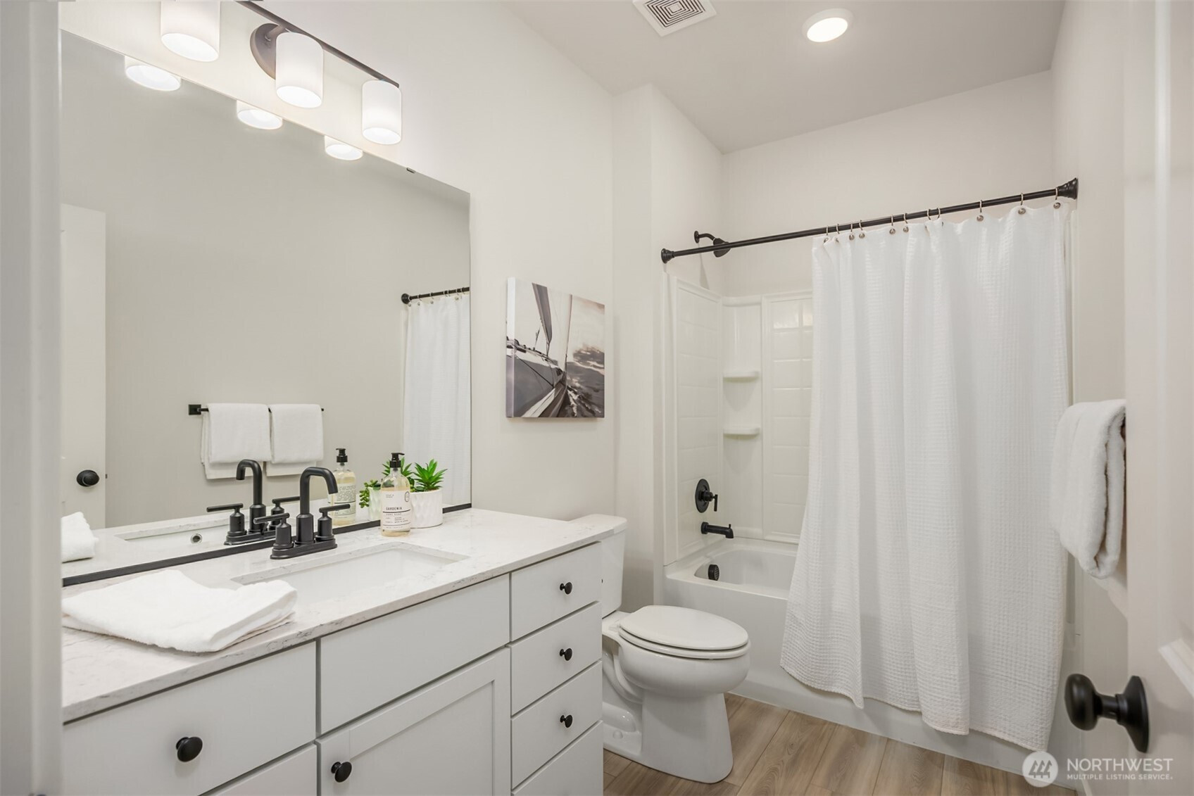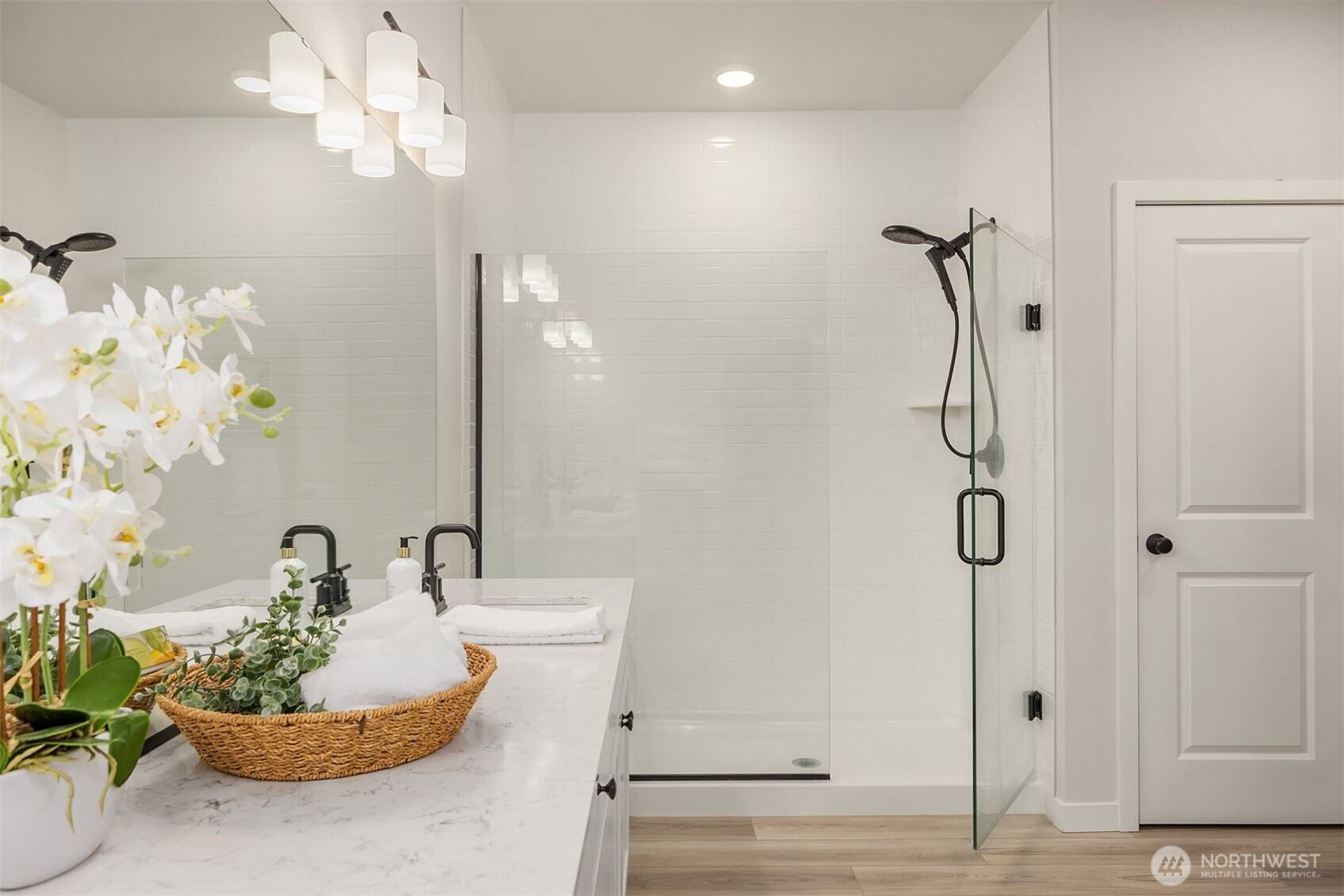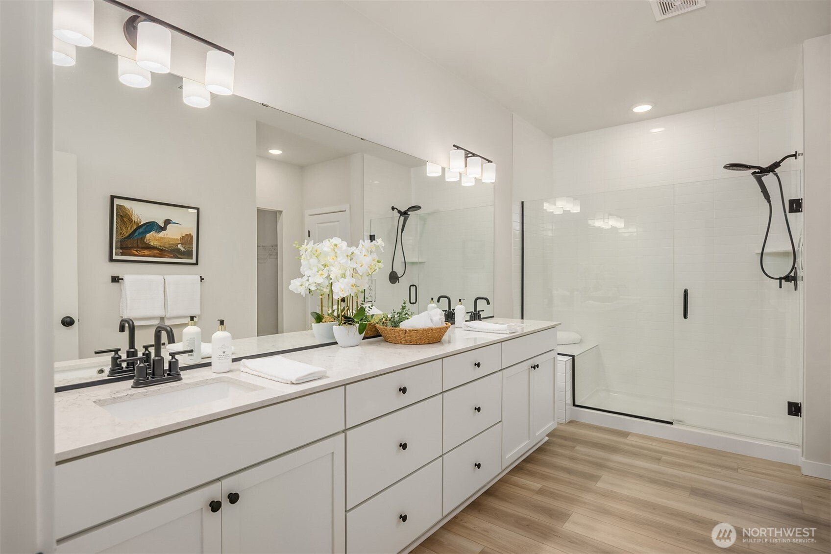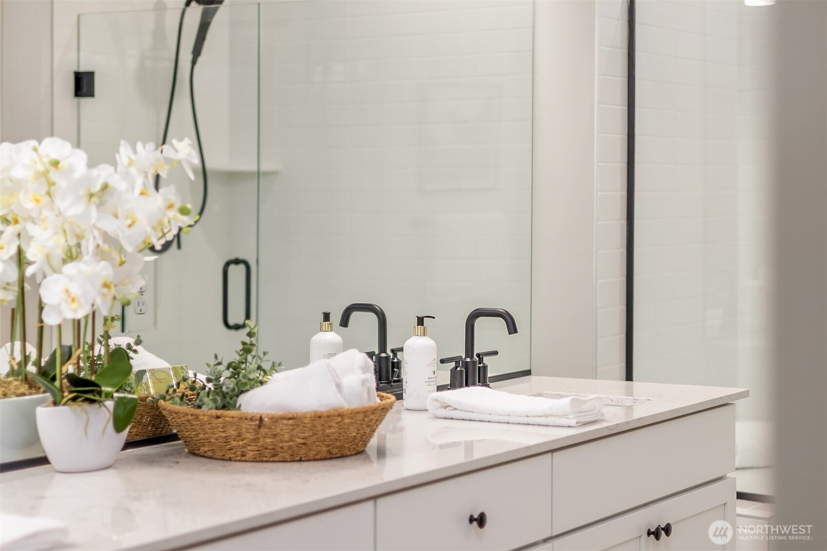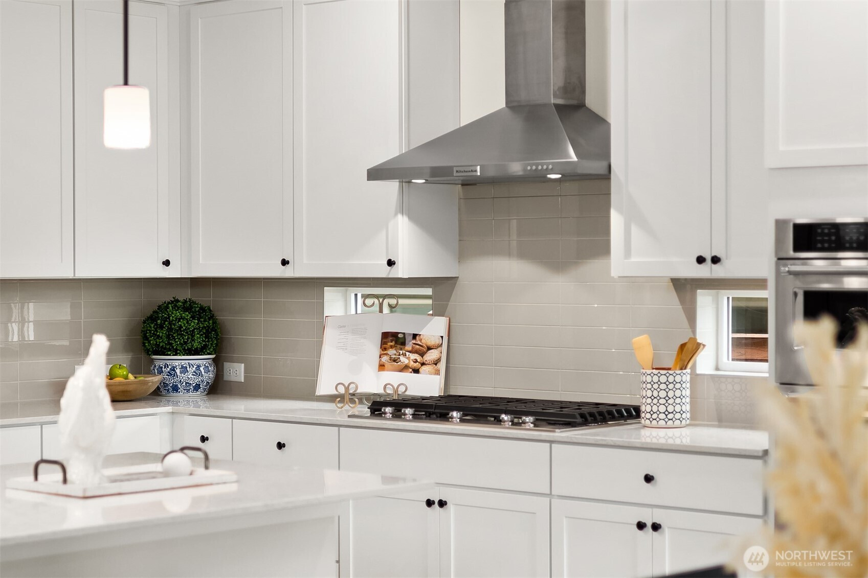 Immaculate Move-In Ready Rambler! This impeccably designed 2,237 SF, 3-bedroom, 2-bath one story home showcases sophisticated living with a light-filled, open-concept layout and soaring ceilings. At the heart of the home, the chef’s kitchen impresses with an expansive island, white soft-close, dovetail cabinetry, quartz countertops, full-height subway tile backsplash, gas cooktop, built-in wall oven, and a generous walk-in pantry. The elegant great room features a gas fireplace and seamless access to a covered outdoor living space, complete with a BBQ gas stub—perfect for effortless indoor-outdoor entertaining or just a place to relax with your morning coffee. Beautifully landscaped, sunny yard that is private, fully fenced, and has a new sprinkler system. The serene primary suite offers a spa-caliber bath with a beautifully tiled walk-in shower, built-in bench, and frameless glass enclosure. Thoughtfully curated finishes include matte black fixtures, wrapped interior windows, and designer touches throughout. Additional upgrades that elevate the home are plantation shutters, epoxy-finished garage flooring, luxury vinyl planked flooring, and spacious cabinets and sink in the laundry room. Ideally located near schools with convenient access to Naval Base Kitsap, Keyport, downtown Poulsbo, and both Kingston and Bainbridge ferries.