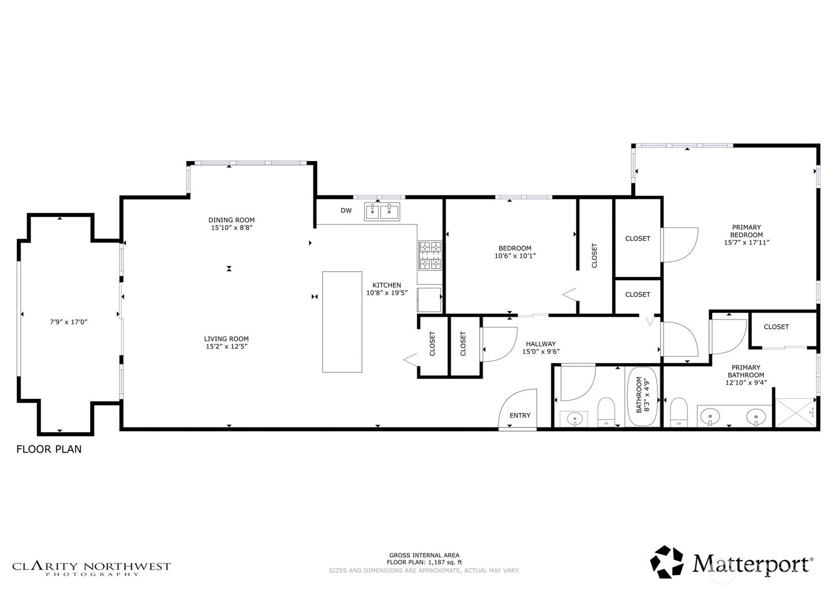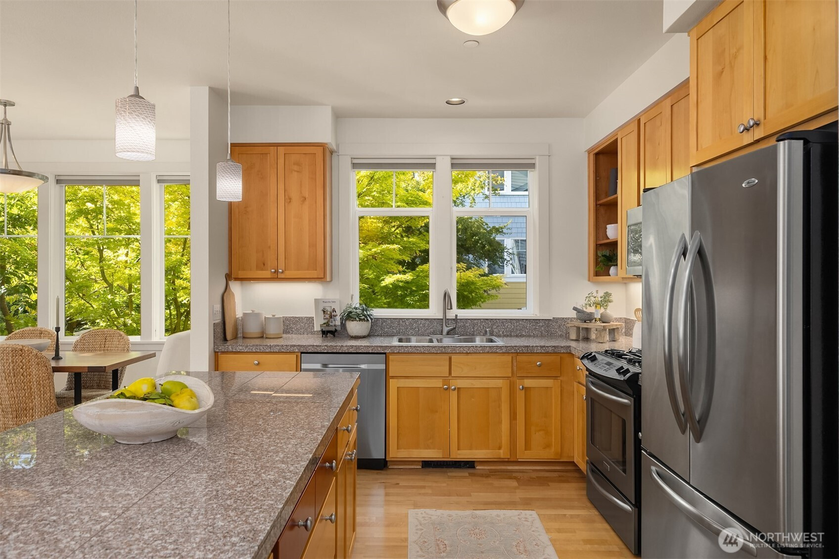 Beautiful Two-Bedroom Madrone Village Condo! Enjoy easy access from the secure main-floor lobby or via elevator from the parking garage to the front door of this quality one-level home. The chef’s kitchen anchors the great room and features granite tile counters, a dual-fuel propane range, side-by-side refrigerator, stainless sink, dishwasher, breakfast counter, and maple cabinetry. The spacious primary suite includes a large walk-in closet, travertine dual vanity and built-in storage. The second bedroom is served by a ¾ bath. Enjoy maple floors, a covered balcony for indoor/outdoor living, and a custom propane fireplace. Stroll to the Bainbridge Performing Arts, restaurants, farmers market, Waterfront Park, the marina, and the ferry!