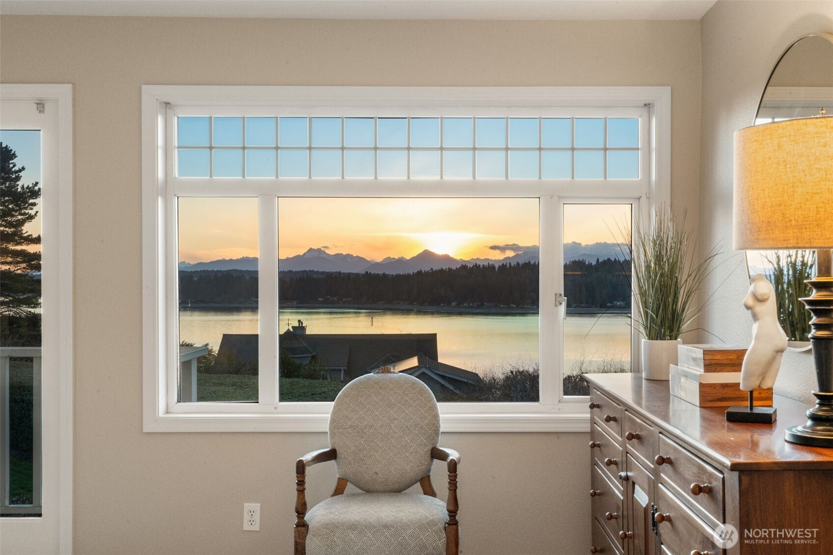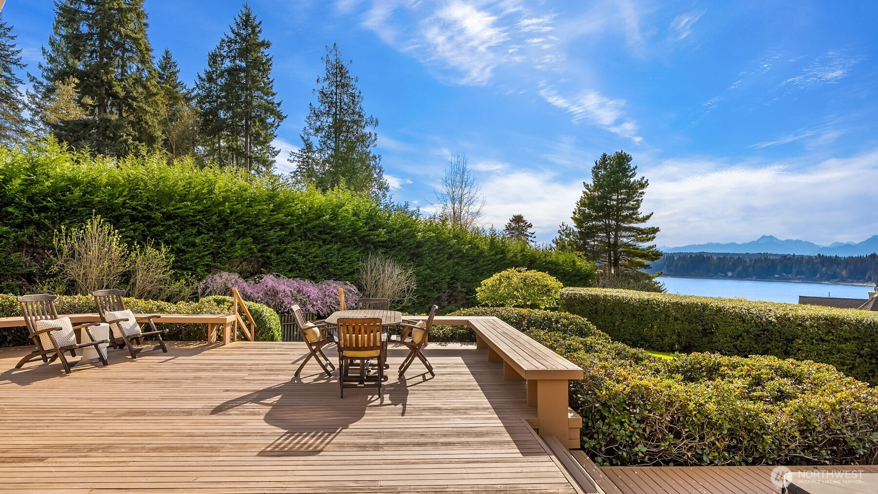 Tucked within an intimate six-home waterfront enclave in Manzanita, this private retreat captures breathtaking westerly views across Puget Sound to the Olympic Mountains. Each evening unfolds in a quiet display of color and light, creating an ever-changing backdrop. Set on .82 acres of curated grounds, the property offers lush lawns, specimen plantings, and thoughtfully designed gardens, along with organic beds for seasonal harvests. Outdoor living spaces invite connection—whether basking on the multi-level deck, hosting summer gatherings, or unwinding by the fireplace or in the hot tub beneath the stars. Inside, natural light pours through walls of glass and transom windows, illuminating vaulted clear cedar ceilings that bring warmth and texture. The main level flows with ease, offering open living spaces designed for both quiet moments and lively gatherings, all framed by uninterrupted views. A fireplace with natural rockwork adds character, while soft tones create a calm, airy feel. The upper-level primary suite features a private balcony with sweeping mountain and water views, vaulted ceilings, and a window-lined nook. The lower level offers a daylight walk-out with a bedroom, full bath, and flexible living space for guests. Protected view covenants preserve the outlook, and the community shares access to Agate Passage shoreline. Complete western privacy enhances the setting, just moments from the best of Bainbridge Island.