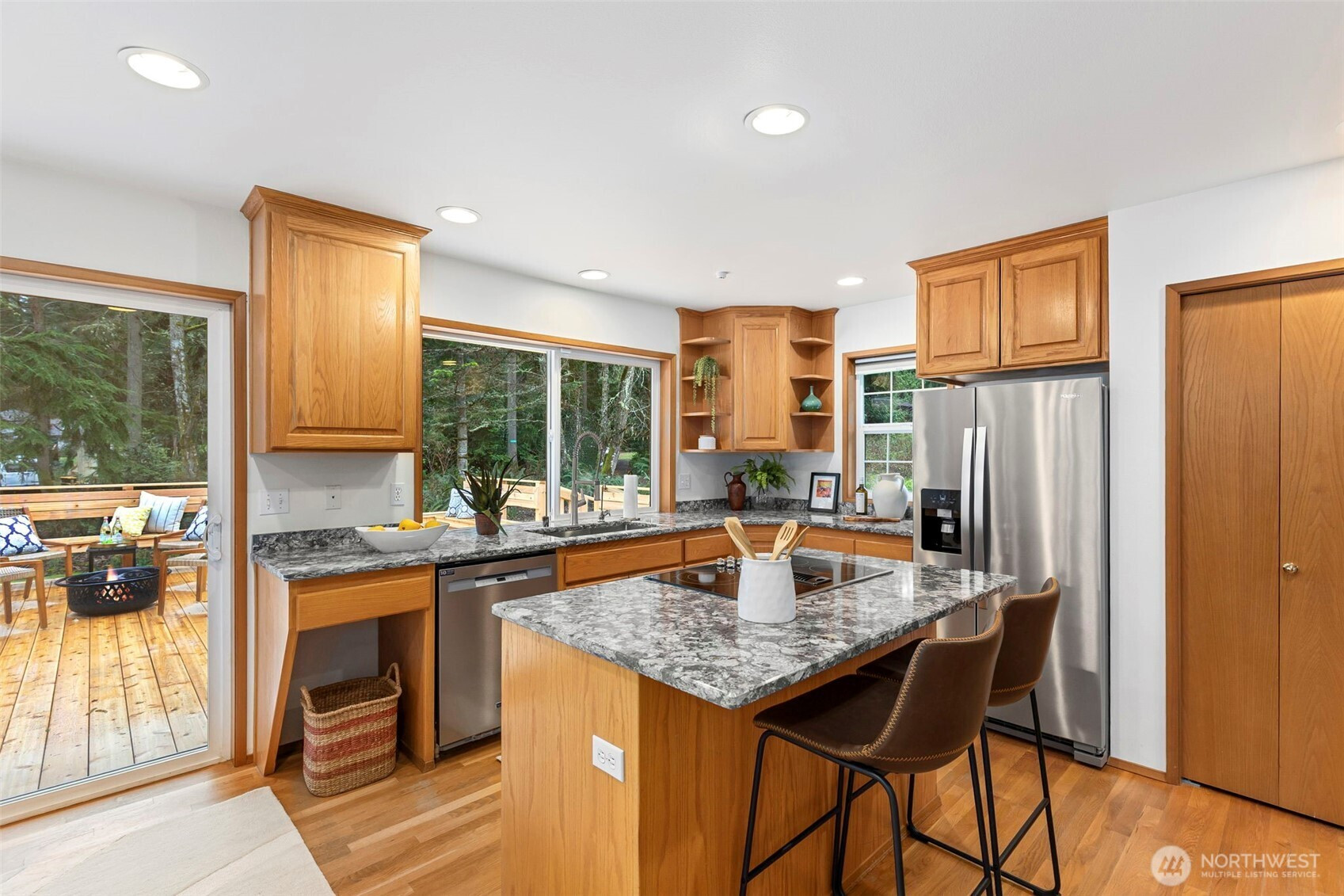 One story living at its best! Hardwood floors, new carpet, roof and paint. New spacious, beautiful deck with seating and planters for outdoor entertaining. Vaulted ceilings let in natural light, brick fireplace, granite countertops in the open kitchen with new cooktop in the island. Three bedrooms, one with french doors - perfect for an office. Separate two car garage, additional parking for RV / boat. Large laundry room with wonderful storage. Located across from Fay Bainbridge Park. Unfinished lower level with seperate entrance...come make this your own. Welcome Home!
