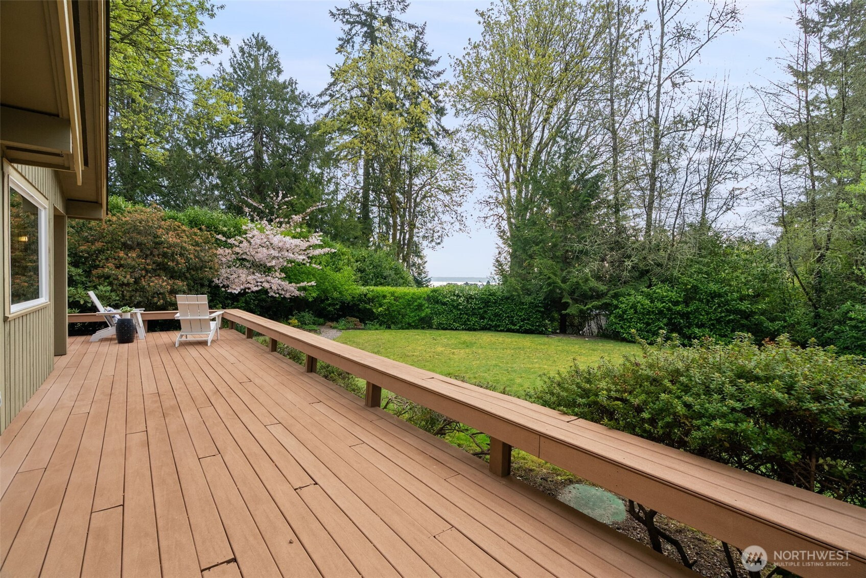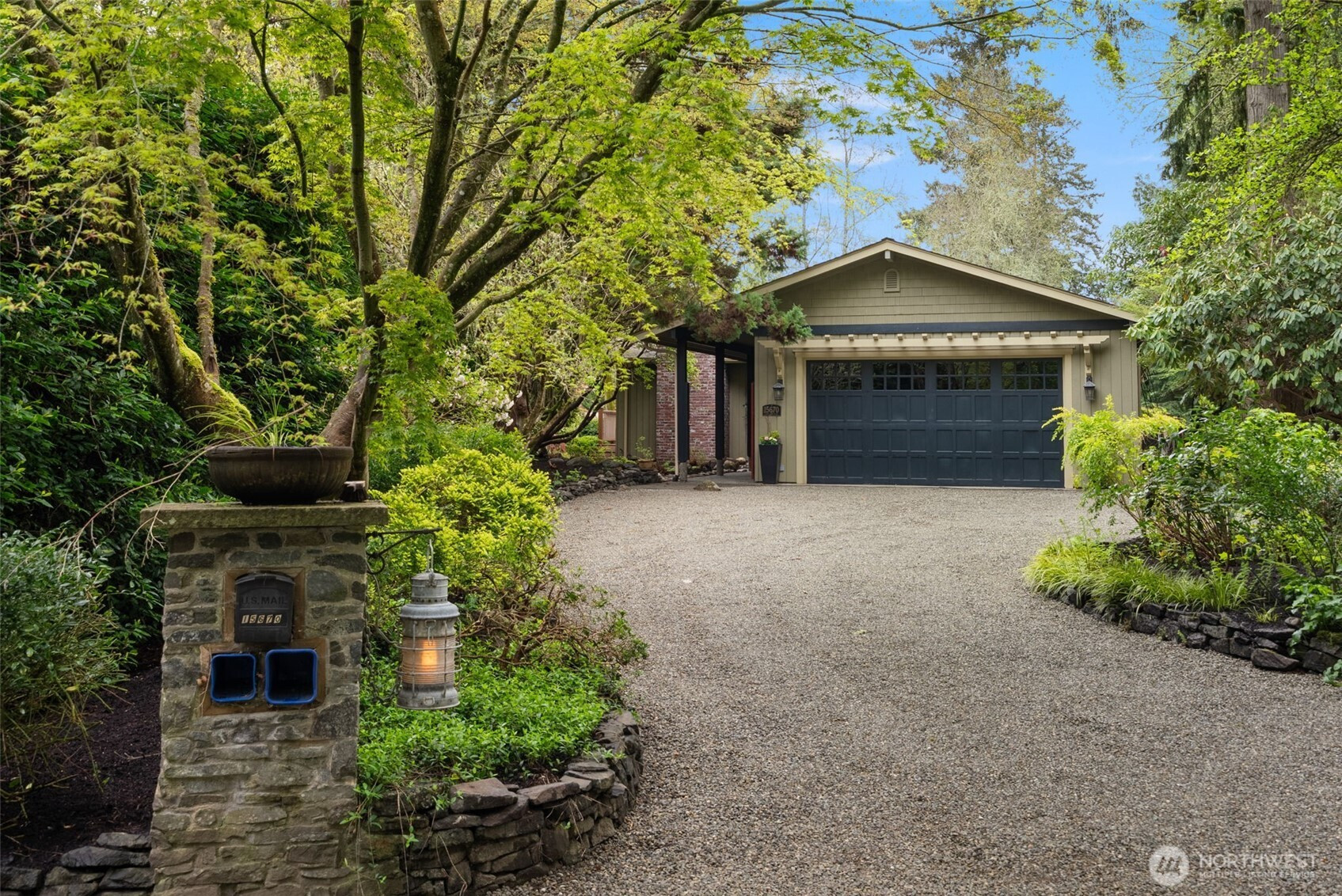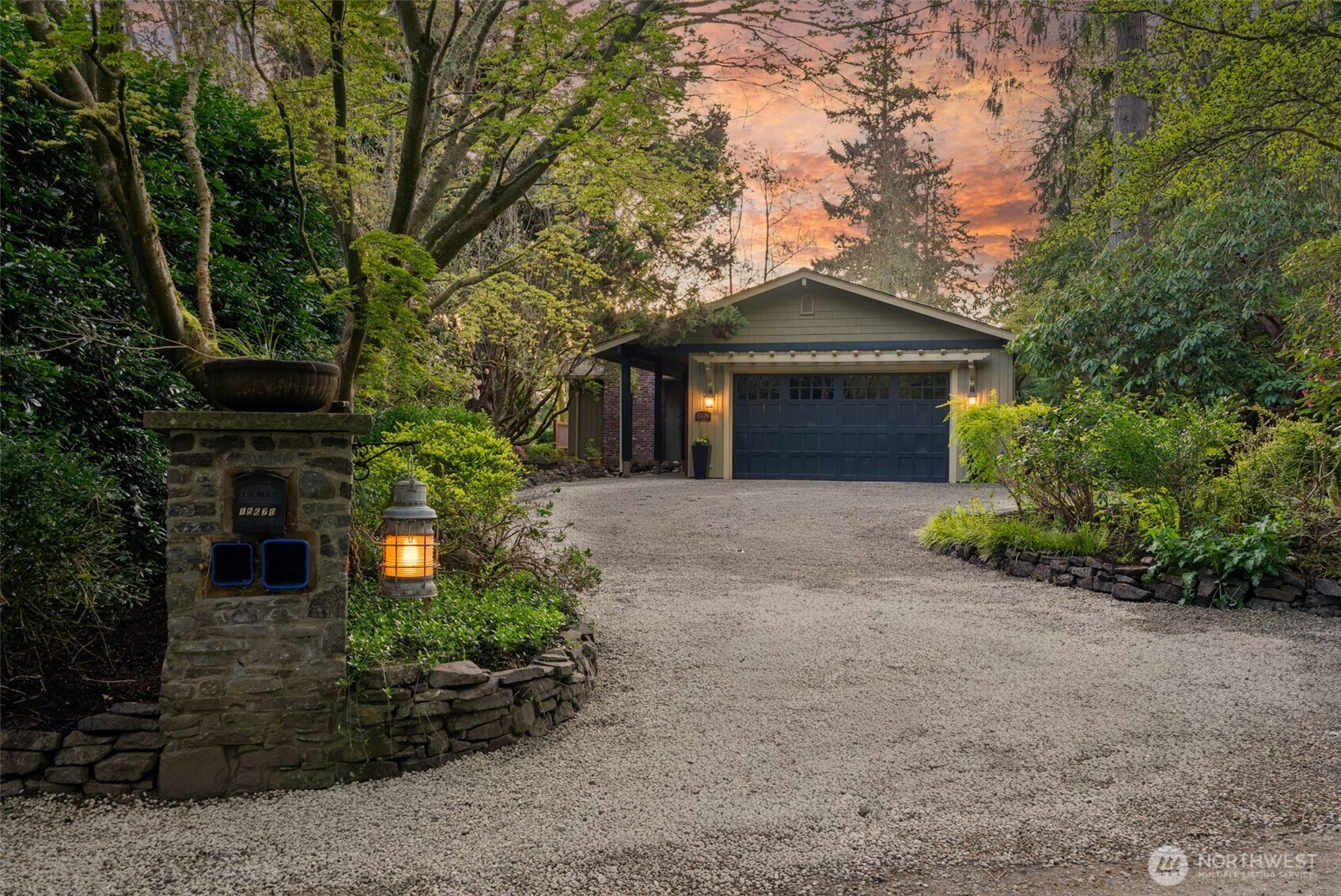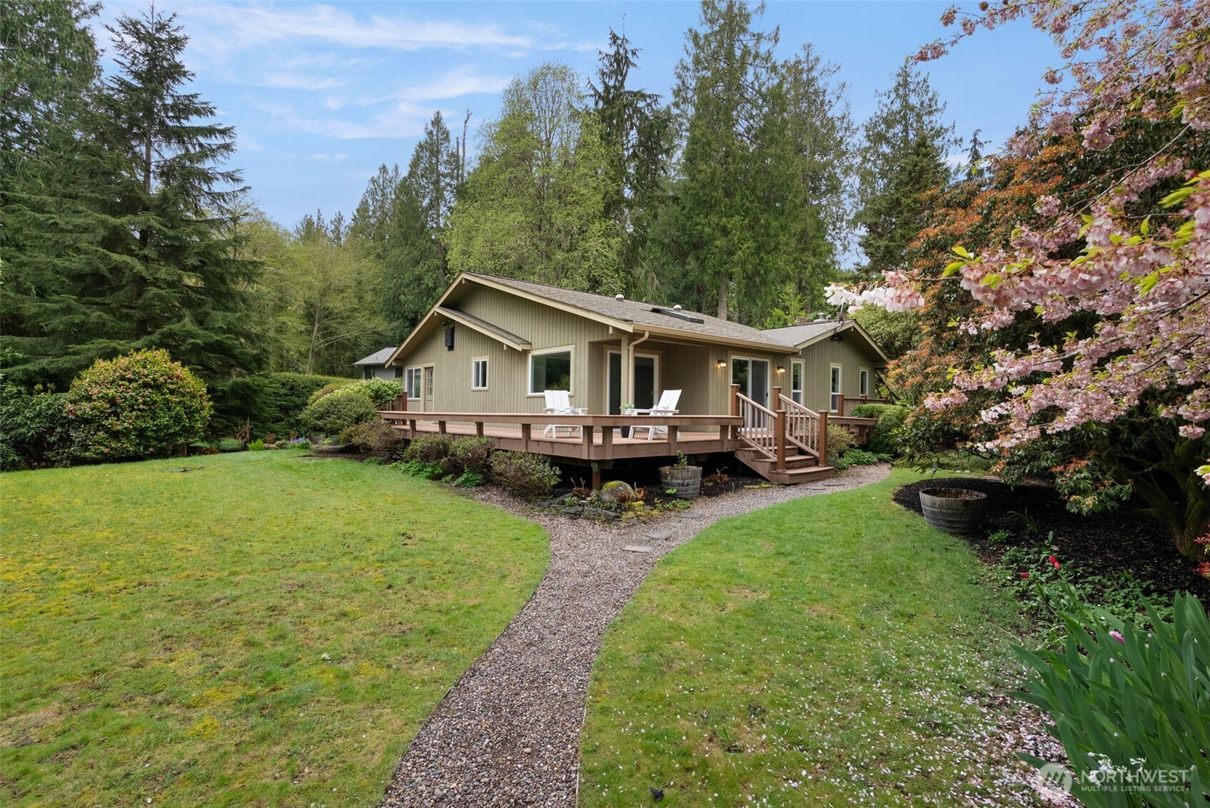 Tucked into the heart of historic Port Madison, this charming single-level home is set on a level half-acre with mature gardens and a circular drive, capturing a sense of ease and tranquility. Highly desirable Port Madison offers community members access to over 1,000 feet of private, pristine shoreline, a deepwater dock, a boat launch, and more than 40 forested acres of meandering, meditative trails. A cozy wood-burning stove, set in a custom brick surround, centers the living, dining, and sitting rooms. Two sliding glass doors open to the expansive wraparound deck, offering seamless indoor-outdoor living and views across the lawn and gardens to beautiful sunrises over Point Monroe. The gracious kitchen offers a breakfast bar, quartz counters, wood cabinets, a tile floor, and a garden-view window. The primary suite and second bedroom, each with a full bath, have new carpet and fresh paint. The large laundry/mudroom doubles as an office with a built-in desk. The home features rich 3/4-inch oak floors; a heat pump and furnace for efficient year-round heating and cooling; and a large two-car garage with plenty of room for storage. This lovely home is a stone’s throw from Fay Bainbridge Park, convenient to bus routes, and only a 12-minute drive to Winslow and the Seattle ferry. Welcome home!