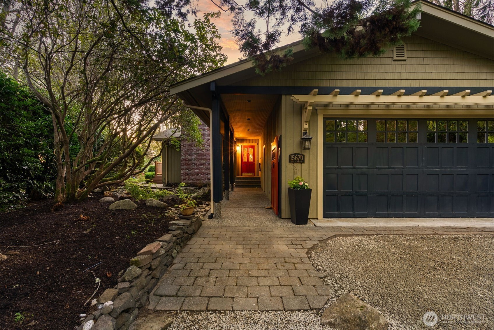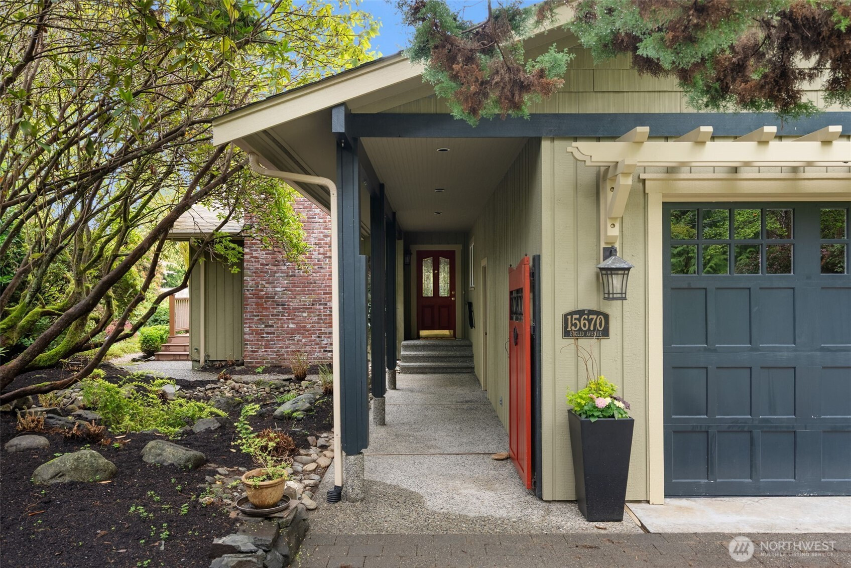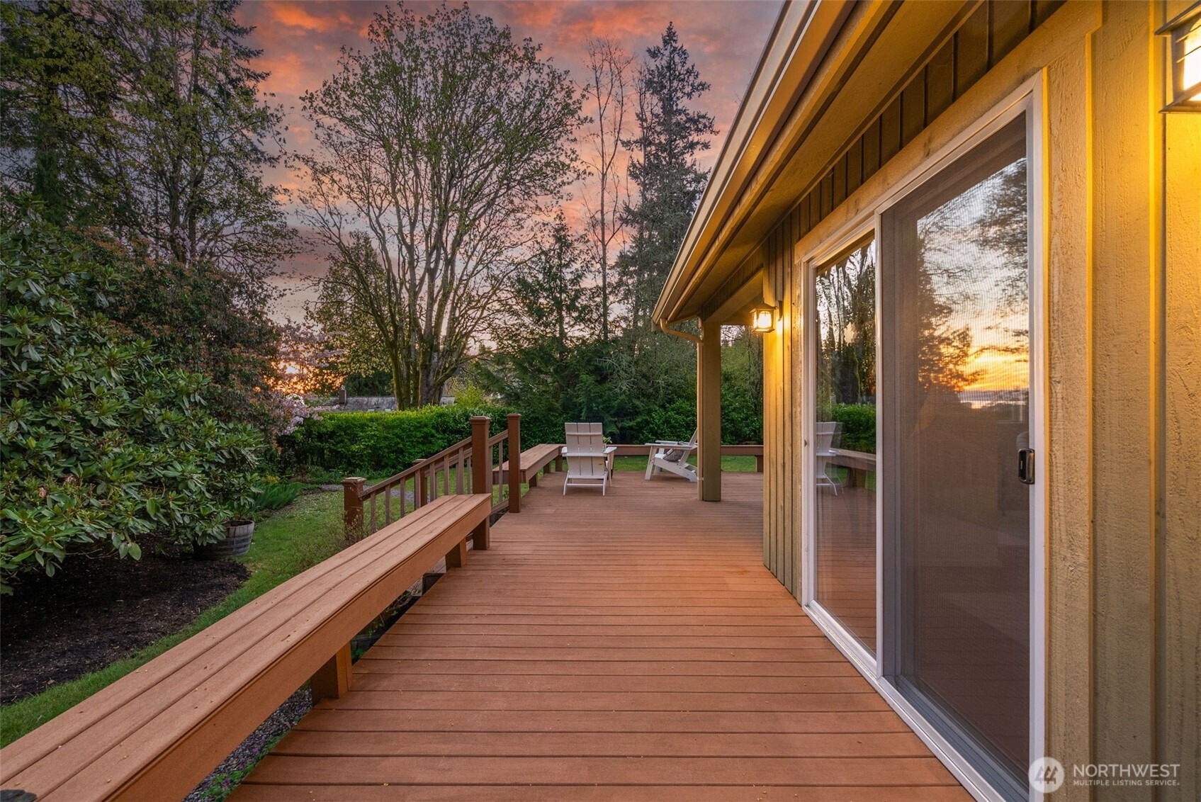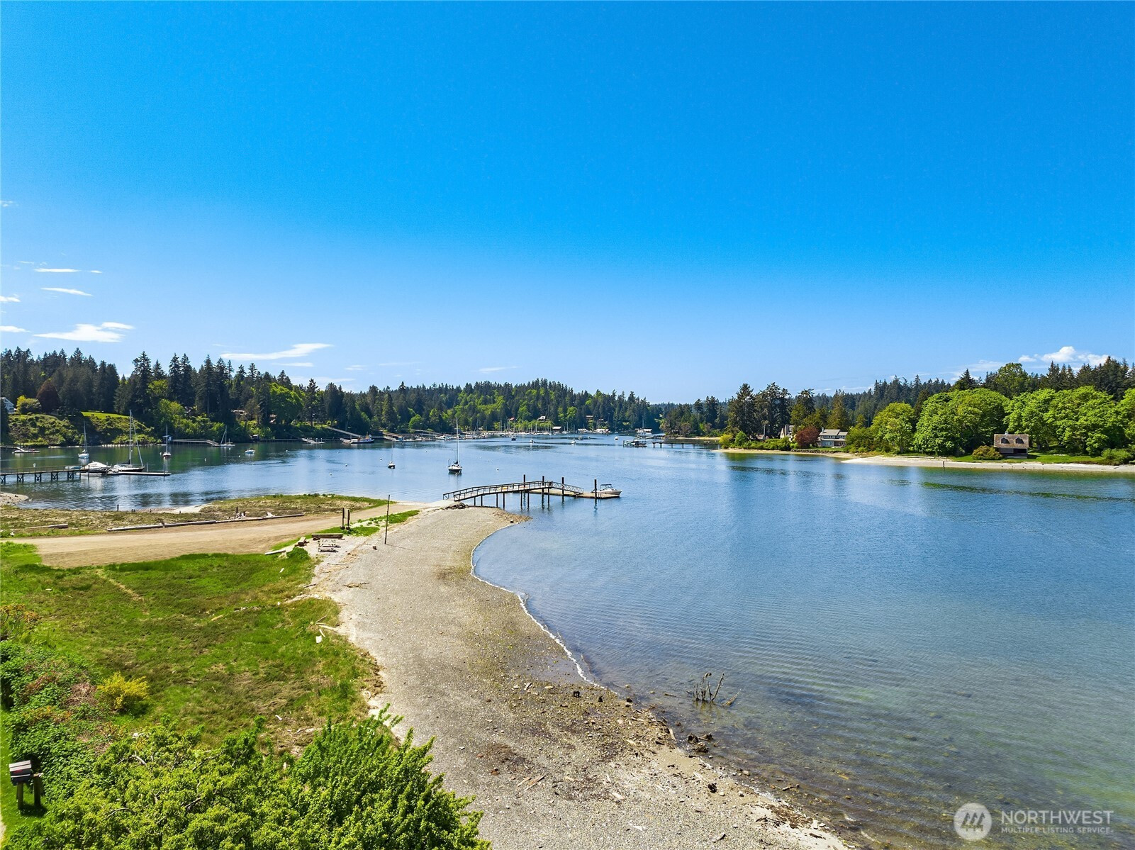 Tucked into the heart of historic Port Madison, this charming single-level home is set on a level half-acre with mature gardens and a circular drive, capturing a sense of ease and tranquility. Highly desirable Port Madison offers community members access to over 1,000 feet of private, pristine shoreline, a deepwater dock, a boat launch, and more than 40 forested acres of meandering, meditative trails. A cozy wood-burning stove, set in a custom brick surround, centers the living, dining, and sitting rooms. Two sliding glass doors open to the expansive wraparound deck, offering seamless indoor-outdoor living and views across the lawn and gardens to beautiful sunrises over Point Monroe. The gracious kitchen offers a breakfast bar, quartz counters, wood cabinets, a tile floor, and a garden-view window. The primary suite and second bedroom, each with a full bath, have new carpet and fresh paint. The large laundry/mudroom doubles as an office with a built-in desk. The home features rich 3/4-inch oak floors; a heat pump and furnace for efficient year-round heating and cooling; and a large two-car garage with plenty of room for storage. This lovely home is a stone’s throw from Fay Bainbridge Park, convenient to bus routes, and only a 12-minute drive to Winslow and the Seattle ferry. Welcome home!