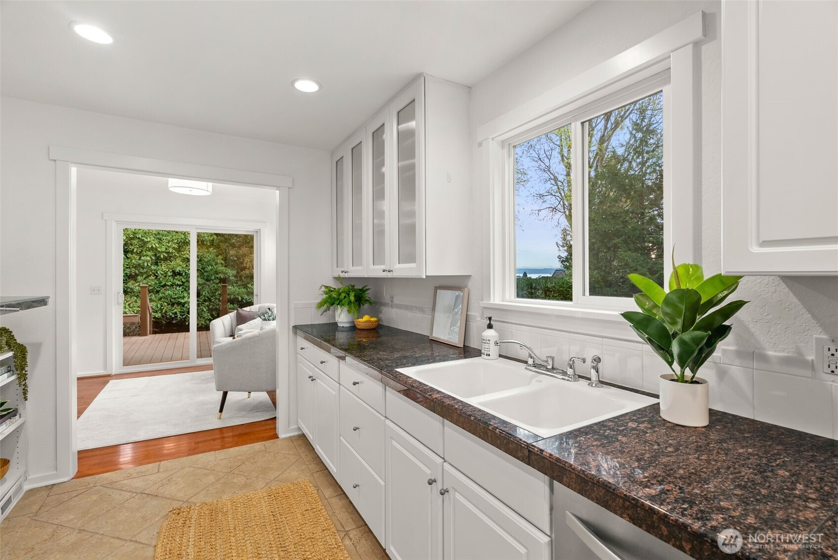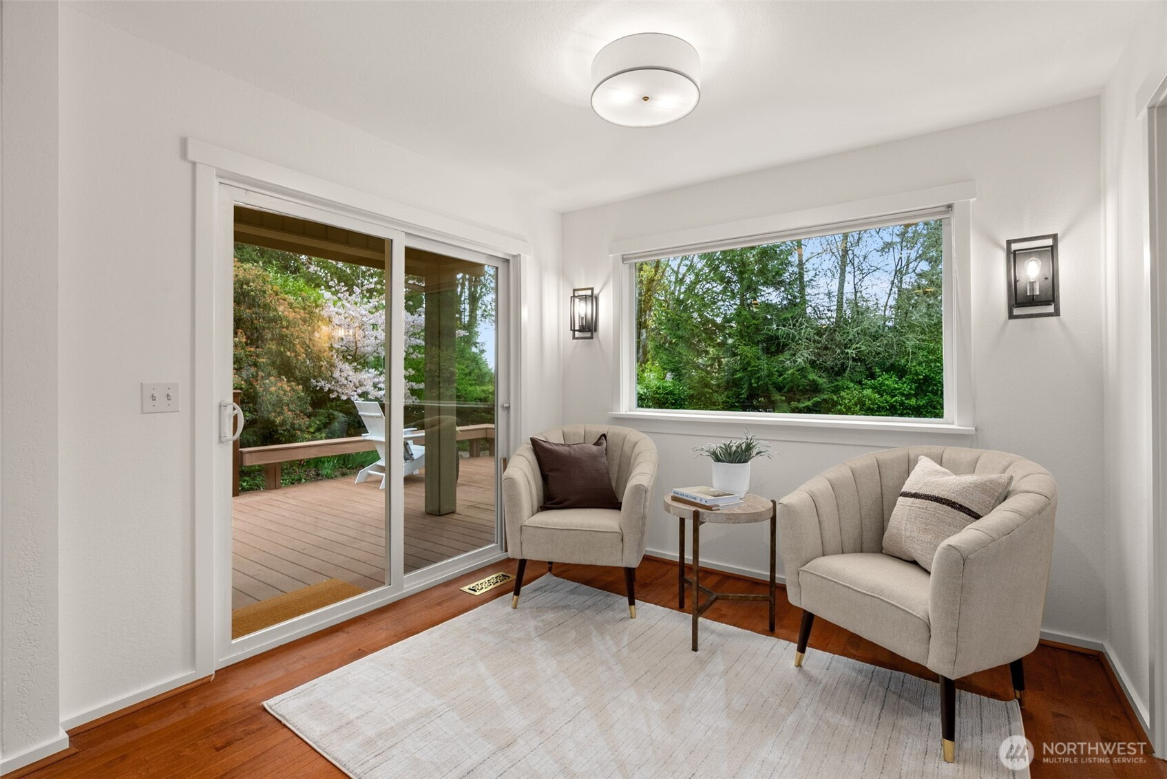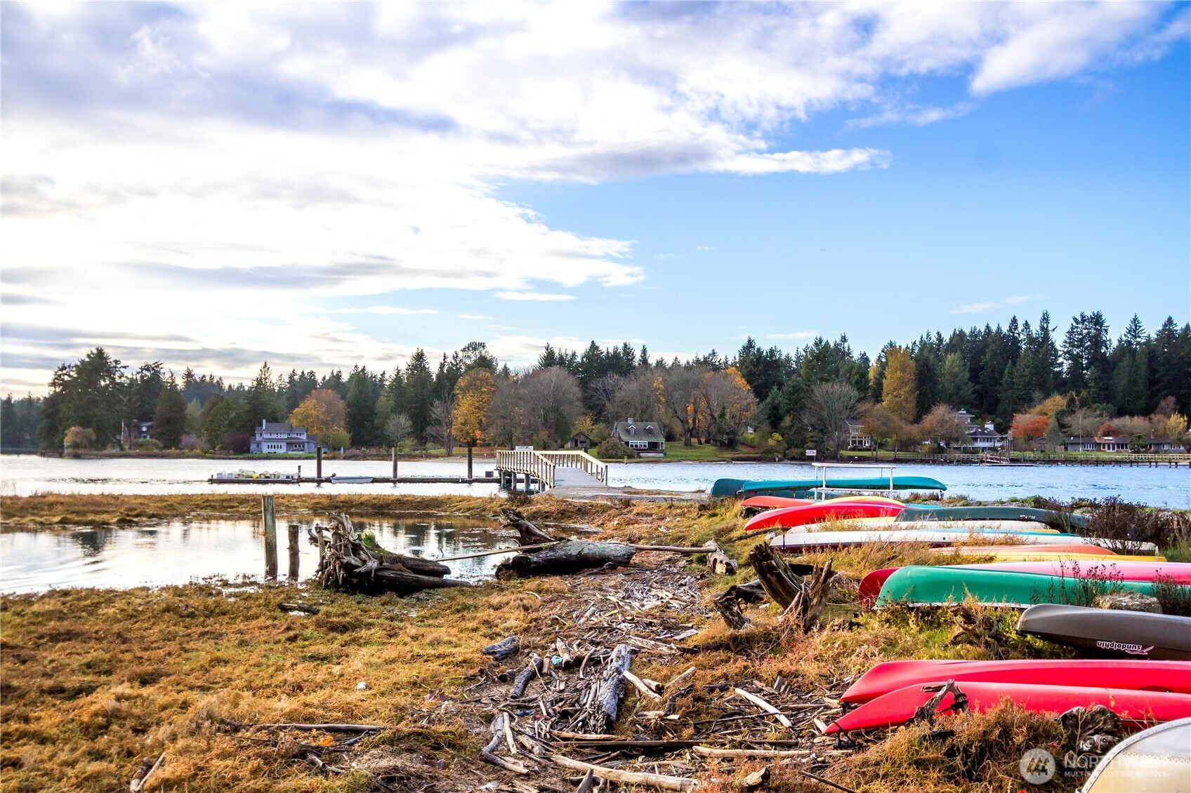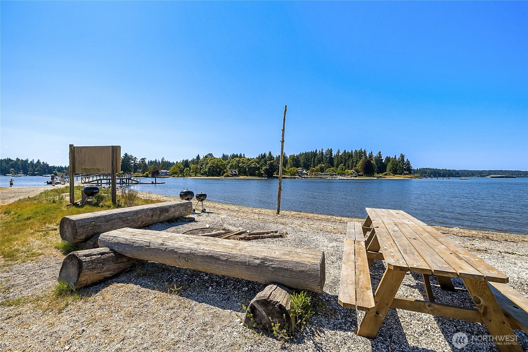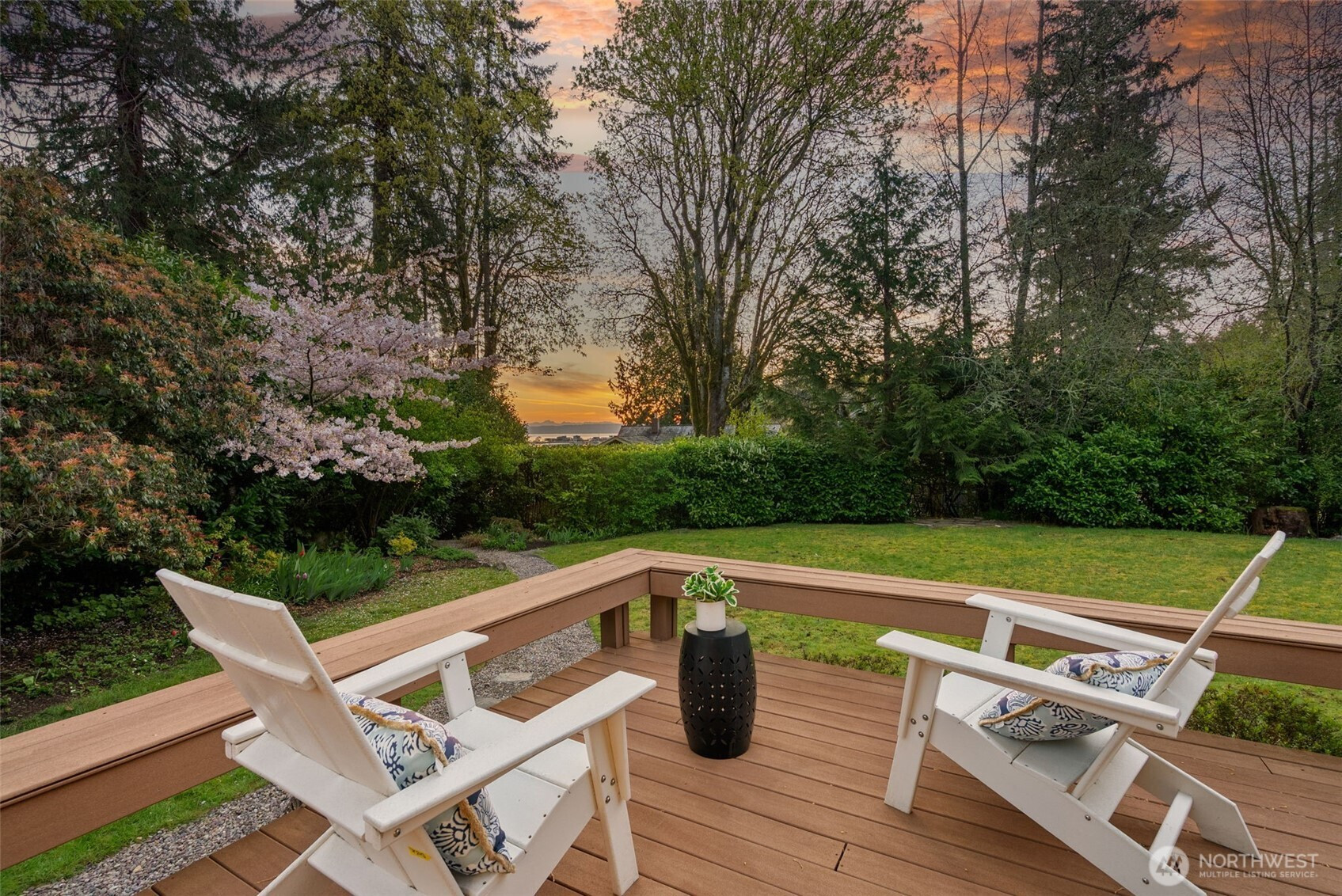 Tucked into the heart of historic Port Madison, this charming single-level home is set on a level half-acre with mature gardens and a circular drive, capturing a sense of ease and tranquility. Highly desirable Port Madison offers community members access to over 1,000 feet of private, pristine shoreline, a deepwater dock, a boat launch, and more than 40 forested acres of meandering, meditative trails. A cozy wood-burning stove, set in a custom brick surround, centers the living, dining, and sitting rooms. Two sliding glass doors open to the expansive wraparound deck, offering seamless indoor-outdoor living and views across the lawn and gardens to beautiful sunrises over Point Monroe. The gracious kitchen offers a breakfast bar, quartz counters, wood cabinets, a tile floor, and a garden-view window. The primary suite and second bedroom, each with a full bath, have new carpet and fresh paint. The large laundry/mudroom doubles as an office with a built-in desk. The home features rich 3/4-inch oak floors; a heat pump and furnace for efficient year-round heating and cooling; and a large two-car garage with plenty of room for storage. This lovely home is a stone’s throw from Fay Bainbridge Park, convenient to bus routes, and only a 12-minute drive to Winslow and the Seattle ferry. Welcome home!