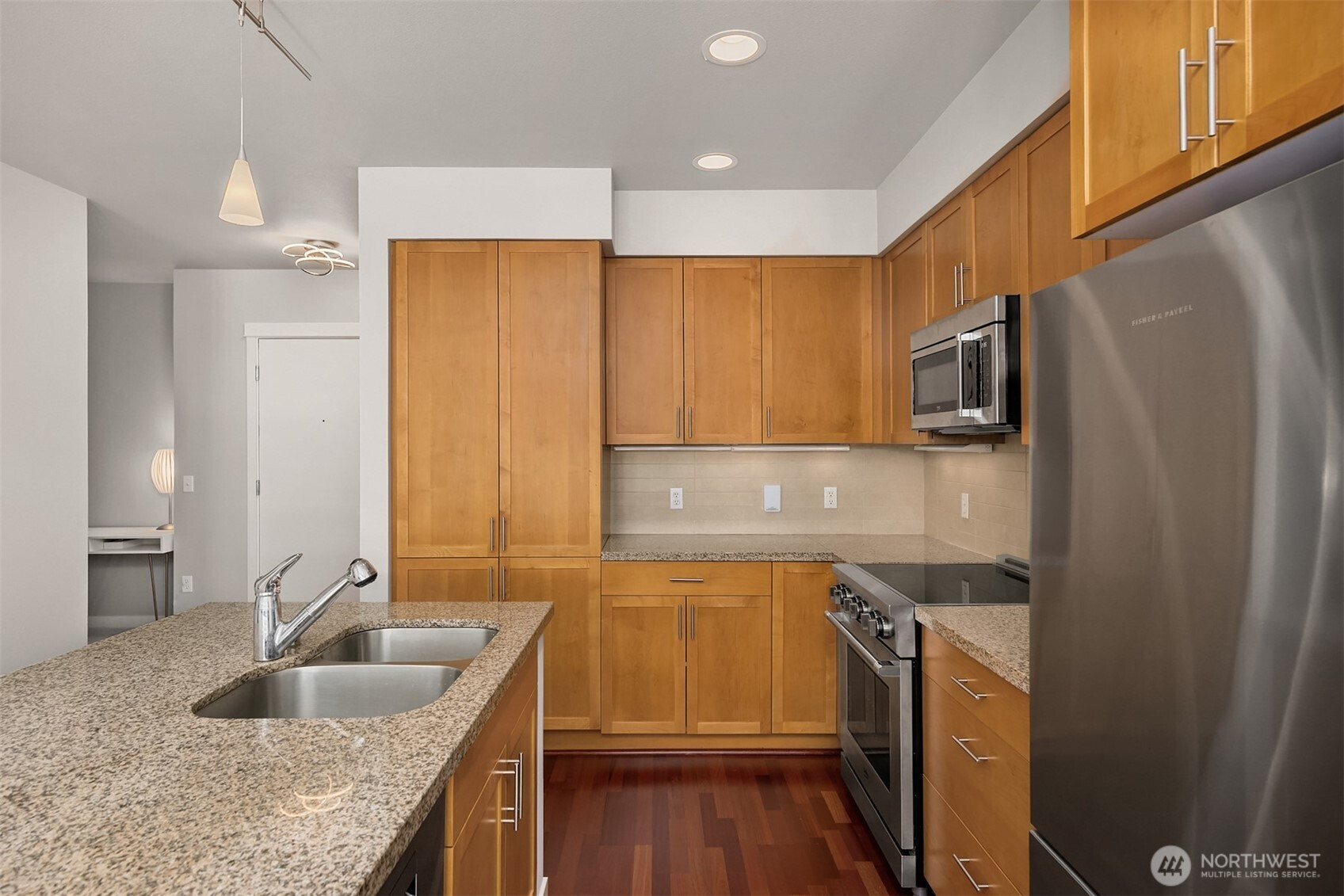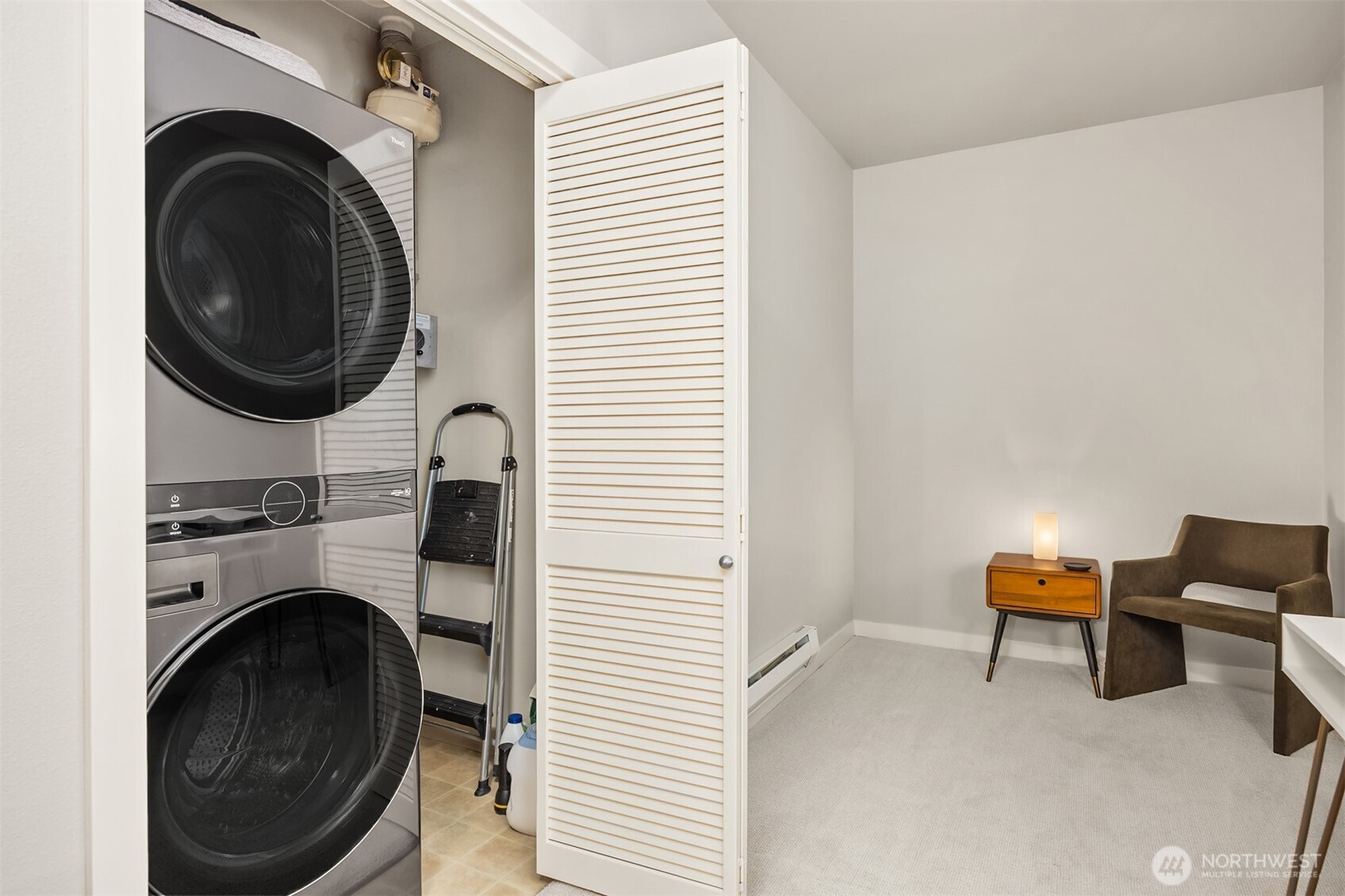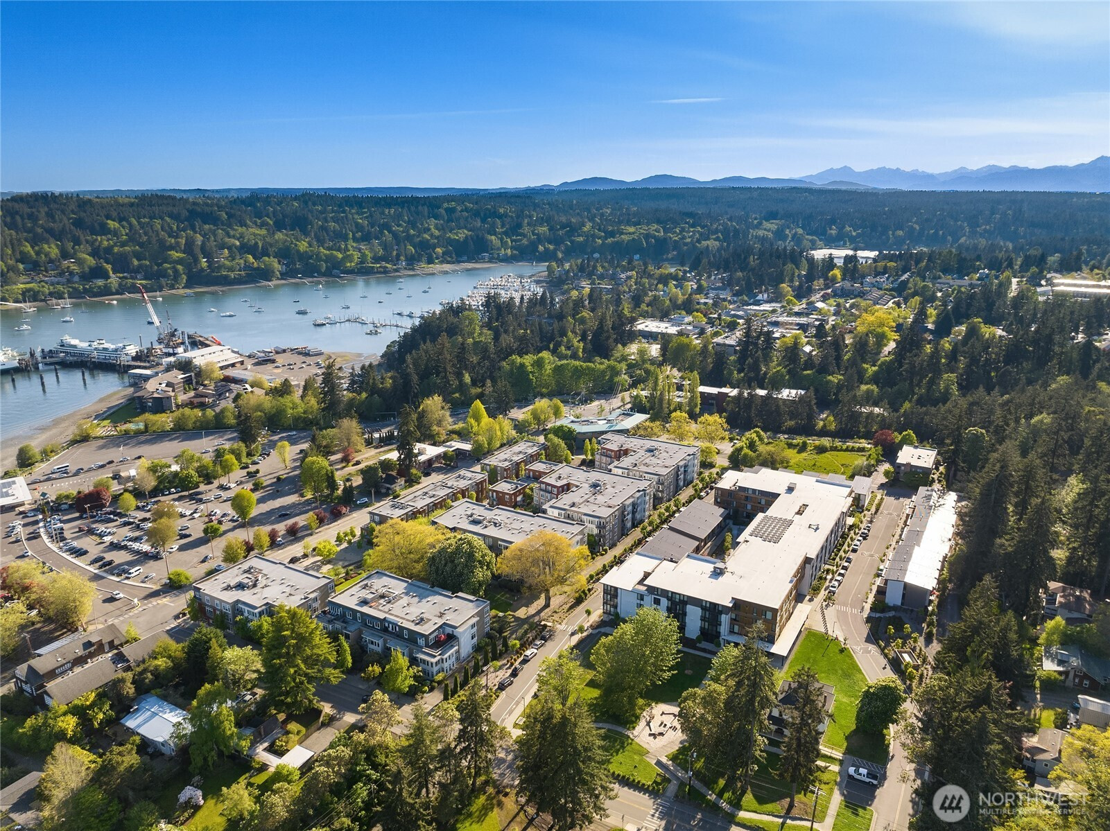 Ideally situated on the quiet north side of Harbor Square, this top-floor condominium offers a peaceful setting in one of the complex's quieter locations. Lightly lived in and beautifully maintained, this 1-bedroom plus den, 1.5-bath home offers exceptional value. The thoughtful floor plan offers a private balcony, spacious bedroom with walk in closet and full ensuite bath, versatile den/office, and separate powder room for guests. Fresh paint throughout, like new carpet, and all new appliances, including the washer and dryer, add to the appeal, while wood cabinetry, granite counters, secure garage parking, and storage complete the offering. Harbor Square amenities include a fitness center, business center, theater room, guest suite, and welcoming gathering spaces for owners and guests. Enjoy the ease of in-town Bainbridge living with shops, dining, galleries, and the ferry just moments away. This home offers the best of island life with the excitement and convenience of Seattle just a short ferry ride away. An ideal full time residence and a commuters dream, or an effortless island retreat in the heart of Winslow. An opportunity not to be missed.