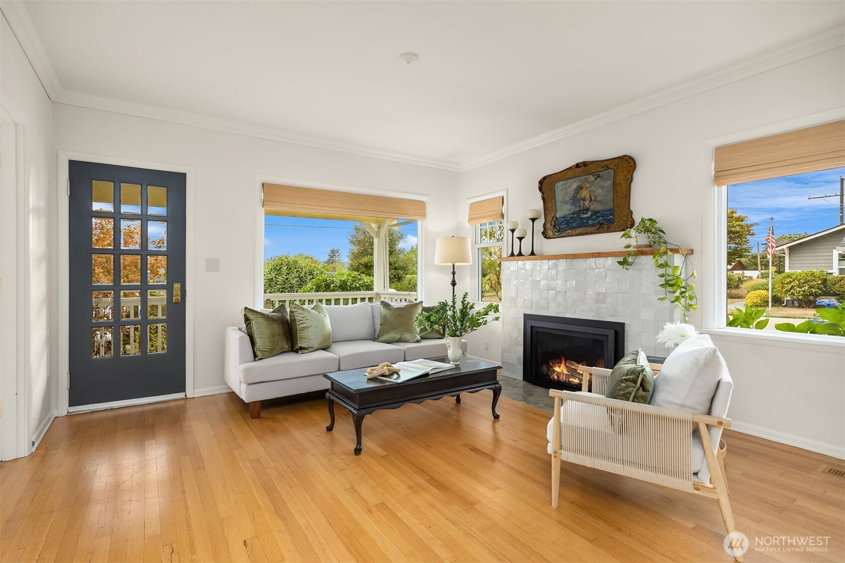 Charming craftsman with a modern flair and stunning views of the Olympic Mountains and Liberty Bay. Located just a short walk from downtown Poulsbo, this 3-bedroom, 2-bath home features a contemporary kitchen with state-of-the-art appliances, fresh paint, and stylish finishes throughout. Recent upgrades include a new Mendota fireplace, natural gas heating, a new furnace, electrical panel, and a new roof. The spacious refinished basement adds extra living space, while the garden area includes an artist's studio and a detached office off of the garage. This turn-key home exudes charm and you'll love taking in the views & sunsets from the porch. Conveniently located near downtown, Liberty Bay and easy ferry access. The perfect in-town package!