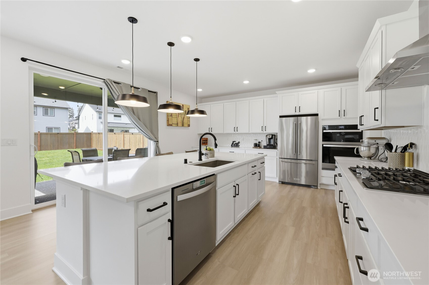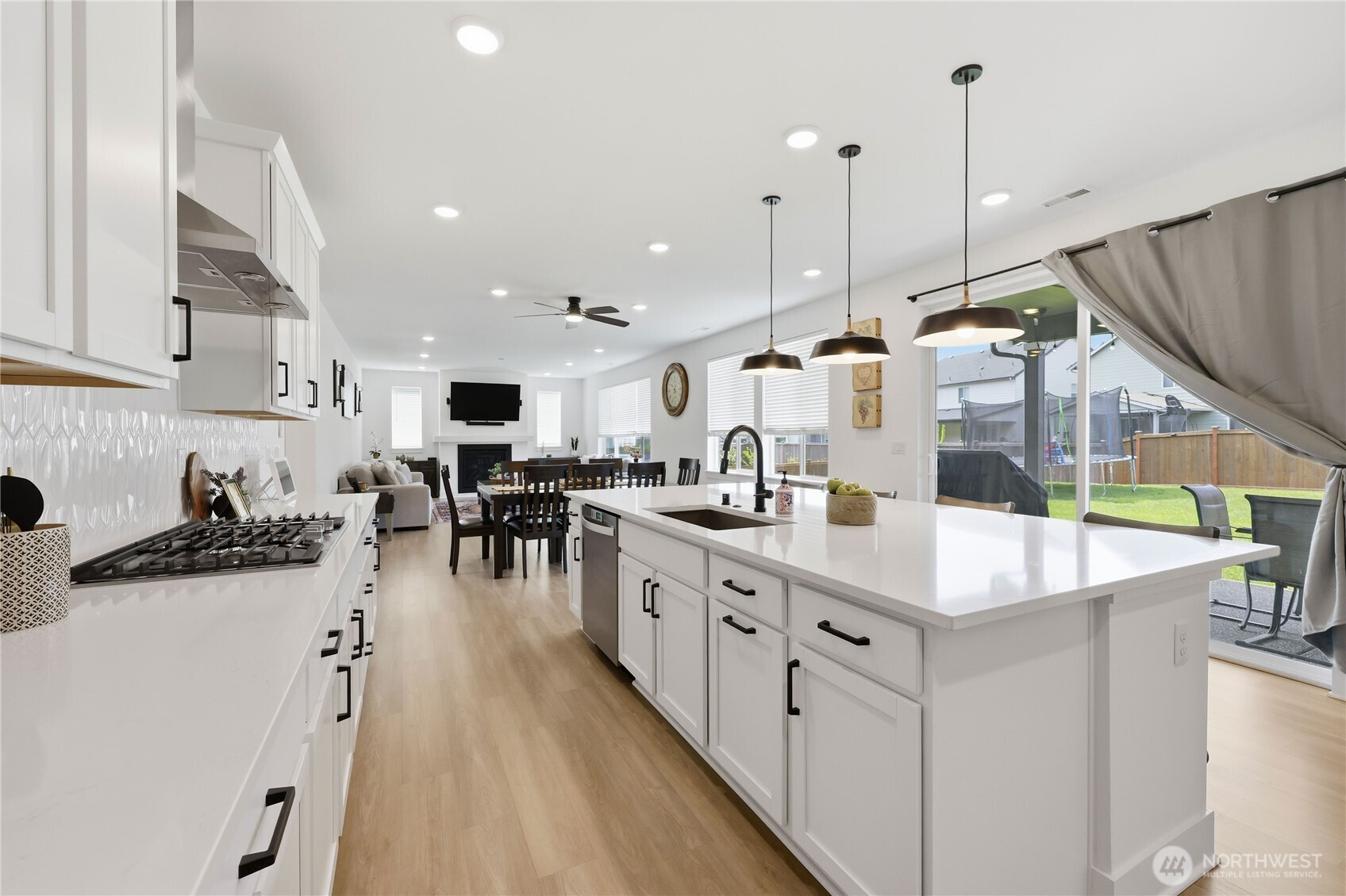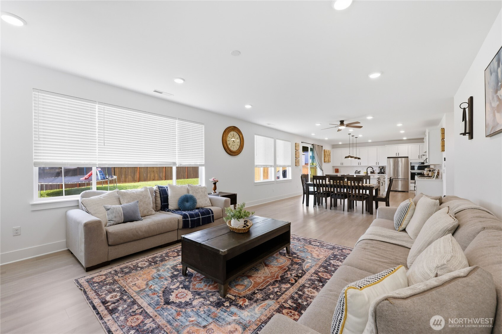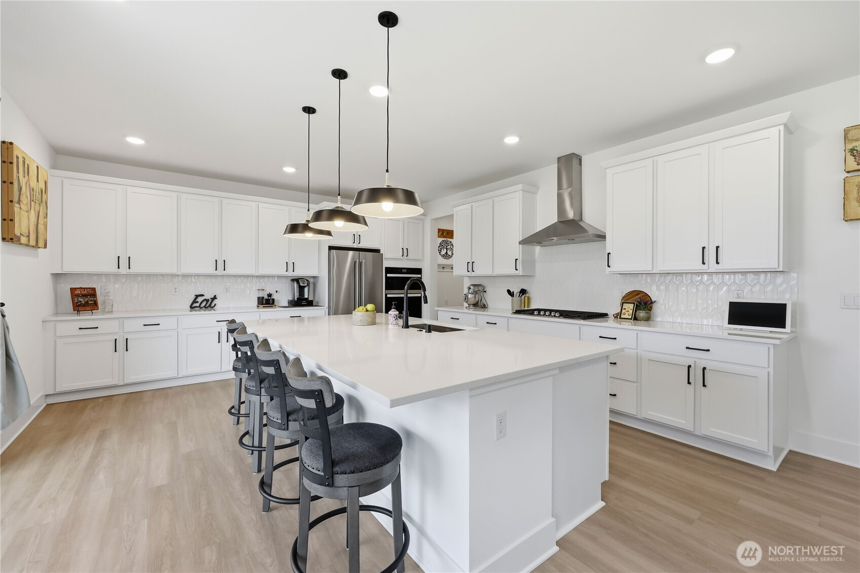 In Poulsbo’s coveted Blue Heron community, a striking designer residence pairs architectural presence with everyday livability, offering the rare combination of five bedrooms + a three-car garage in one of North Kitsap’s most desirable neighborhoods. Thoughtfully designed for modern living, a light-filled open-concept floor plan unfolds with ease. Expansive living spaces flow seamlessly into a beautifully appointed gourmet kitchen, crafted for gatherings w/ abundant prep space, custom pantry, contemporary finishes, a natural connection to the heart of the home. Just beyond, a covered patio extends the living outdoors, ideal for summer dining, morning coffee, or relaxed NW entertaining. A main-level guest suite with adjacent ¾ bth offers exceptional flexibility for visitors, multigenerational living, or a private home office.Upstairs, retreat to a luxurious primary suite featuring dual walk-in closets and a spa-inspired ensuite. Three additional bedrooms + an expansive loft create a versatile second living area, perfect for media, work, or play, while a generous upstairs laundry room adds everyday convenience. Integrated HomeSmart technology enhances comfort and efficiency throughout.Ideally located, the home is walkable to nearby schools, parks, just minutes to shopping, dining, & everyday amenities. Enjoy quick access to historic downtown Poulsbo’s waterfront charm, as well as easy commutes to Seattle ferries via Bainbridge Island and Kingston. Turnkey, move in ready Poulsbo