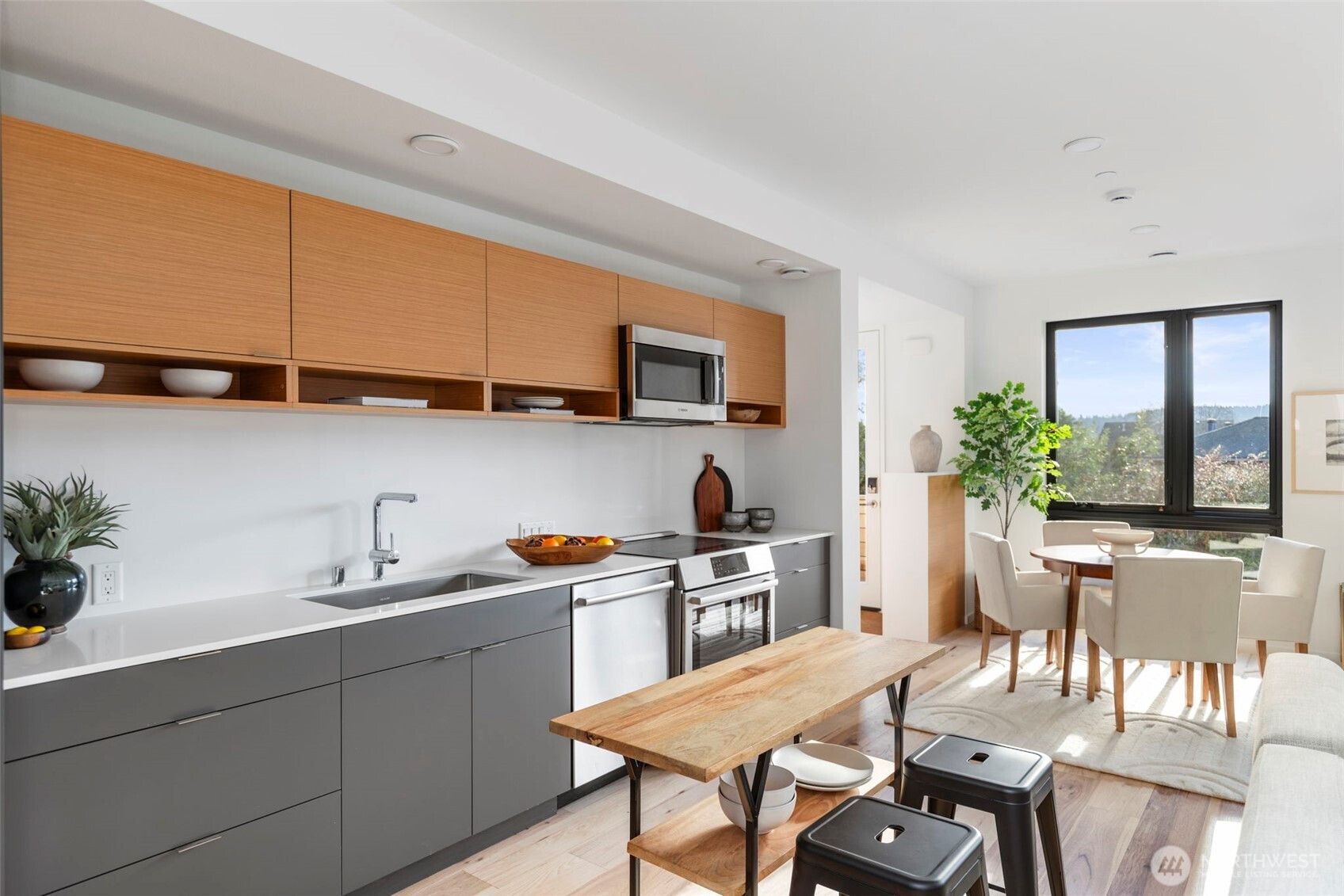 2.99% BUILDER-PAID rate incentive w/preferred lender-must be under contract by 11/26! (Quals apply.) Last premium end unit! Live modern in this 5-Star Built Green home where luxury meets sustainability. Surrounded by nature yet mins to downtown-enjoy tranquility + convenience. Walk to cafes, shops, galleries + ferry for car-free city access. Sleek wood finishes, hardwoods, vaulted ceilings, rooftop deck + walls of windows bring light + style. Community gardens, bonfire pits + trails foster connection. EV-ready parking, solar-ready design + efficient systems = smart living. Perfect for parks + top schools nearby. Own your Bainbridge getaway—use seasonally, rent short-term, or live year-round. Flexible ownership to fit your lifestyle.