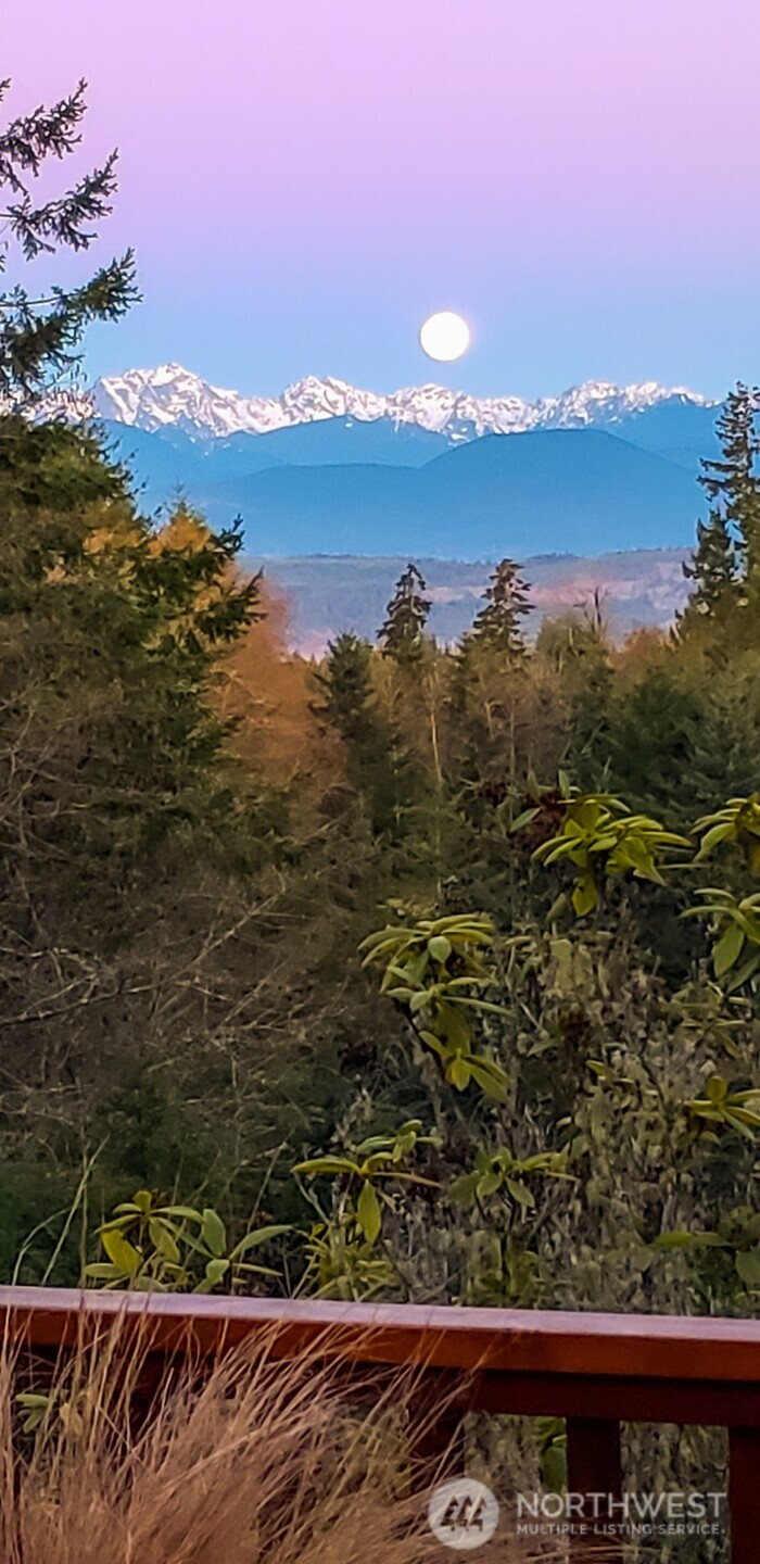 Custom-built rarely available rambler features a sprawling layout, vaulted ceilings, Olympic Mountain views and a fabulous floorplan with TWO primary suites! Impeccably maintained and in mint condition, welcome home to an updated kitchen, newer heat pump with heating and cooling, whole-house automatic transfer generator and a top-of-the-line composition roof. Expansive picture windows frame stunning western views of the Olympic Mountains and surrounding evergreens, filling the home with natural light and creating a warm, inviting feel throughout. Designed to embrace its setting, a massive west-facing deck runs the full length of the home, creating an incredible space to relax, entertain, and enjoy sunsets over the mountains. A private patio with seating area offers a second outdoor retreat surrounded by peaceful gardens. The beautifully manicured grounds include an easy-care yard, lush gardens, and a 4-zone, in-ground irrigation system, all set in complete privacy with no visible neighbors. Located in the sought-after Vinland community just 5 minutes to Poulsbo and 10 minutes to Silverdale! Custom-view ramblers like this rarely come to market in North Kitsap—especially in such a prime location. Come experience the views, privacy, and effortless single-level living for yourself!