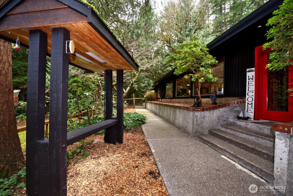 This modern one-story home offers a serene and private retreat, surrounded by nature. Featuring a spacious and open layout w/ large windows allowing for abundant natural light to fill the rooms. The efficient kitchen was updated in 2023 and is equipped with stainless steel appliances and custom cabinetry, creating a functional and modern cooking space. The wood burning stove can heat the entire home, however, the newer HVAC w/ AC allows for year-round heating and cooling. The generous primary bedroom has an en-suite bath that was updated in 2024 including a tiled walk-in shower. The home also features a hot tub room (an additional 320 sq ft), allowing for relaxation and rejuvenation. There is also a multi-functioning bonus room that is a great flex space to suit your needs. Surrounded by a spacious lot w/ a private driveway, offering ample space for personal enjoyment and outdoor activities. The three-bay garage and shop provide additional storage and workspace. The garden space and green house provide opportunities for those with a green thumb to cultivate their own fresh produce. With a newer roof, fresh exterior paint in 2025 and resealed driveway, this home is truly care-free and move in ready. This home has everything both inside and out! Secluded yet close to both downtown Poulsbo and Silverdale as well as bases. This one won't last long!