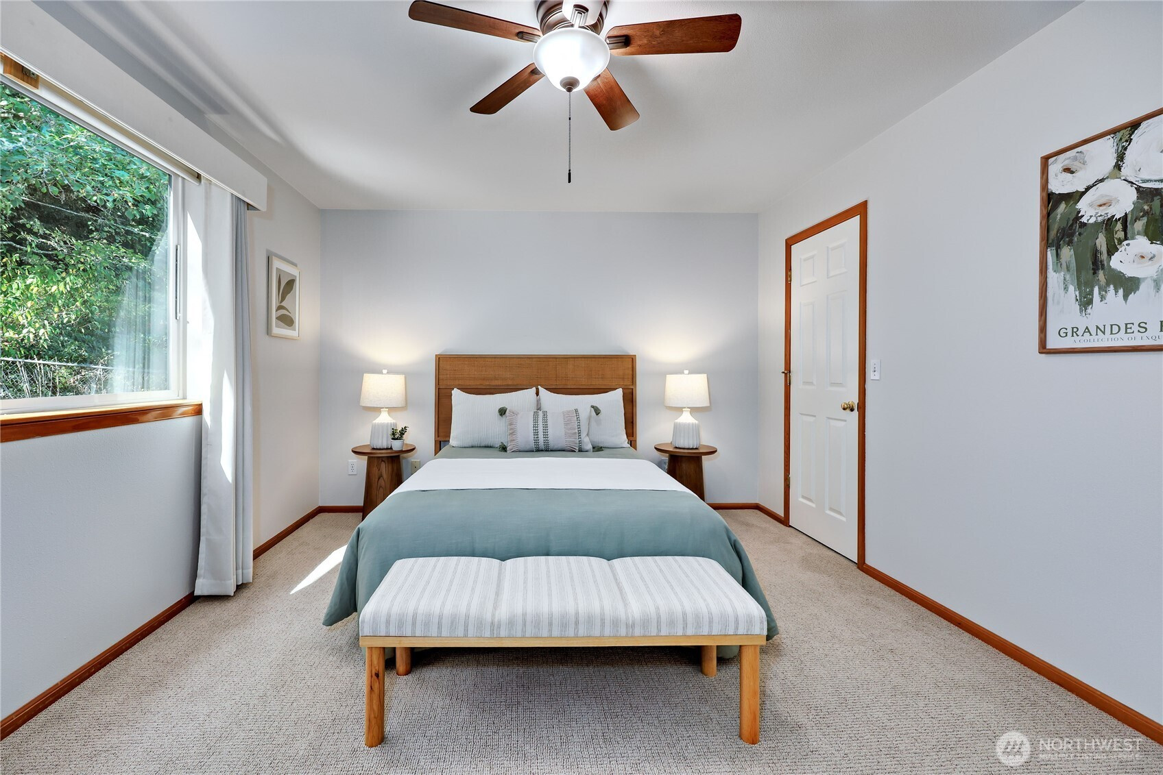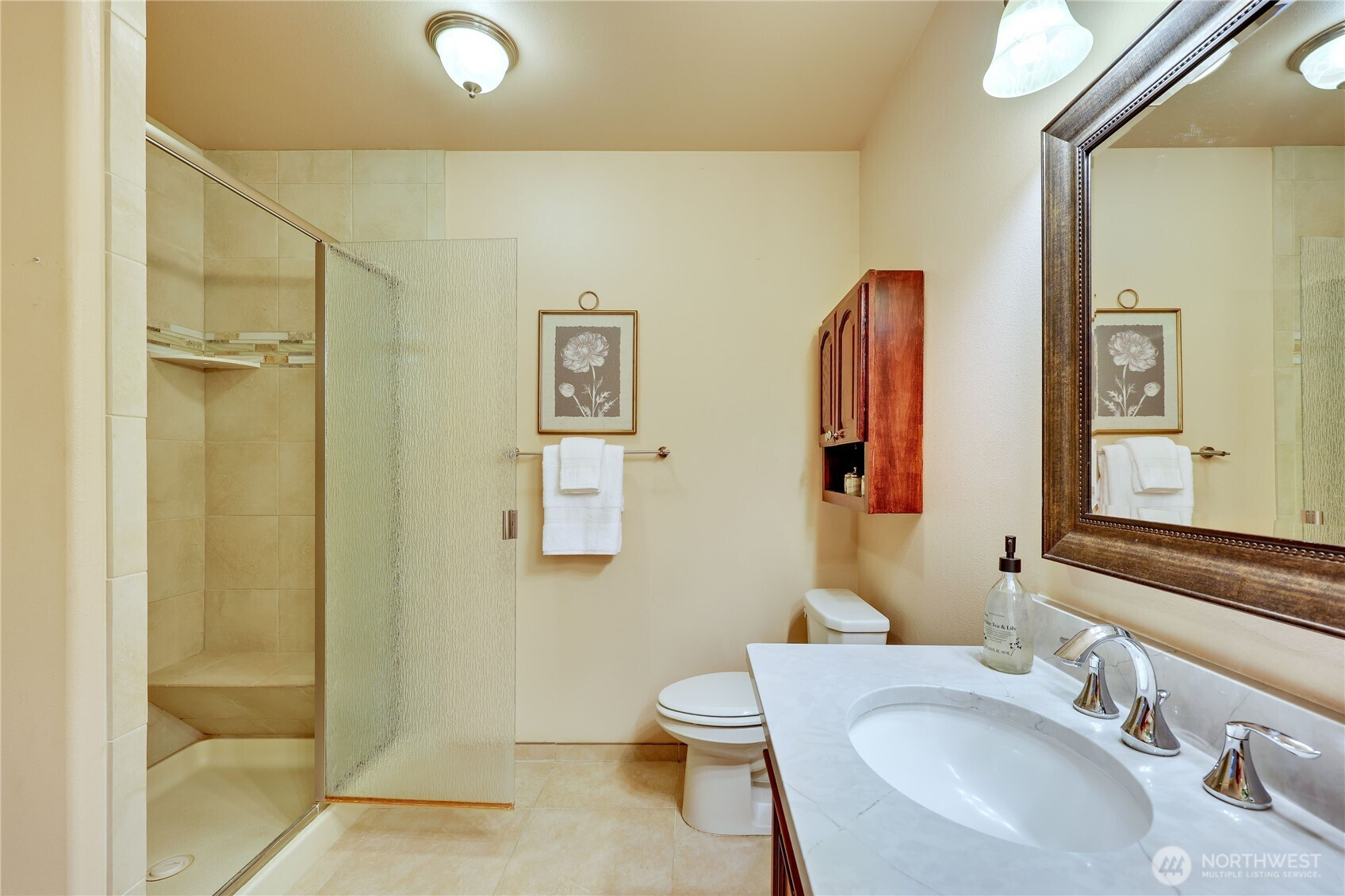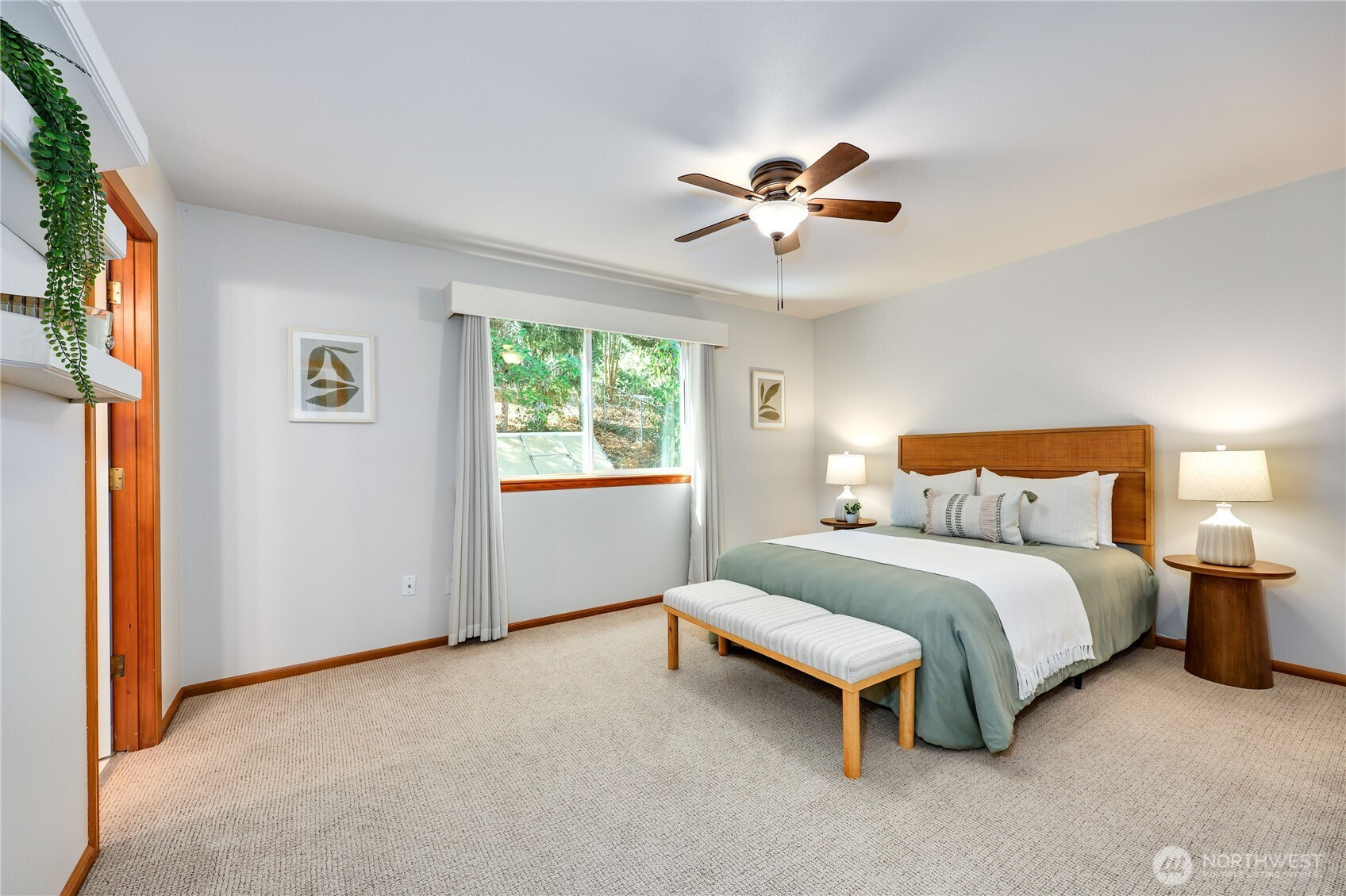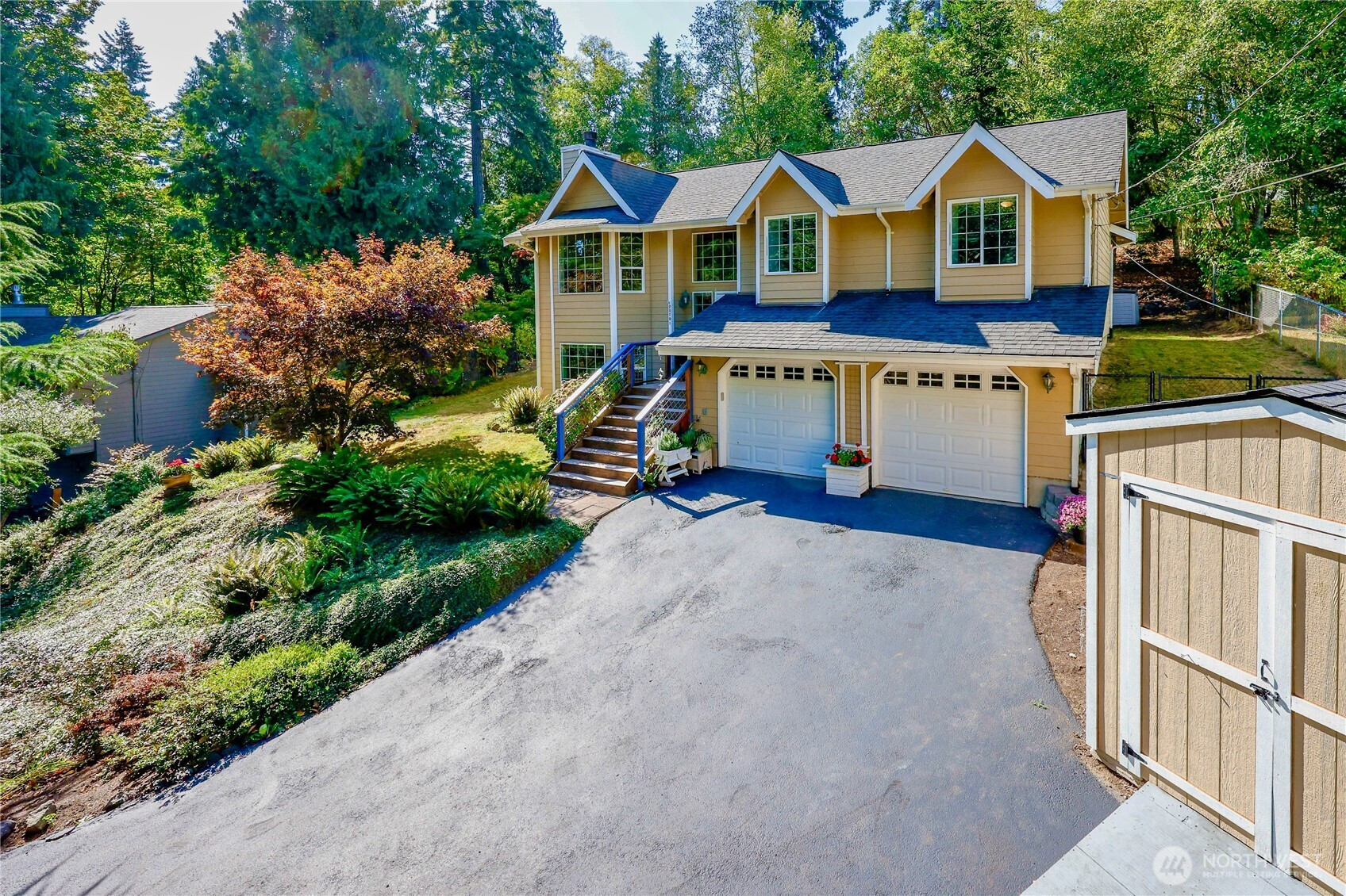 Nestled on a quiet hillside & just a short stroll to the beach, this 3-bedroom Indianola home offers the flexibility you’re looking for! You will love the window-filled living room with fireplace & the beautifully updated kitchen w/new cabinets, quartz & stylish refrigerator. Lovely hardwoods connect kitchen & dining and a slider leads to a wonderful deck overlooking the peaceful, fenced backyard. Also on Main are a primary suite with 3/4 bath, a guest bedroom, full guest bath & den/office. Downstairs, a second primary suite offers a luxuriously updated bath w/radiant heated floors, tile shower & huge walk-in closet. Rare 3+ car garage boasts tons of room for cars/storage/hobbies. Make this darling home yours & live the magic of Indianola!