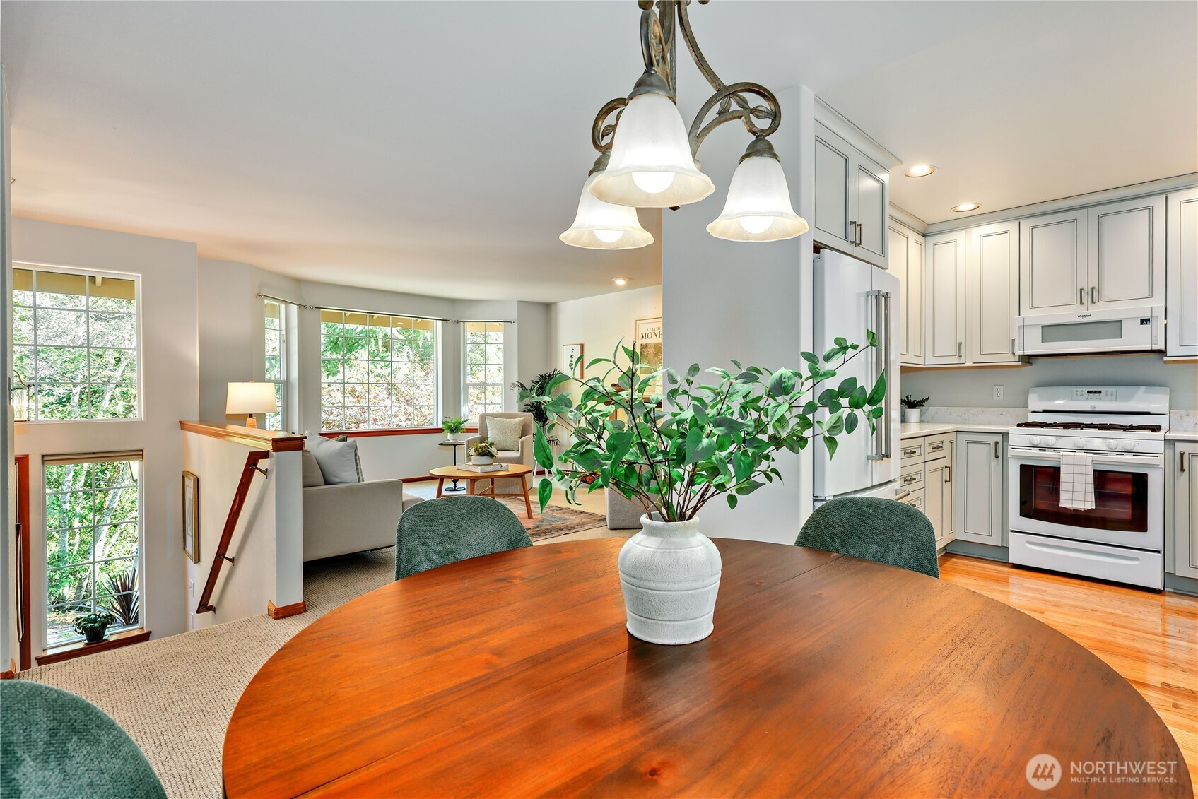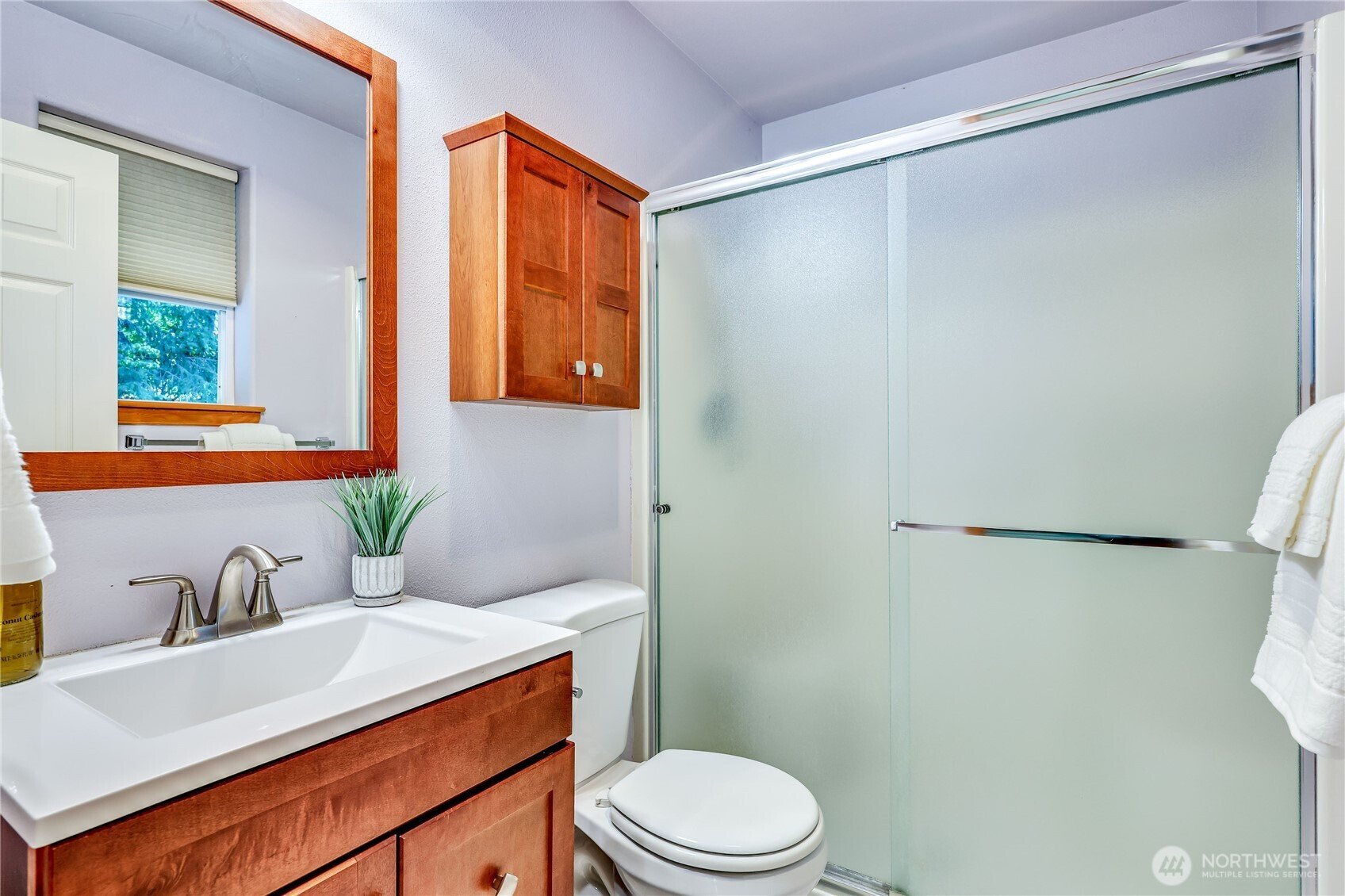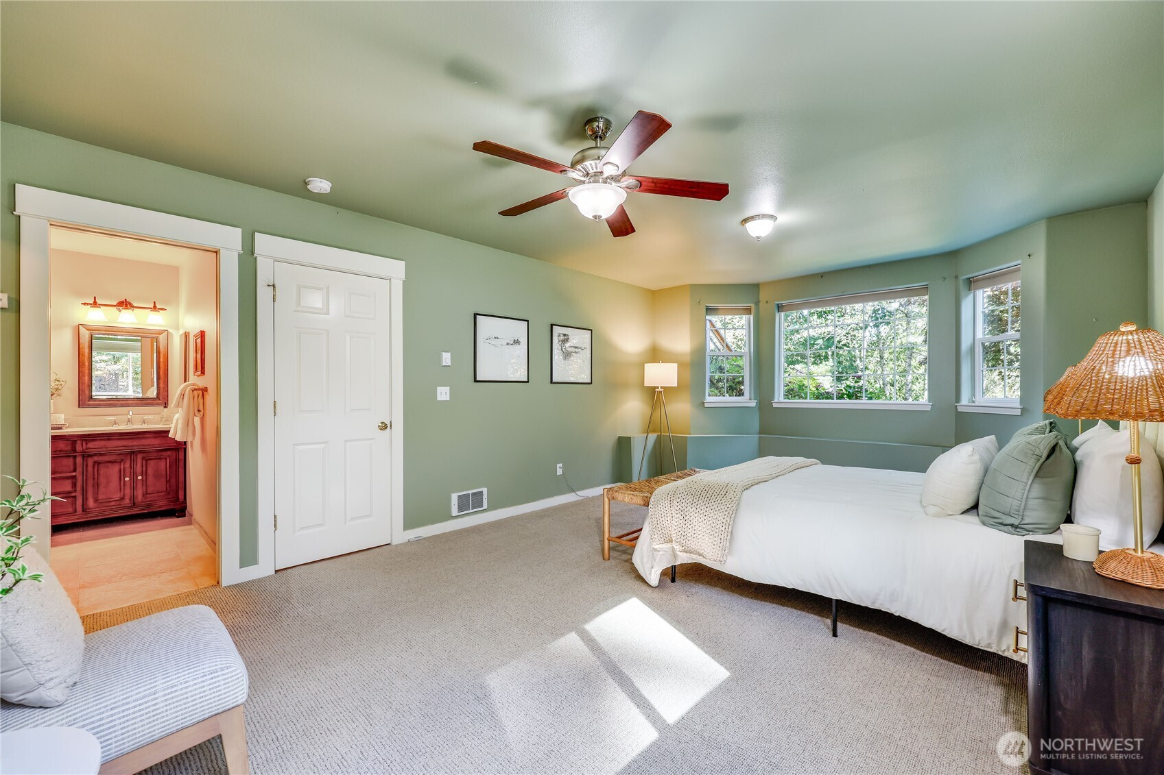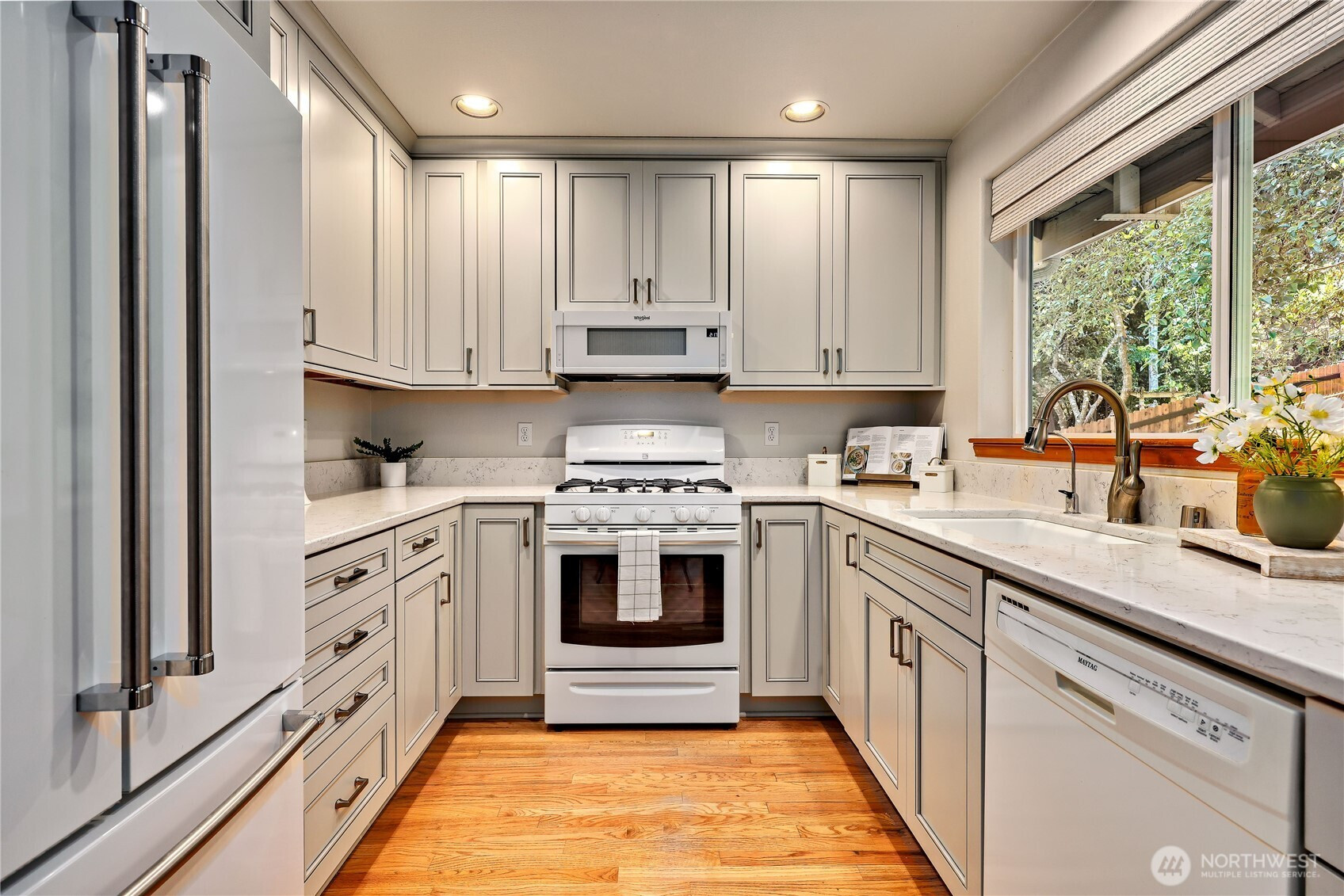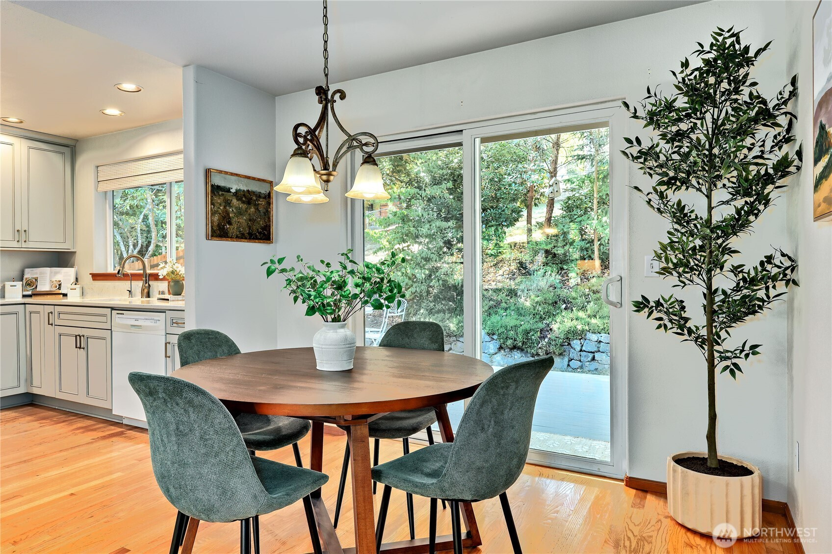 Nestled on a quiet hillside & just a short stroll to the beach, this 3-bedroom Indianola home offers the flexibility you’re looking for! You will love the window-filled living room with fireplace & the beautifully updated kitchen w/new cabinets, quartz & stylish refrigerator. Lovely hardwoods connect kitchen & dining and a slider leads to a wonderful deck overlooking the peaceful, fenced backyard. Also on Main are a primary suite with 3/4 bath, a guest bedroom, full guest bath & den/office. Downstairs, a second primary suite offers a luxuriously updated bath w/radiant heated floors, tile shower & huge walk-in closet. Rare 3+ car garage boasts tons of room for cars/storage/hobbies. Make this darling home yours & live the magic of Indianola!