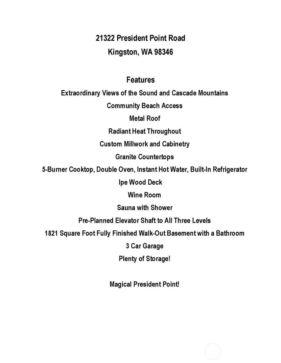 Discover stunning views of the Puget Sound & Cascade Mountains from this exquisite custom home with 3-primary bedrooms, located in the sought-after President Point community. This thoughtfully designed residence includes a space for an elevator, a built-in generator, & a generous 1,821-square-foot finished daylight basement, perfect for multi-generational living or rental income.The chef's kitchen features elegant granite countertops, custom cabinetry, & a spacious walk-in pantry.Enjoy the Ipe wrap-around deck for entertaining or relaxing. Additional amenities include a sauna, a wine room, & access to a community beach. Just minutes from ferries, trails, shopping, & the renowned White Horse Golf Course, embrace the charm of President Point!