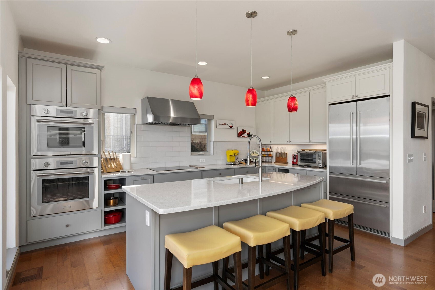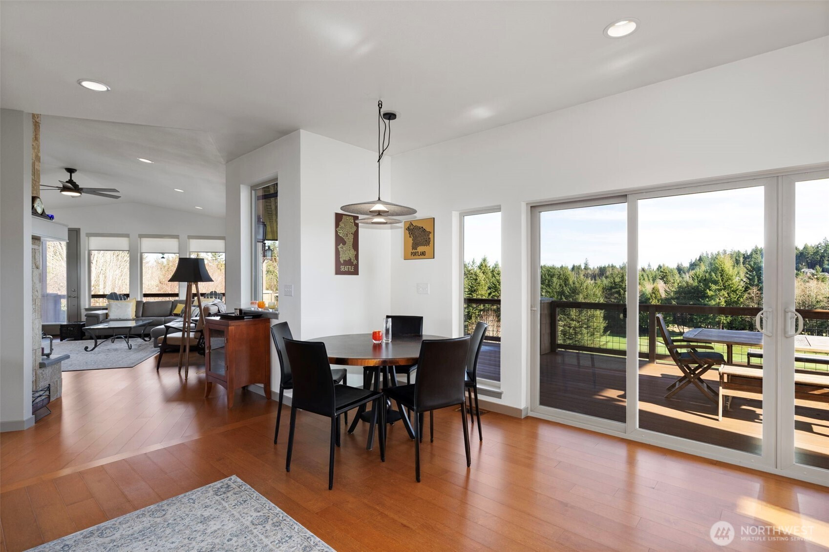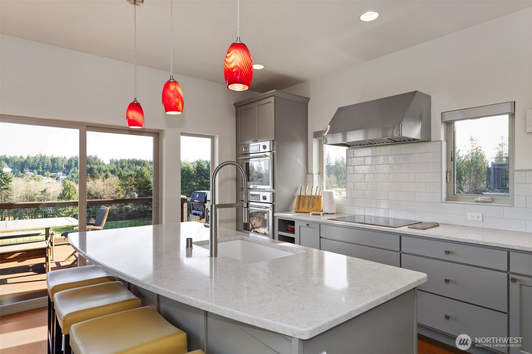 Beautifully crafted Estes-built home in the desirable White Horse neighborhood, offering privacy, Mountain and Sound views, and high-end finishes throughout. Built in 2019, this 2,383 sq ft home features 3 bedrooms, 2.5 baths, and sits on a generous .59-acre lot. Enjoy golf course living with views of the 13th hole from the covered deck—perfect for year-round enjoyment. The great room features a gas fireplace and expansive windows and doors that flood the main level with natural light and seamlessly connect indoor and outdoor living. The stunning kitchen showcases quartz countertops, custom cabinetry, high-end appliances including a steam oven, a walk-in pantry, and a built-in coffee bar. A dedicated office and exercise room add flexibility to the main level. Retreat to the spacious primary suite with a luxurious 5-piece bath. Three-car garage provides ample parking and storage. Extensive, thoughtfully designed landscaping enhances the curb appeal and outdoor spaces. Just minutes from the Kingston Ferry for easy commuting to Seattle, this home offers the perfect blend of peaceful golf course living and convenient access to the Puget Sound lifestyle.