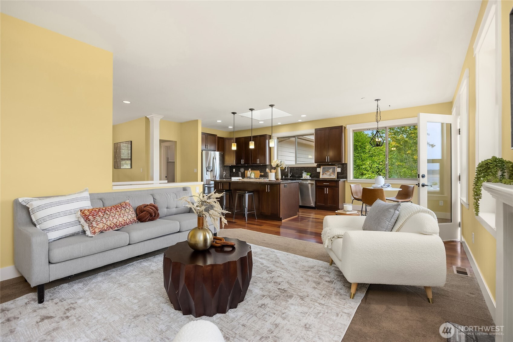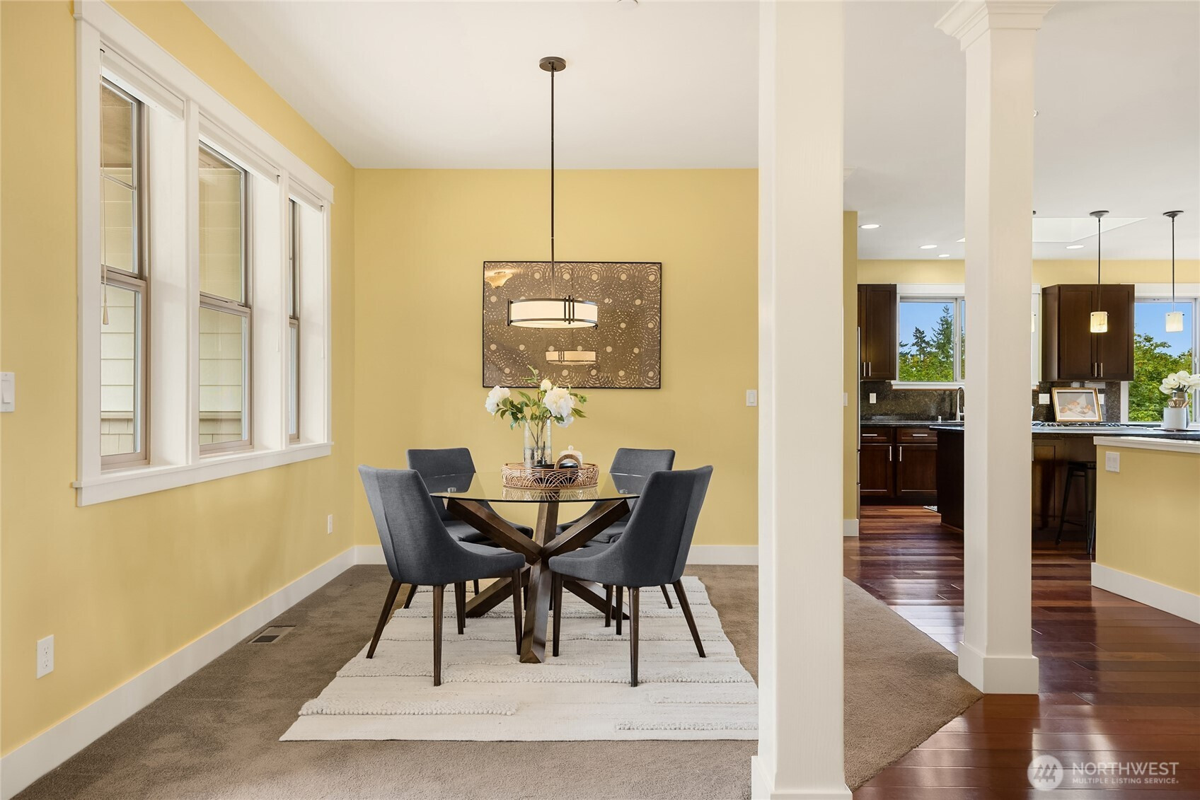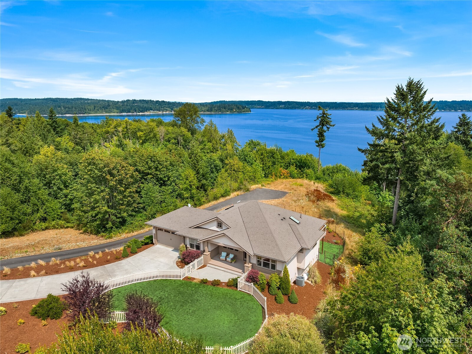 Stunning private water view property with panoramic views of Puget Sound and the Cascades. Located at the end of a quiet/private paved drive. Home has a spacious main-level primary suite, chef's kitchen, formal dining, and open deck for entertaining. Features include cherry floors/cabinetry, slab granite countertops, stainless steel appliances, and A/C. This home has been impeccably maintained with thoughtful and custom updates. The spacious downstairs level offers flex space with two bedrooms and ample storage. Front and back yards are fully fenced. Close drive to Bremerton, Kingston & Bainbridge ferries.
