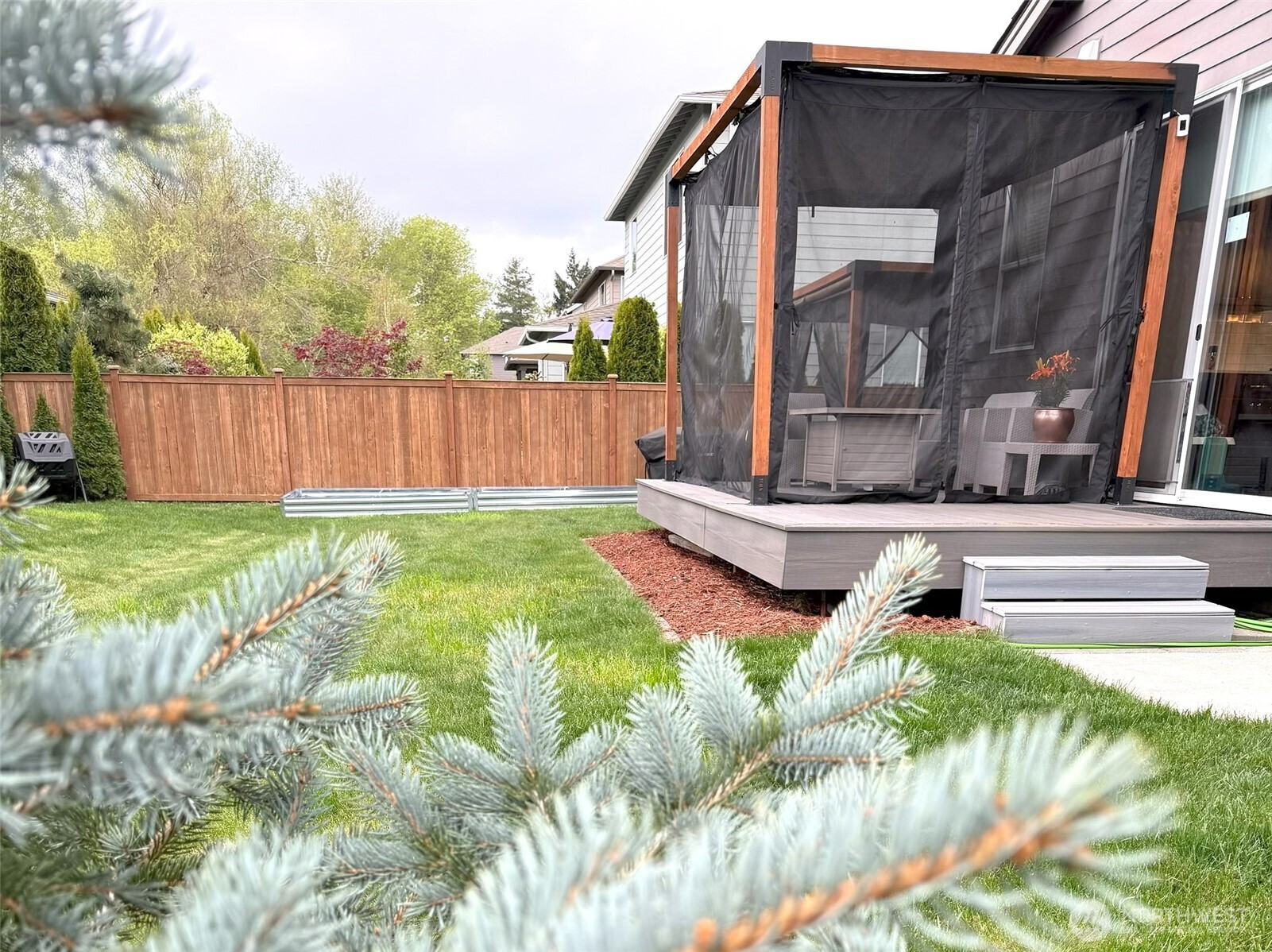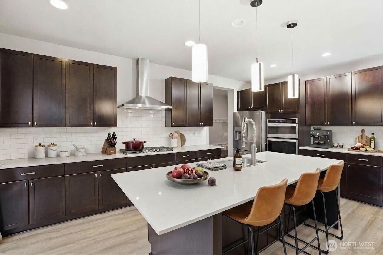Welcome to this stunning 2019 home in one of Poulsbo’s most desirable communities—offering modern design, flexible living space, and an incredible outdoor retreat. This spacious 4-bedroom, 2.75-bath home features a sought-after main-level guest suite with ¾ bath—ideal for visitors, multigenerational living, or a private office. The open-concept great room showcases luxury vinyl plank floors and flows seamlessly to a chef-inspired kitchen with quartz countertops, custom cabinetry, oversized walk-in pantry, and convenient mudroom entry from the 3-car garage. Upstairs, enjoy a versatile bonus room with barn door and mountain views, two additional bedrooms, full bath, laundry room, and a luxurious primary suite with walk-in closet and spa-like bath. Comfort features include AC and high-speed fiber internet. The beautifully landscaped backyard is designed for Northwest outdoor living with mature fruit trees, two pergolas, an expanded entertaining patio, and a 7-person hot tub. All just minutes to charming downtown Poulsbo, marinas, shopping, dining, and easy access to bases and ferries.
