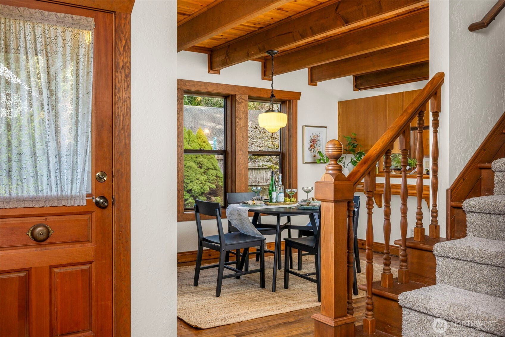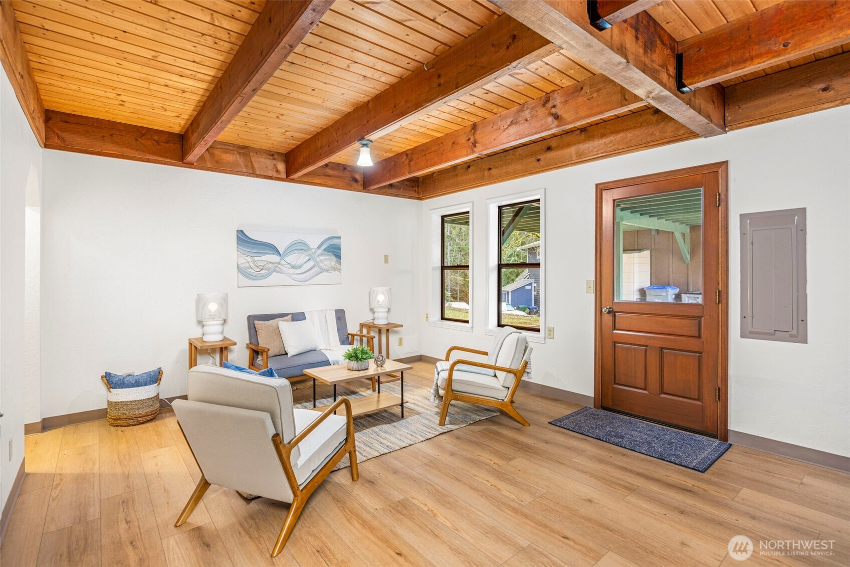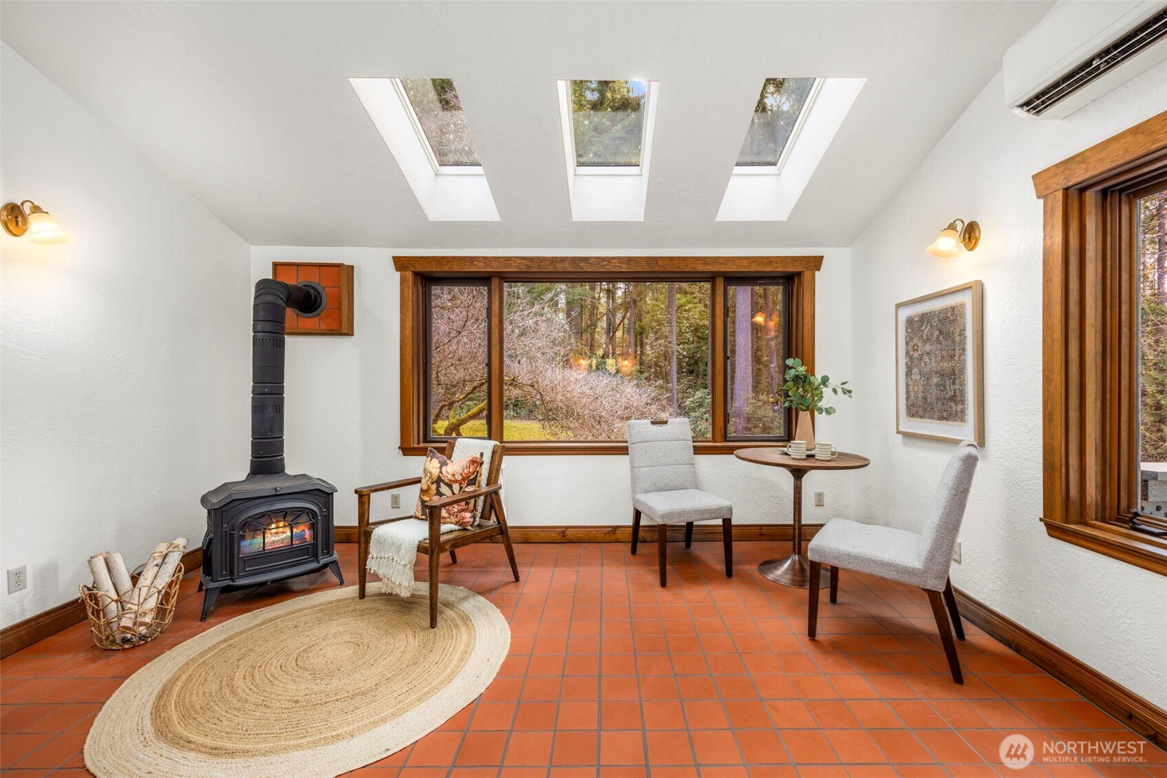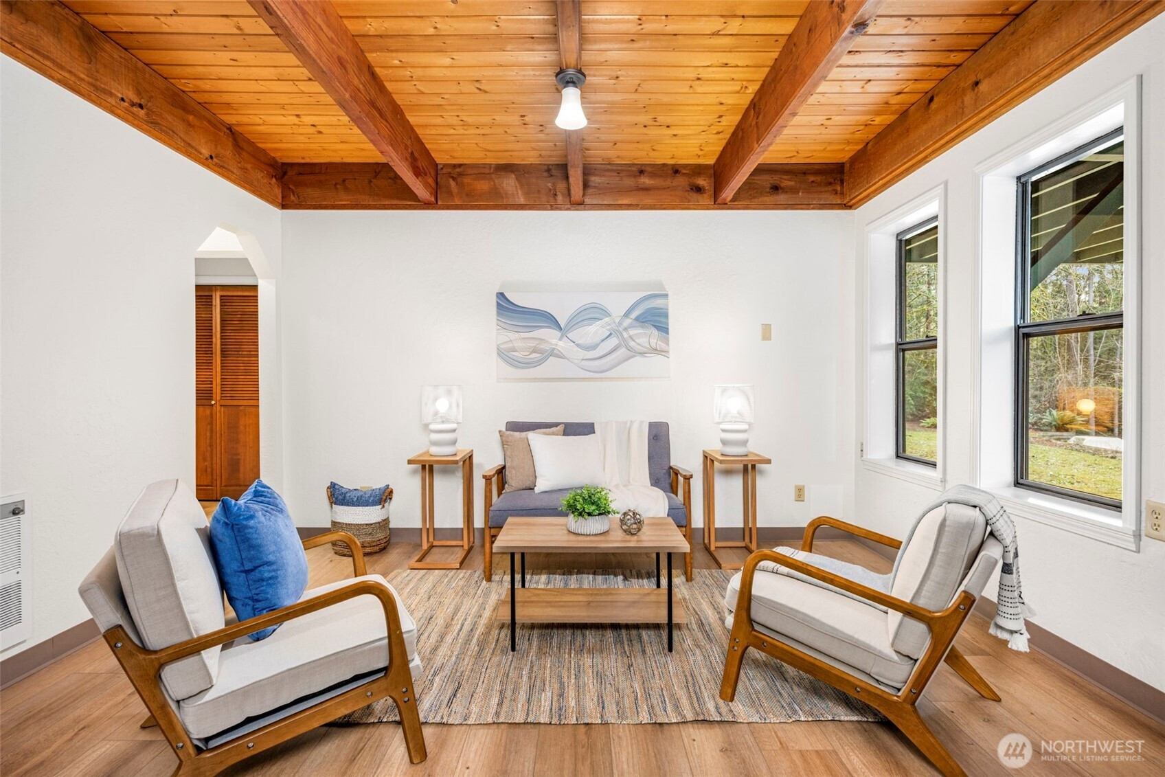 Wonderfully unique, one owner 3BR + Bonus Victorian chalet with absolutely gorgeous comfortable aesthetic. Custom built, quality construction, top to bottom. This home has all the charm, character, space and flow for enjoying special moments with loved ones inside & out. Pride of ownership shows at every turn: Pristine hardwood floors, warm tongue and groove pine ceilings & refined exposed wood beams. Spacious welcoming dining opens to kitchen, enchanting living room w/ beautiful built-ins, oversize airy sitting room off kitchen w/ vaulted ceilings, skylights & wood stove. New carpet, lvp, interior paint and recently updated bathrooms with custom tile. Light and bright 500+ SF, west-facing deck off living room + big level yard, perfect for summer fun and enjoyment. Lower level family room plus 2 additional BR's, 3/4 bath and walk out to yard. Solid wood windows with wood wrap. Efficient Mini-splits for heat and AC. RV parking. This large elevated lot is nestled in a quiet wooded Central Kitsap neighborhood. Mins to Silverdale/Bremerton shopping & bases. Award winning CK Schools.