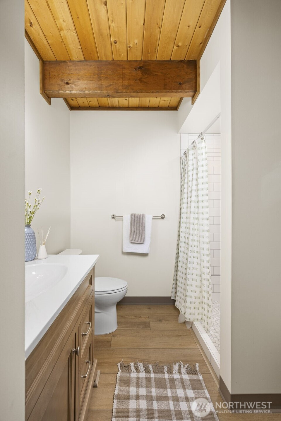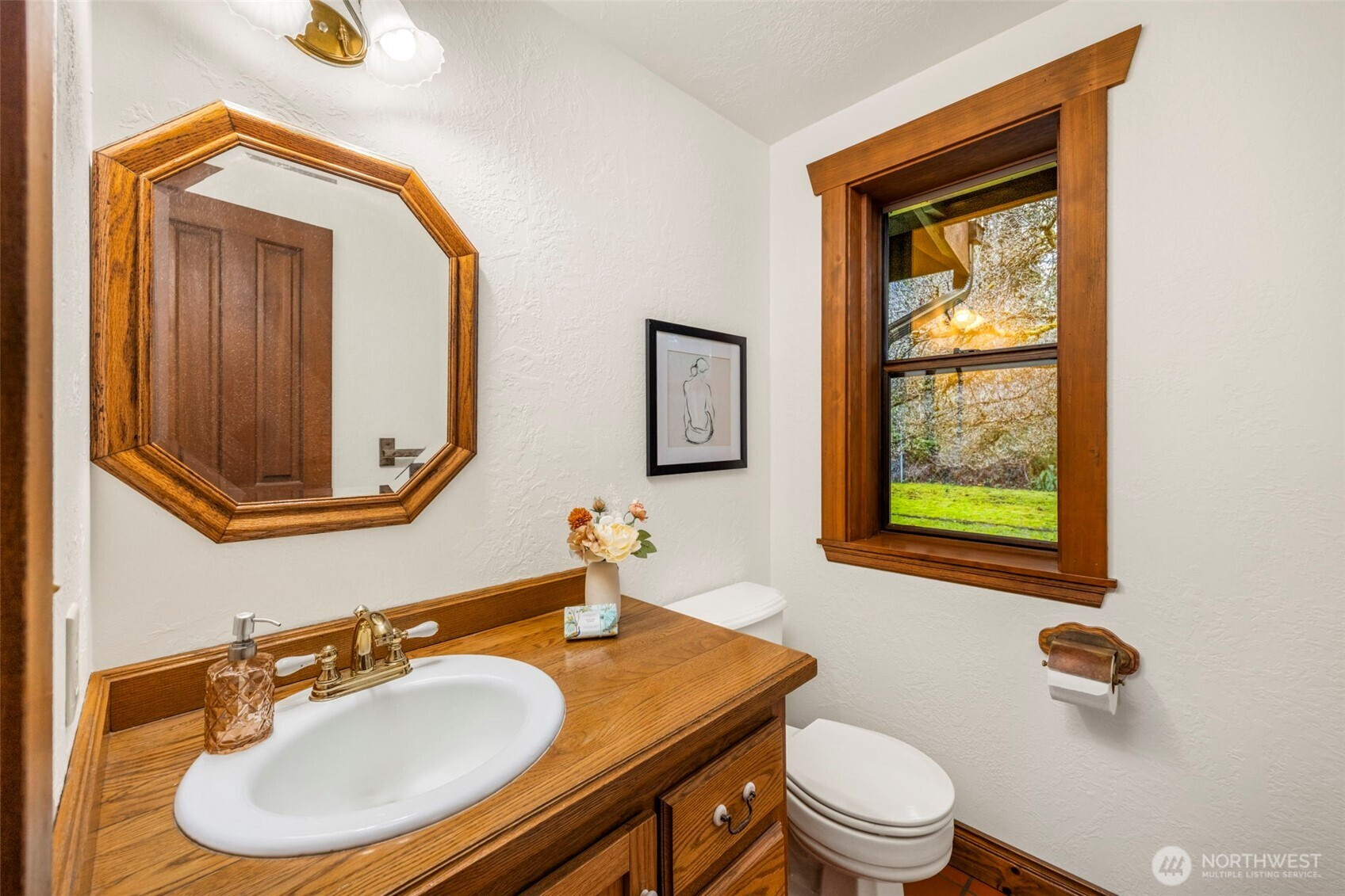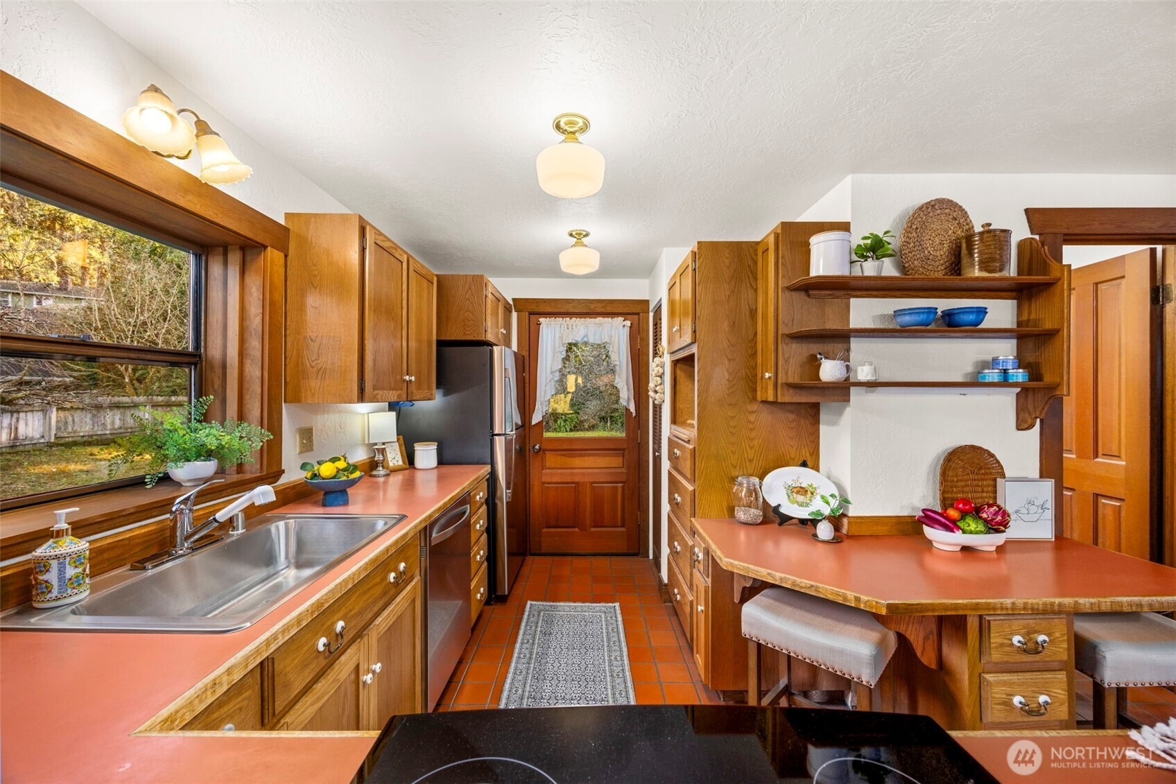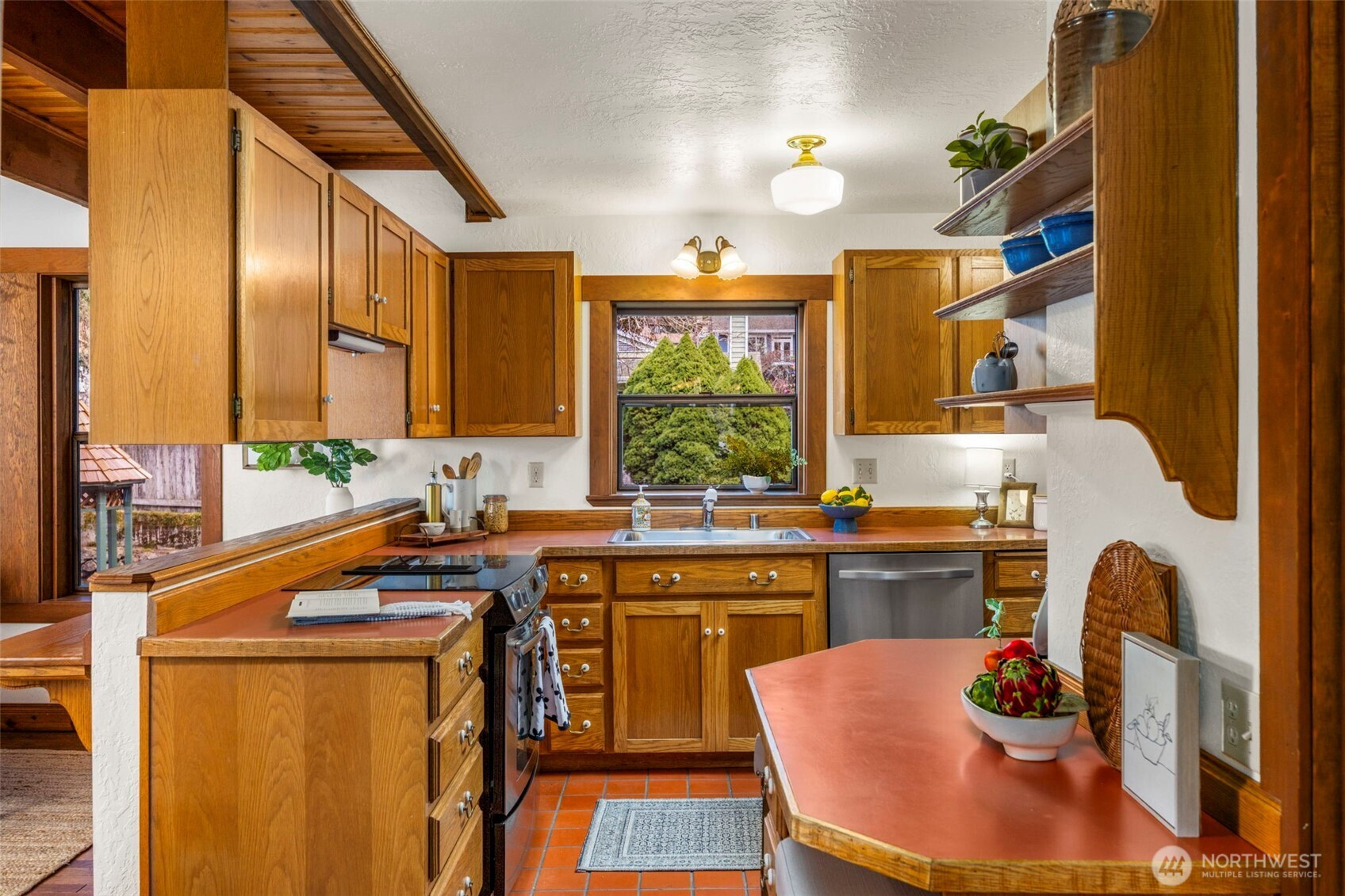 Wonderfully unique, one owner 3BR + Bonus Victorian chalet with absolutely gorgeous comfortable aesthetic. Custom built, quality construction, top to bottom. This home has all the charm, character, space and flow for enjoying special moments with loved ones inside & out. Pride of ownership shows at every turn: Pristine hardwood floors, warm tongue and groove pine ceilings & refined exposed wood beams. Spacious welcoming dining opens to kitchen, enchanting living room w/ beautiful built-ins, oversize airy sitting room off kitchen w/ vaulted ceilings, skylights & wood stove. New carpet, lvp, interior paint and recently updated bathrooms with custom tile. Light and bright 500+ SF, west-facing deck off living room + big level yard, perfect for summer fun and enjoyment. Lower level family room plus 2 additional BR's, 3/4 bath and walk out to yard. Solid wood windows with wood wrap. Efficient Mini-splits for heat and AC. RV parking. This large elevated lot is nestled in a quiet wooded Central Kitsap neighborhood. Mins to Silverdale/Bremerton shopping & bases. Award winning CK Schools.