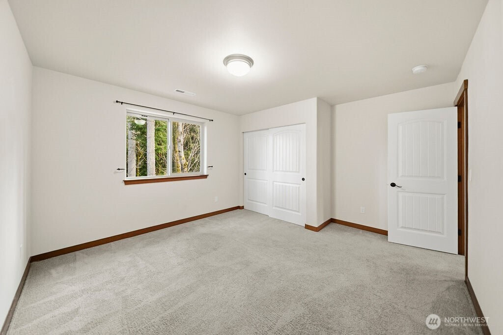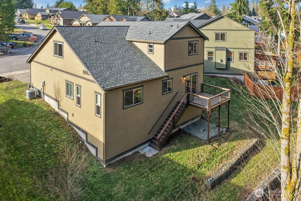 Welcome home to Poulsbo! Enjoy the spacious comfort of this two-story house offering 2,680 square feet of finished living space. Built in 2018, this home is designed for flexibility and function, featuring four bedrooms, a massive multipurpose bonus room, an office, and 2.5 bathrooms. The main-floor primary bedroom includes an ensuite with dual sinks and a soaking tub, as well as a walk-in closet. The kitchen shines with granite countertops, an ample center island, dual basin sink, a gas range, and plenty of storage space including a pantry. An open floor plan connects the dining and living areas, highlighted by both a cozy gas fireplace and beautiful views from the attached deck facing neighborhood wildlife. The first floor also incorporates a charming front office and guest bath. Upstairs provides three additional bedrooms, two of which include walk-in closets, a sprawling bonus room, and a full bath. Natural gas, air conditioning, and a two-car garage complete this inviting home in one of Poulsbo's burgeoning neighborhoods, just minutes from downtown.